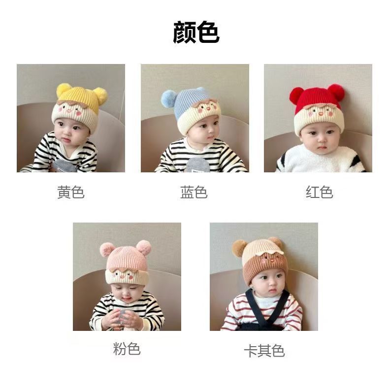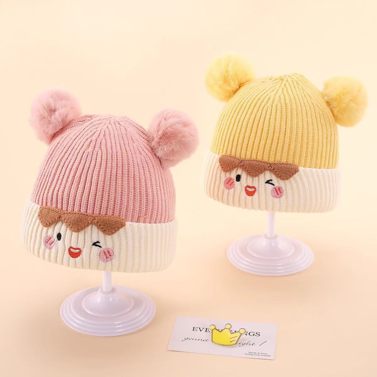 2024 새로운 겨울 어린이 모직 모자 슈퍼 귀여운 앞머리 아기 모자 색상 일치하는 더블 볼 니트 귀 보호 어린이 모자스토어 가기