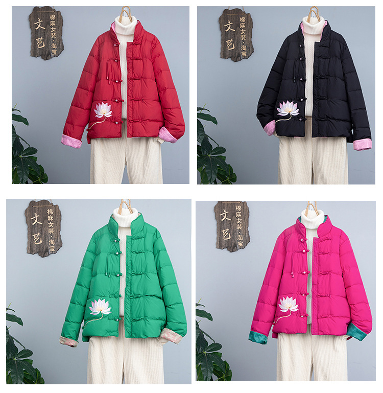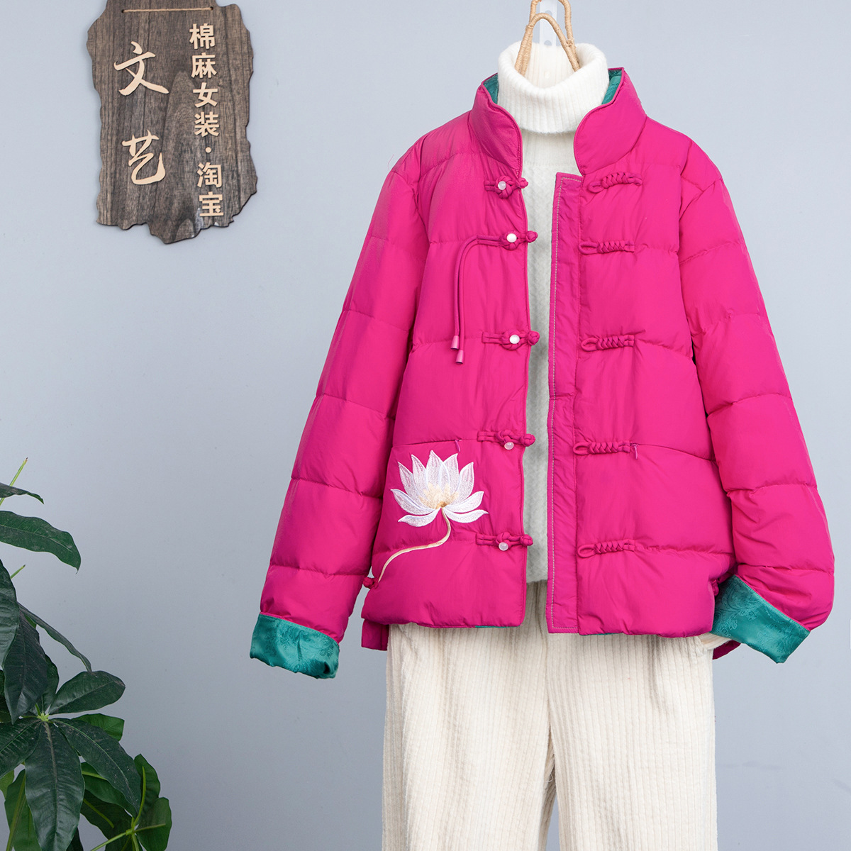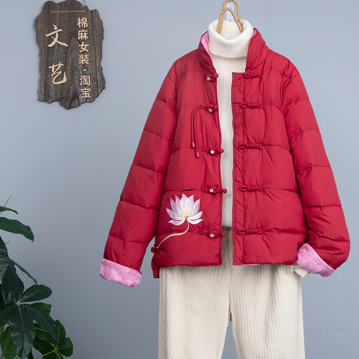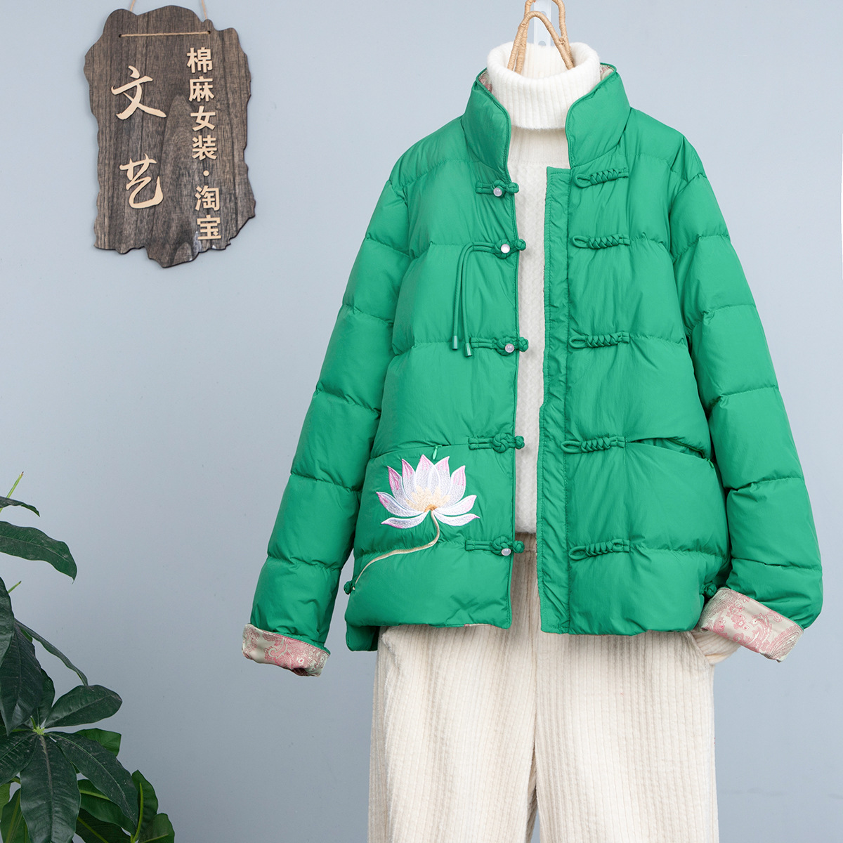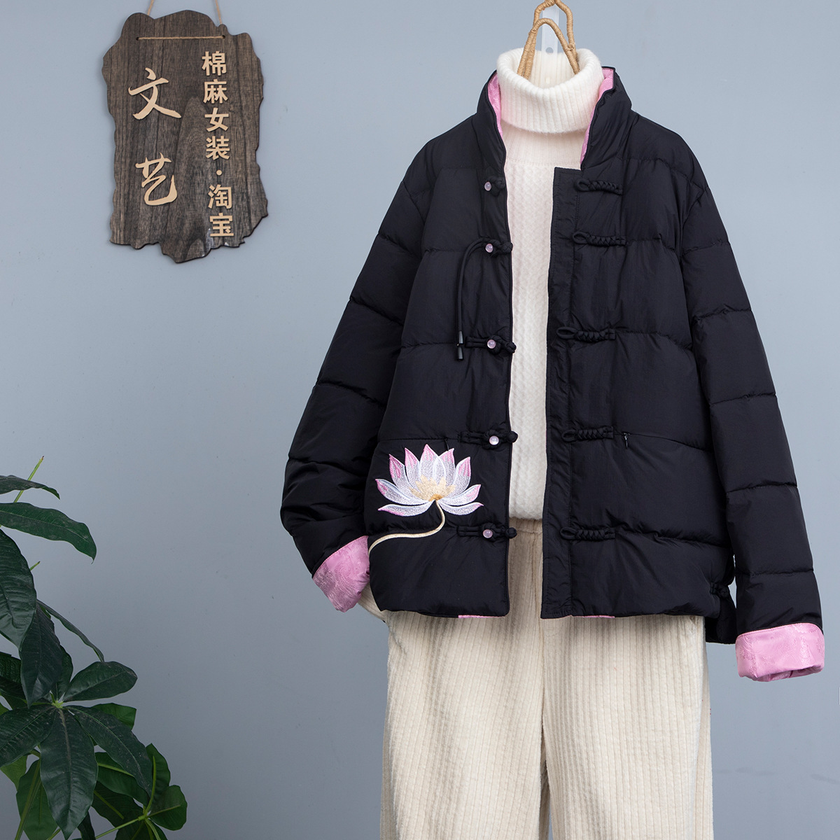 빈티지 예술적 겨울 짧은 민족 스타일 디스크 버클 자수 흰색 오리 다운 재킷 느슨한 따뜻한 유행 재킷