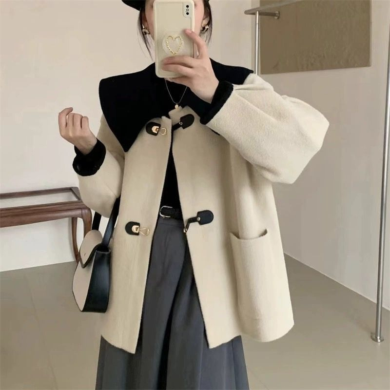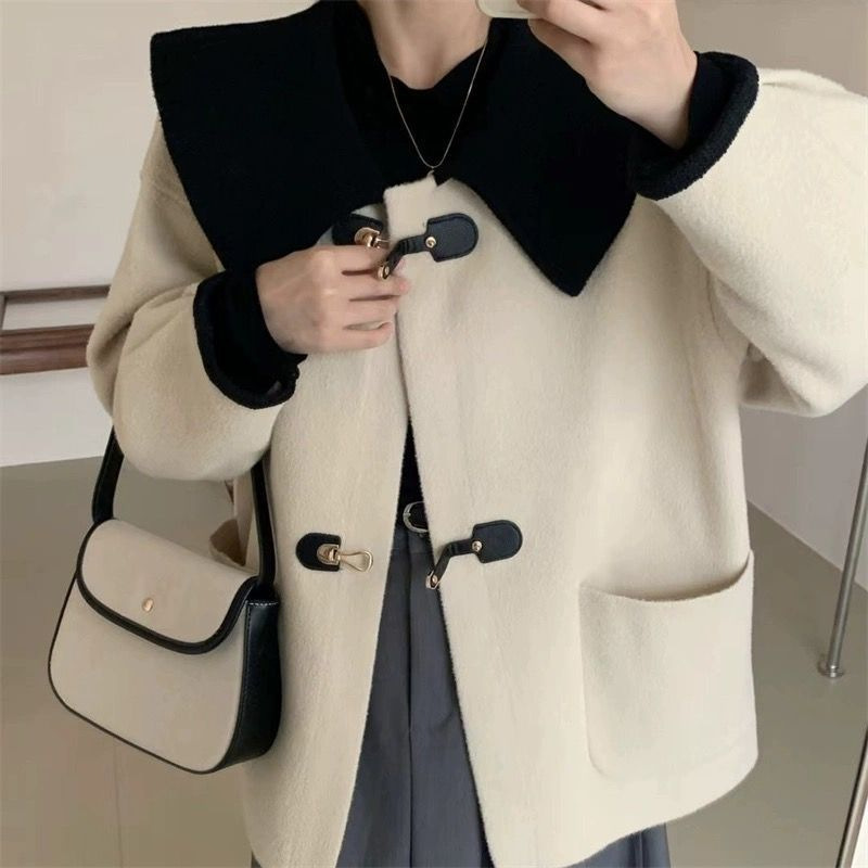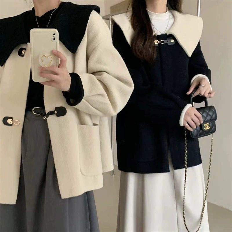 대조 컬러 인형 칼라 모직 코트 여성의 2024 가을과 겨울 새로운 디자인 느낌 옷깃 두꺼운 작은 모직 코트스토어 가기