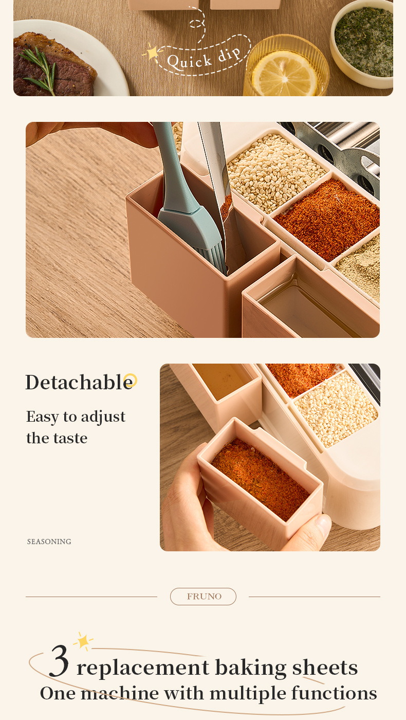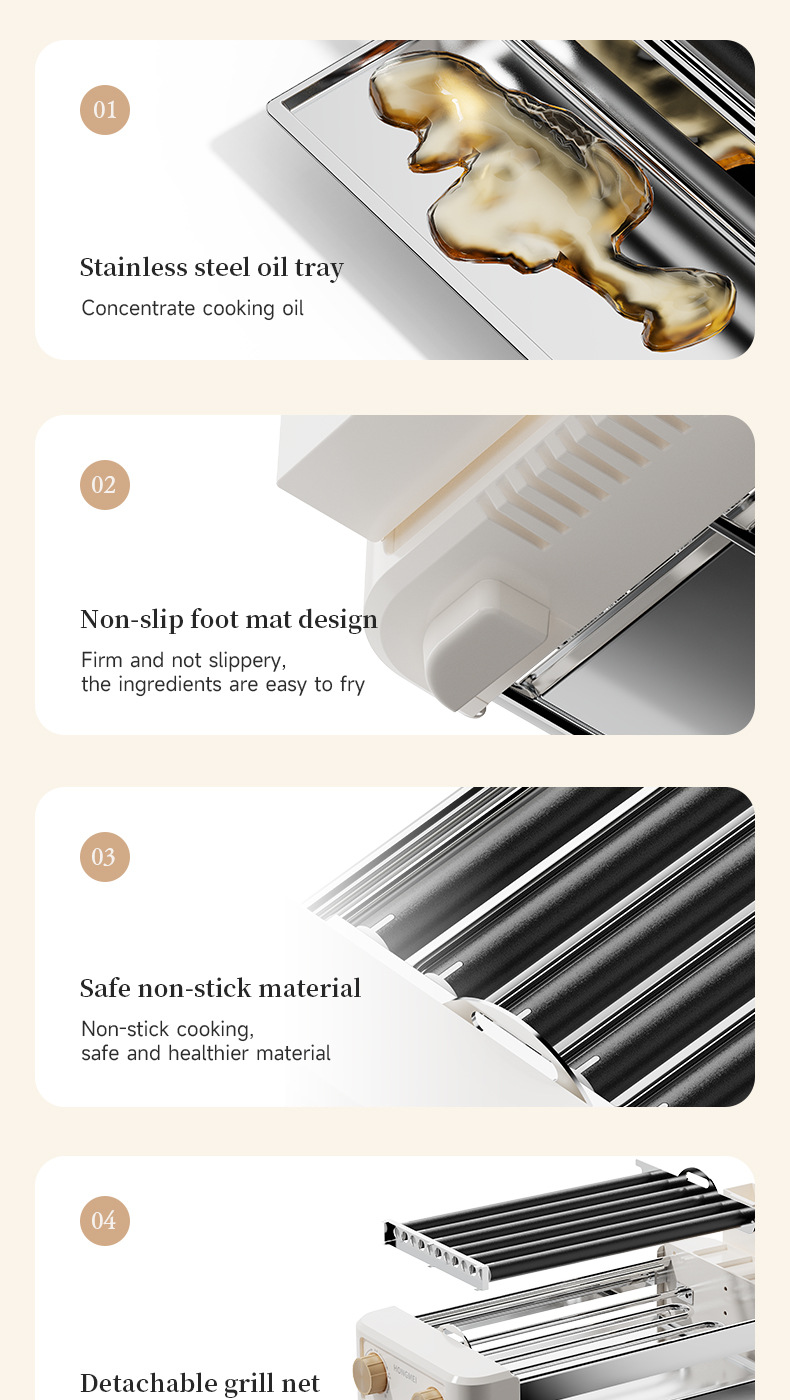 • 소시지 그릴 6개(본체에는 그릴 + 오일 트레이 + 프라이팬 + 바비큐 그릴 + 양념통 2개가 장착되어 있습니다)