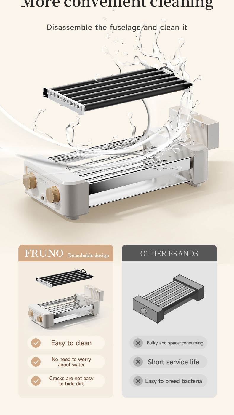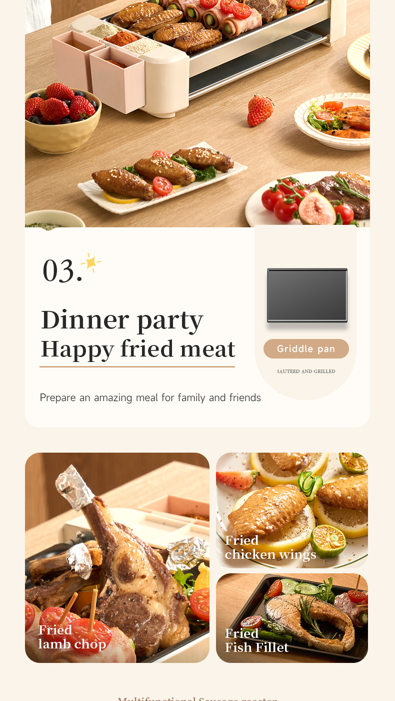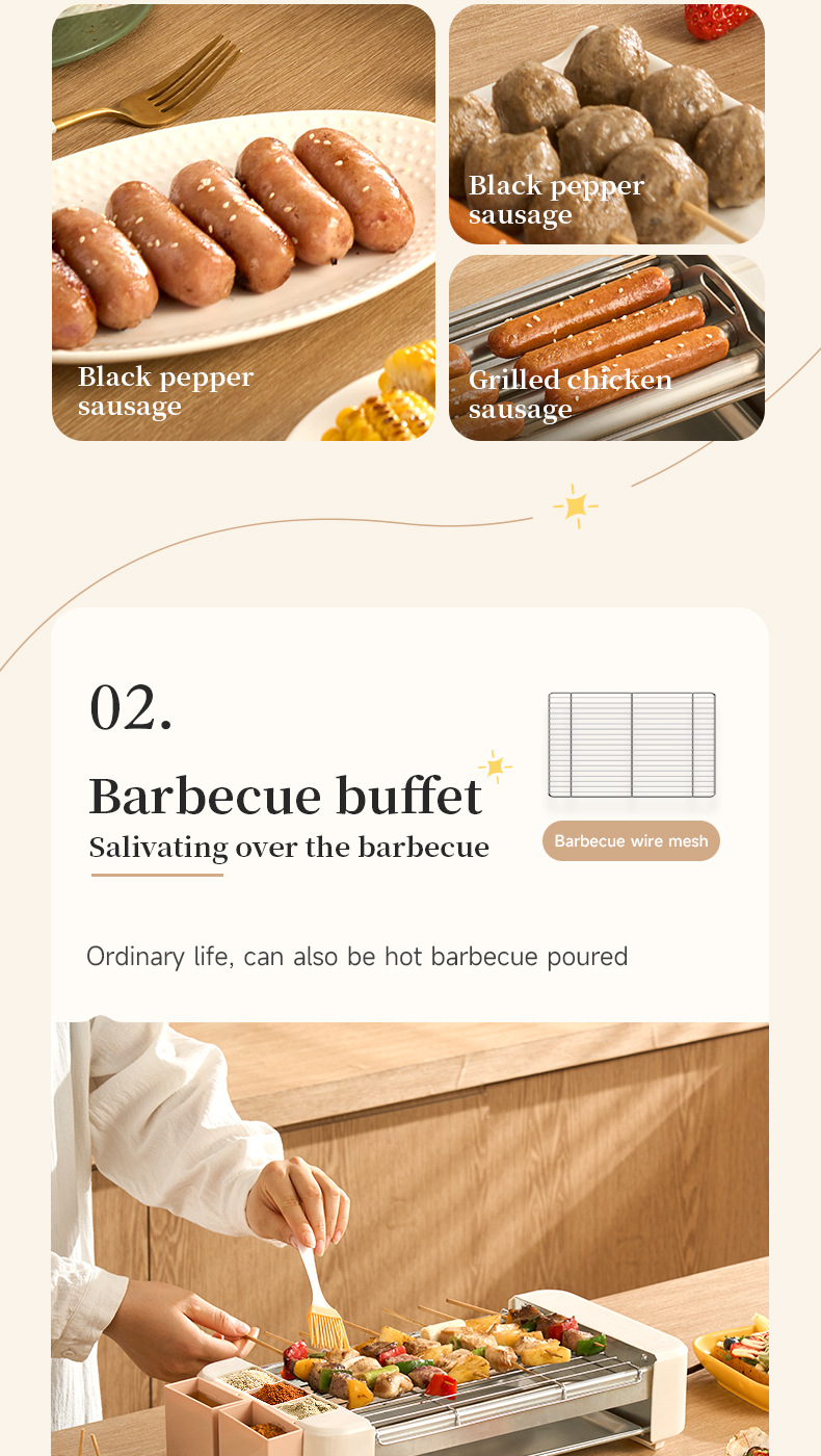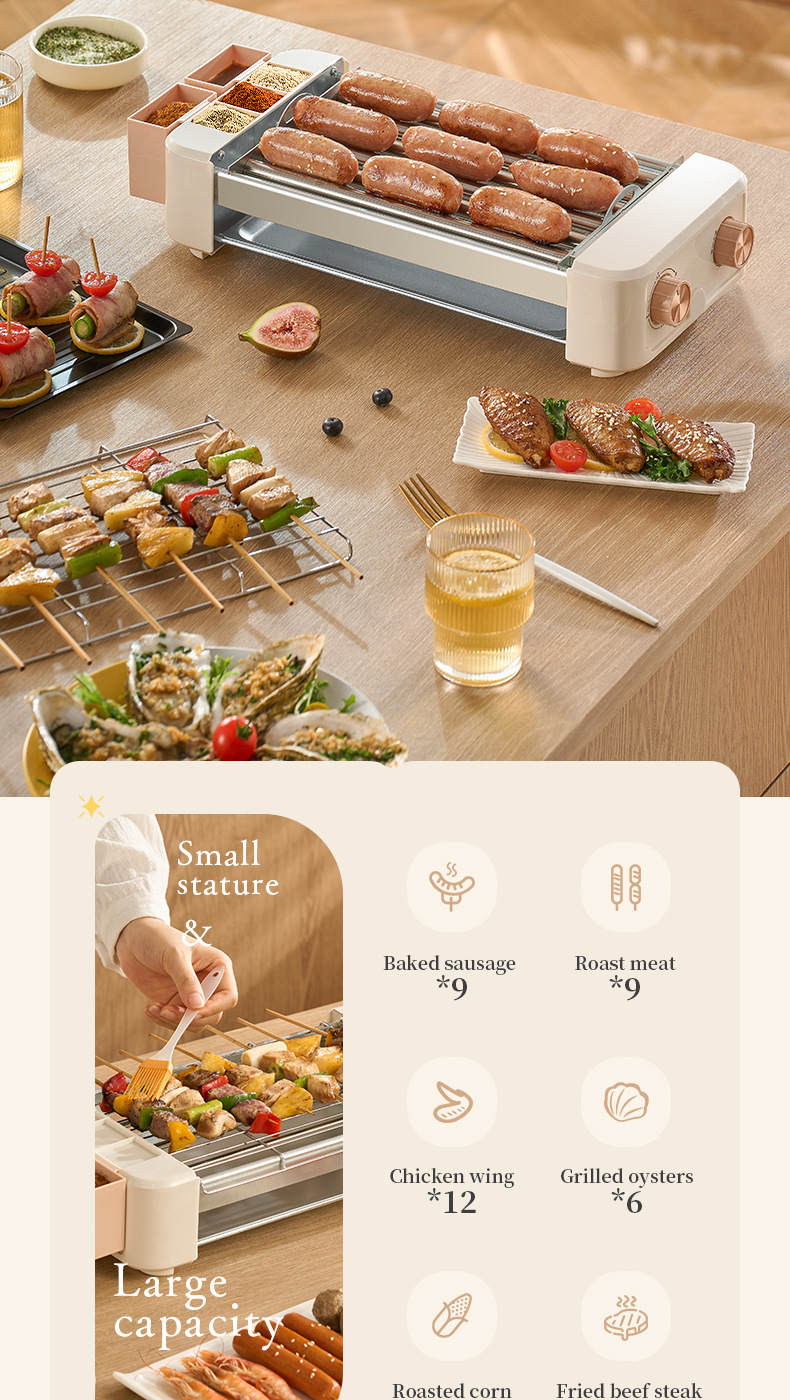 • 소시지 그릴 6개(본체에는 그릴 + 오일 트레이 + 프라이팬 + 바비큐 그릴 + 양념통 2개 + 대나무 막대기 100개가 장착되어 있습니다)