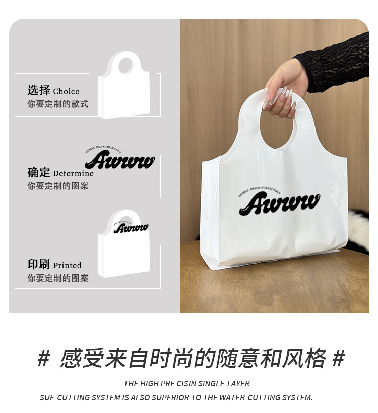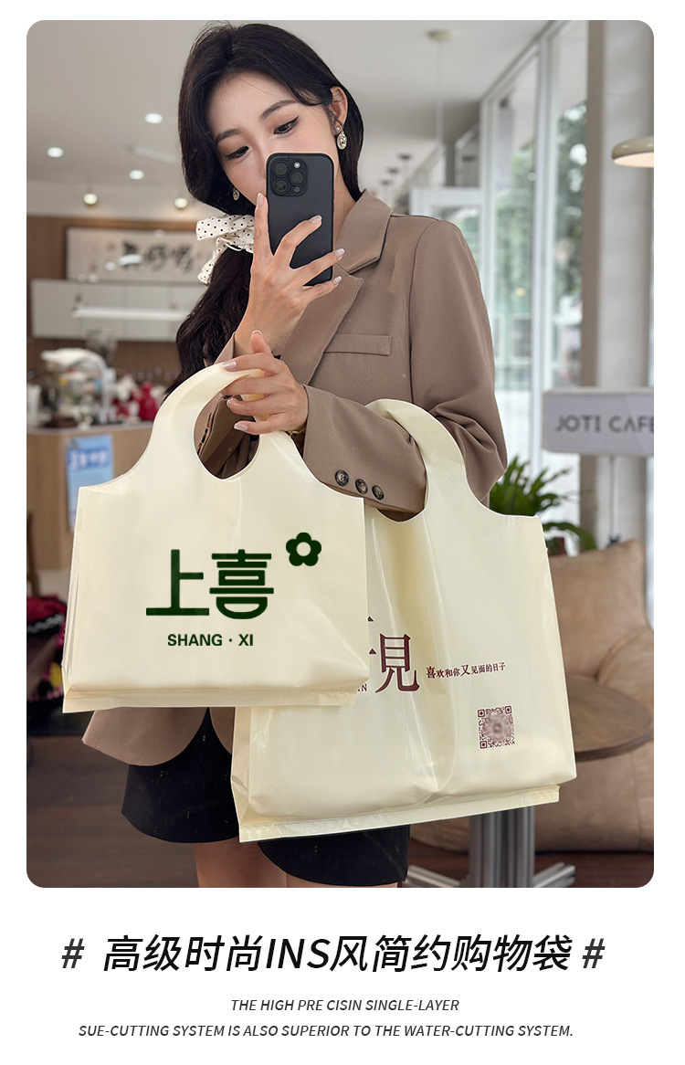심플한 고급 의류 매장 핸드백, 패셔너블한 여성 의류 및 화장품 쇼핑백, 포장백, 로고 플라스틱 백, 선물용스토어 가기