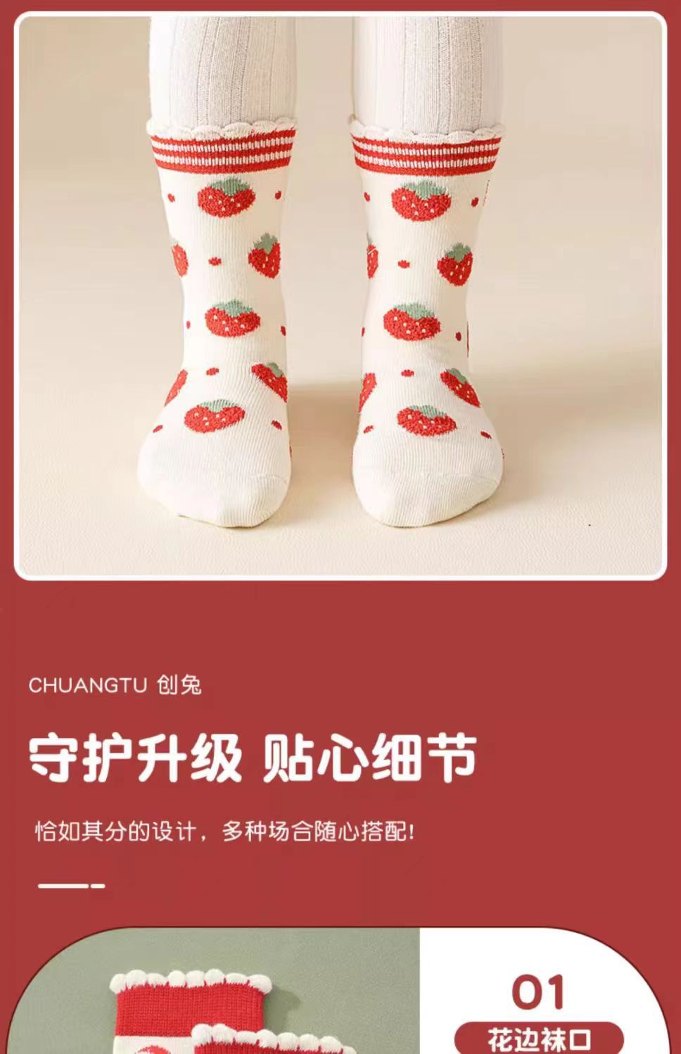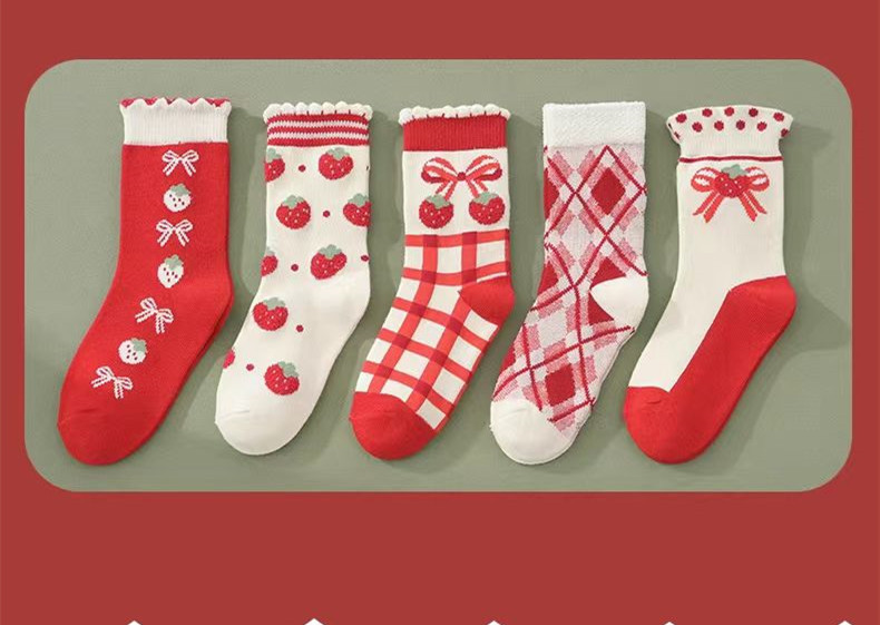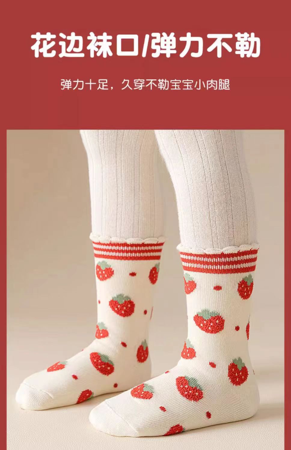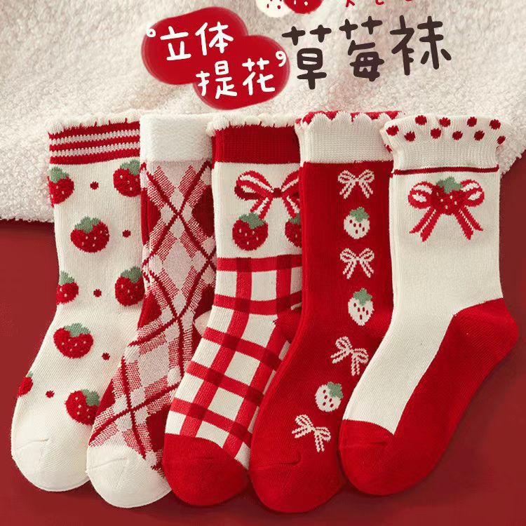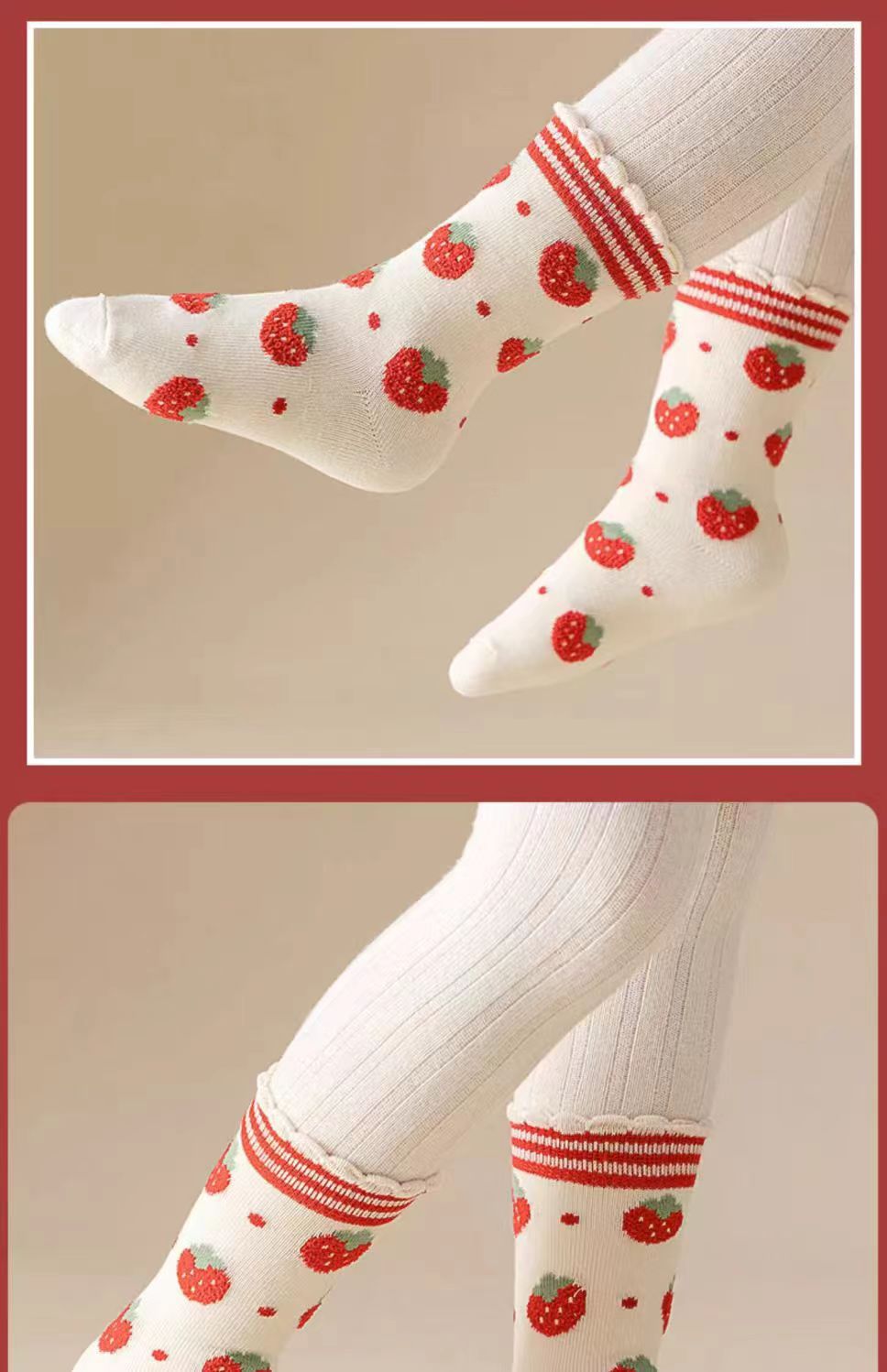 가을 겨울 아동 양말 빨간색 여자아이 중목 양말 딸기 무늬 아동 양말 여자아이 아기 양말 롱 양말 레이스 빨간 양말 도매