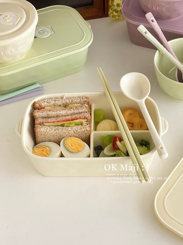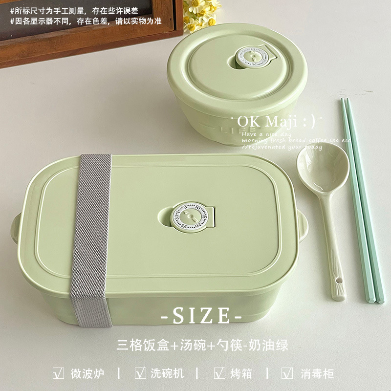 • 3칸 도시락 + 숟가락과 젓가락 - 크림 그린