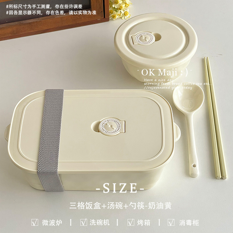 • 3칸 도시락 + 숟가락과 젓가락 - 크림색 노란색