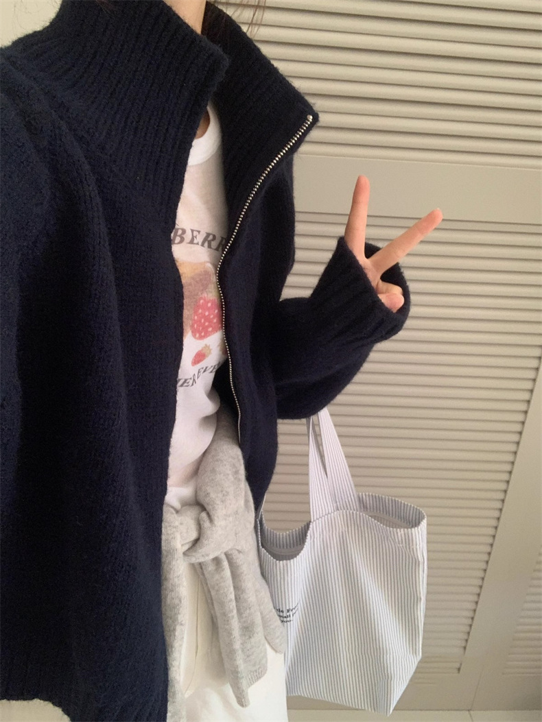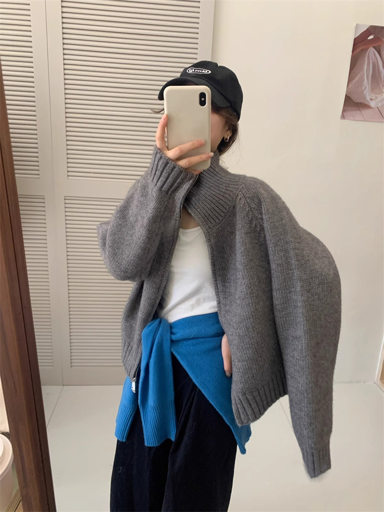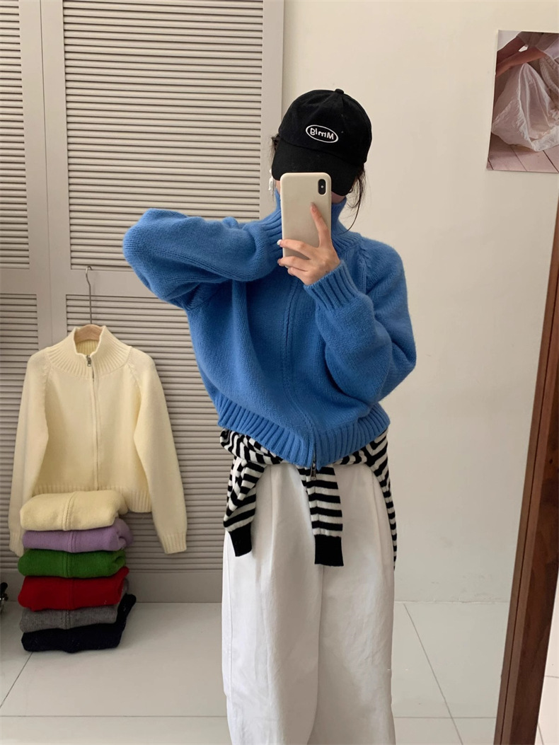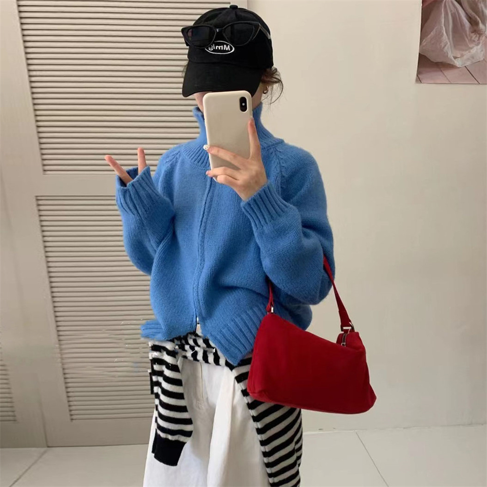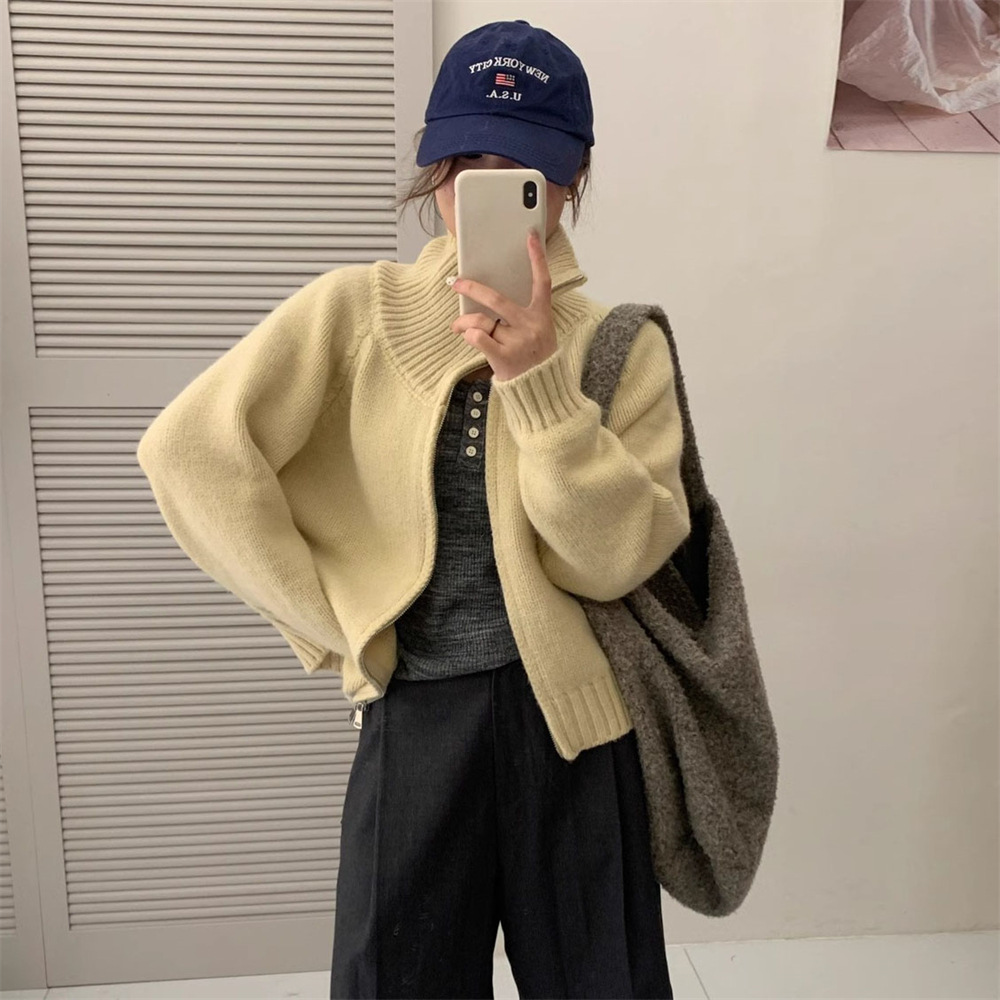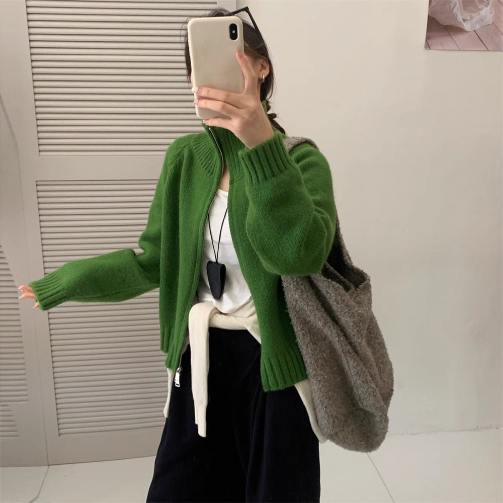 한국 스타일 단색 스탠드 칼라 디자인 스웨터 여성 카디건 가을과 겨울 새로운 부드러운 스타일 소프트 왁스 더블 지퍼 니트 자켓스토어 가기