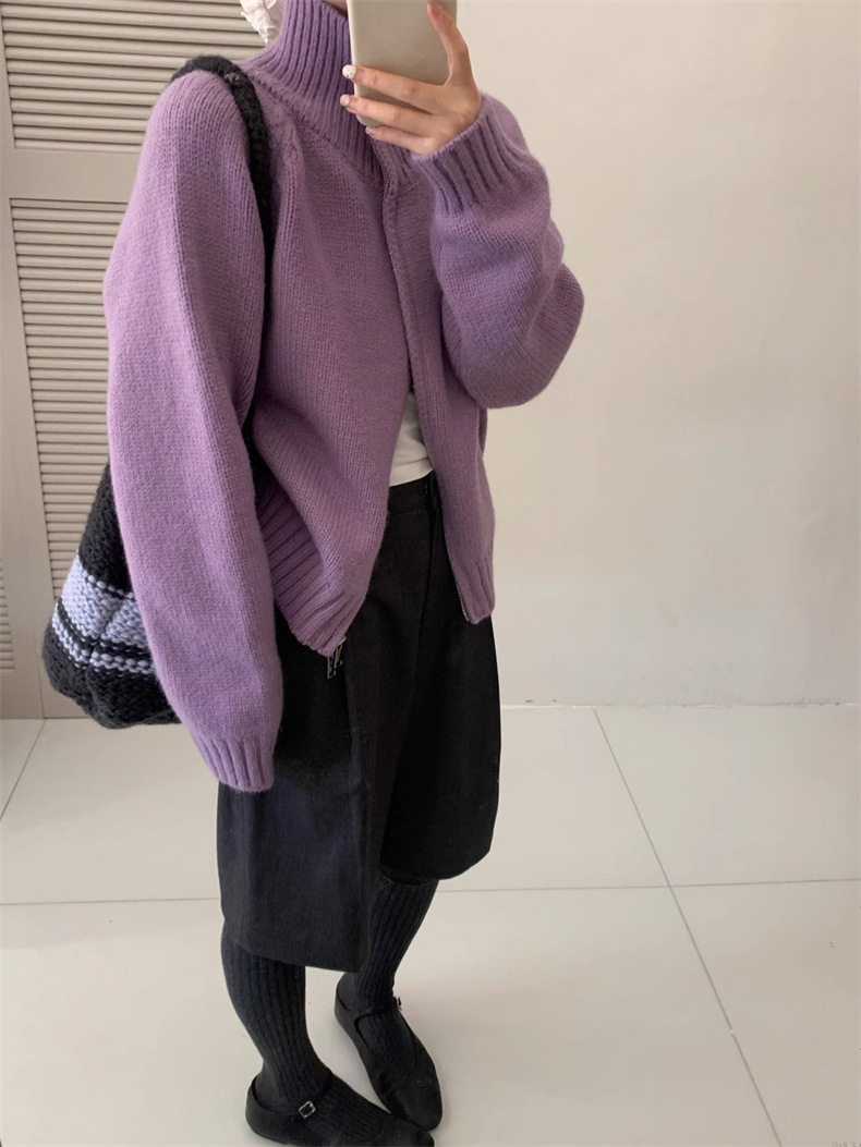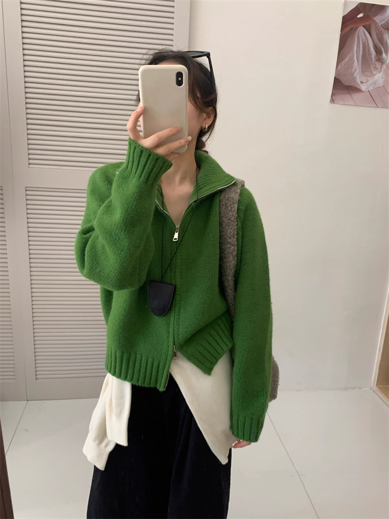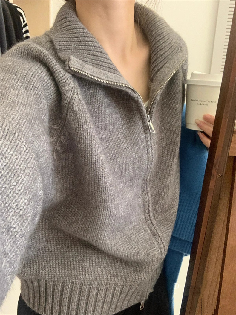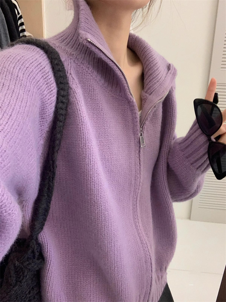 한국 스타일 단색 스탠드 칼라 디자인 스웨터 여성 카디건 가을과 겨울 새로운 부드러운 스타일 소프트 왁스 더블 지퍼 니트 자켓