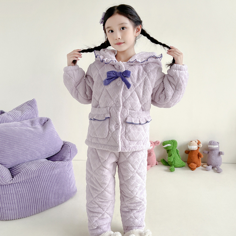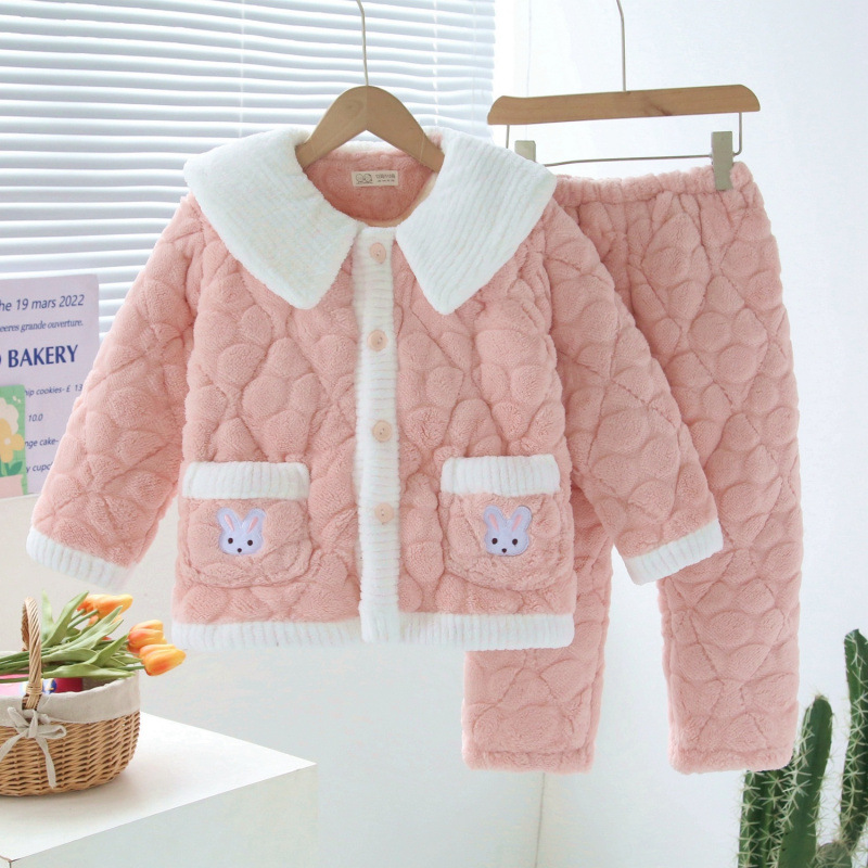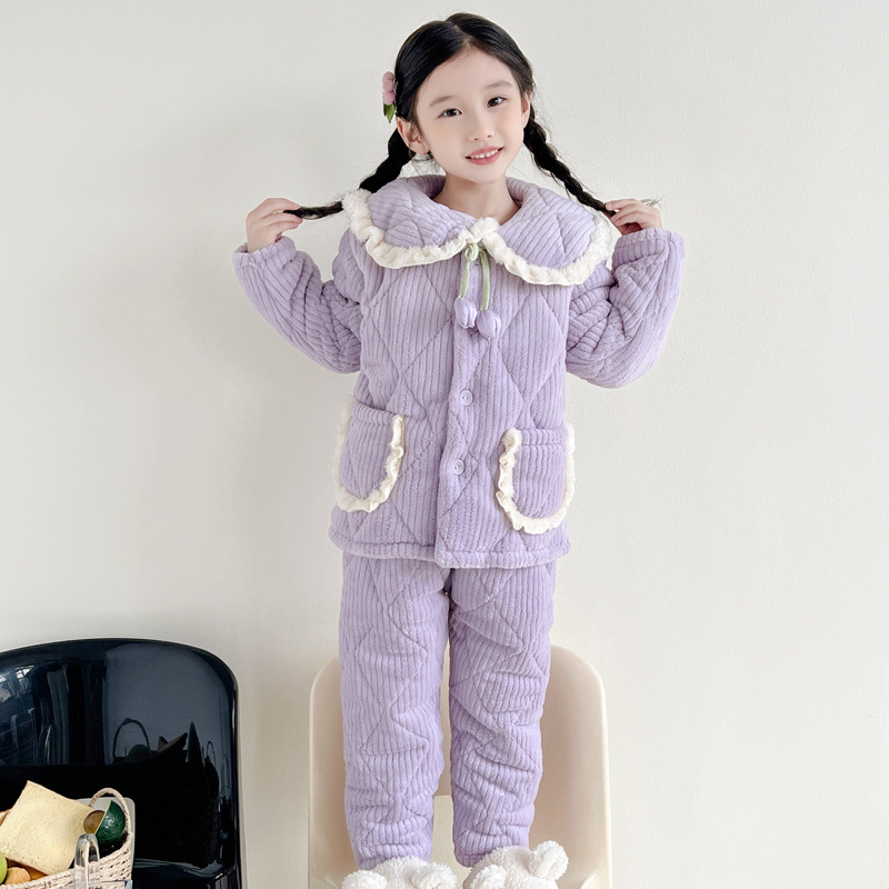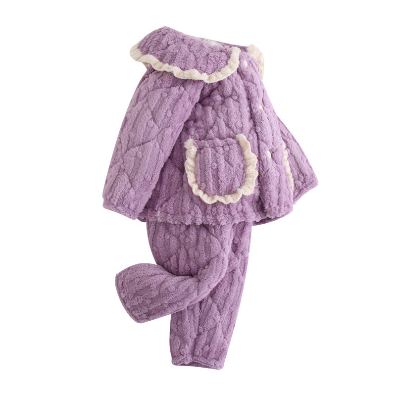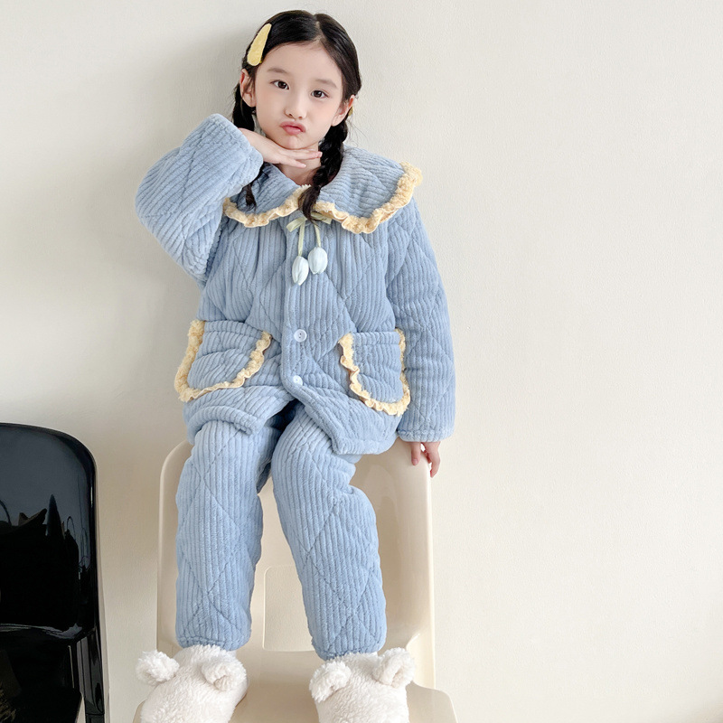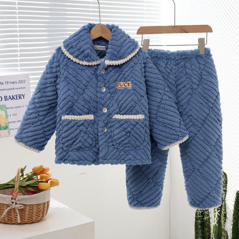 소녀와 소년을위한 겨울 어린이 3 층 퀼트 파자마 플란넬 산호 세트 아기 기모 두꺼운 홈 옷