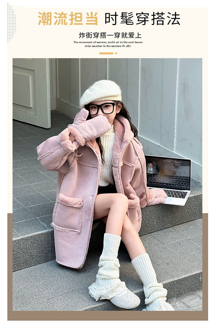 여자 기모 모피 코트 2024 겨울 새로운 한국 스타일 후드 오토바이 코트 긴 큰 아이들스토어 가기