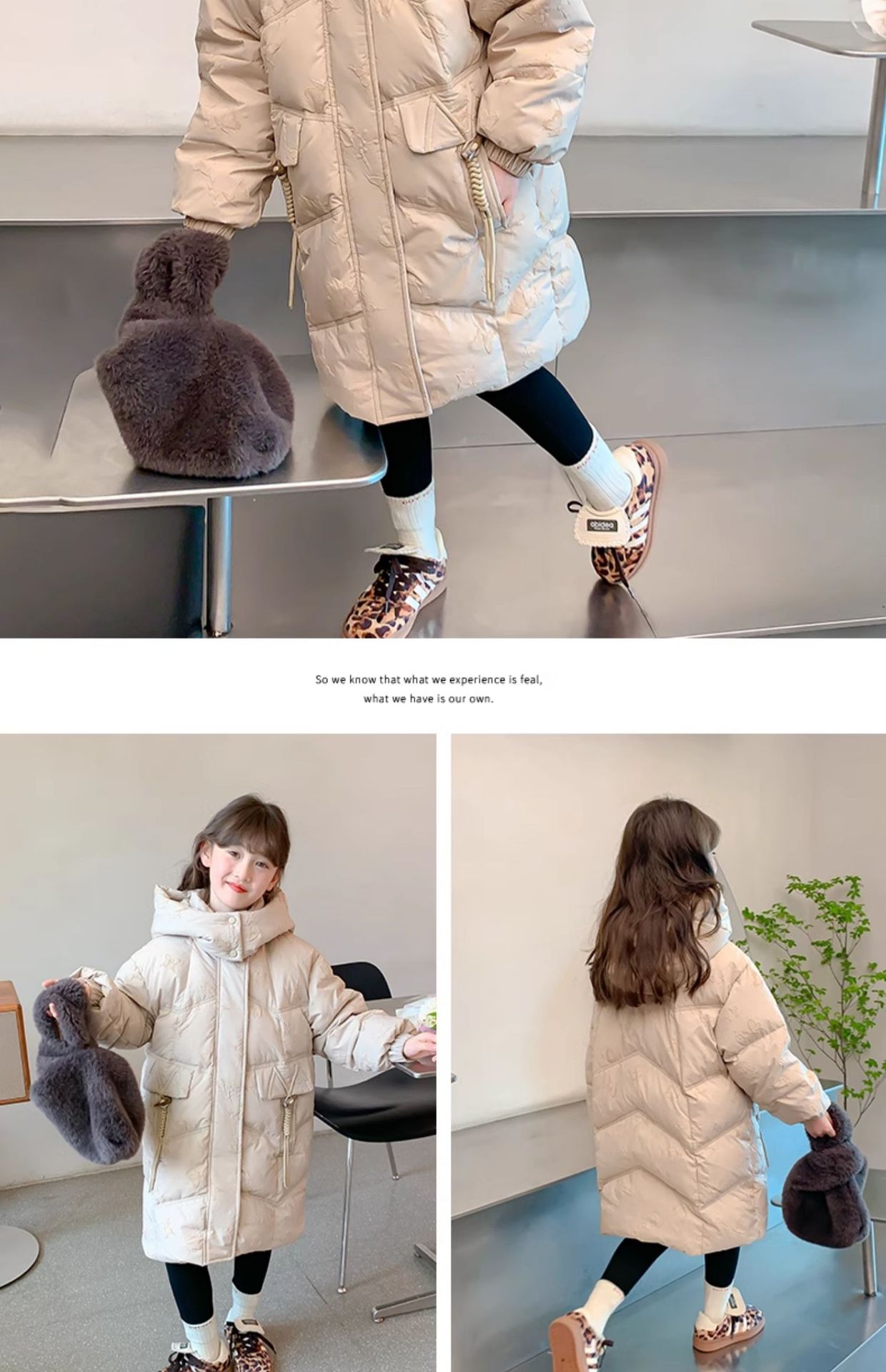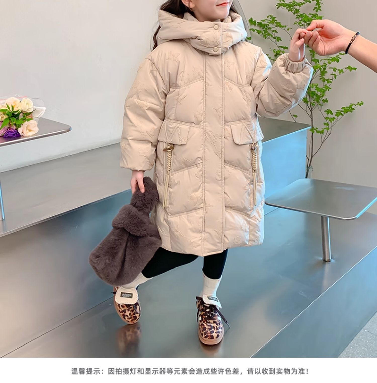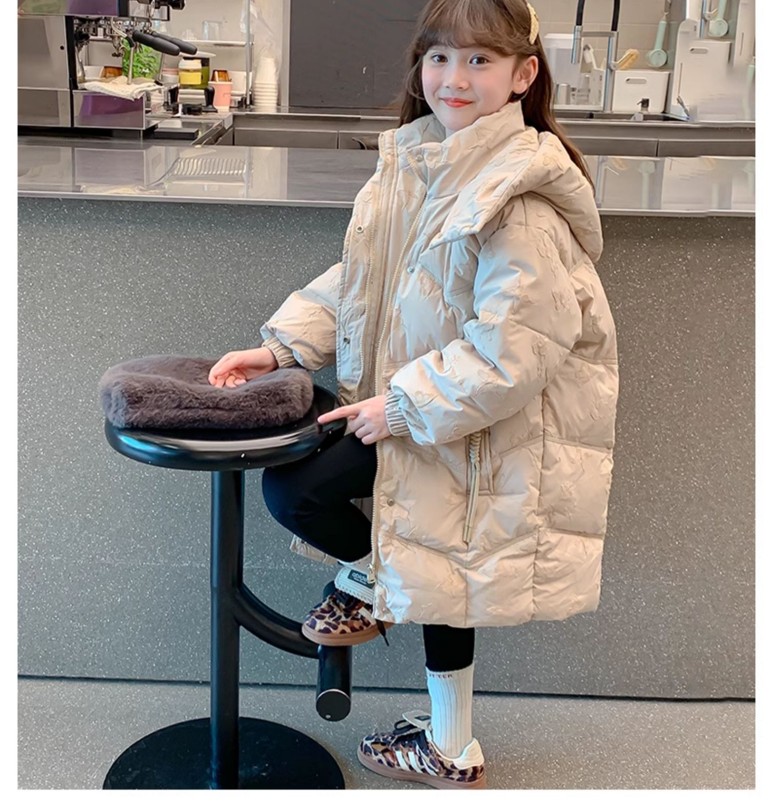 소녀 두꺼운 다운 재킷 2024 겨울 새로운 어린이 한국 스타일 따뜻한 흰색 오리 재킷 큰 어린이를위한 긴 겨울 옷스토어 가기