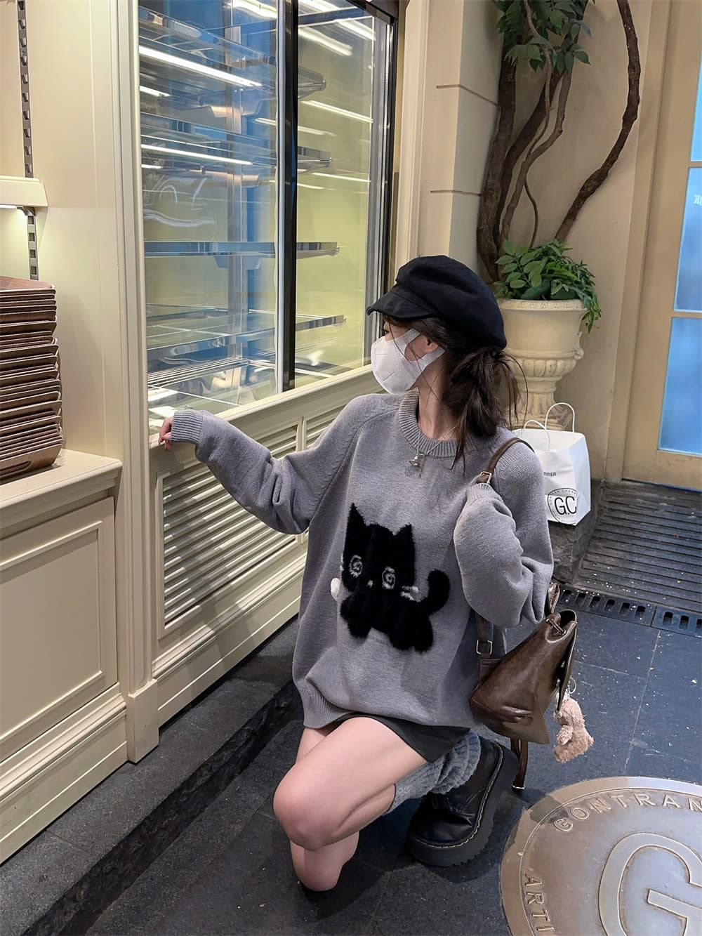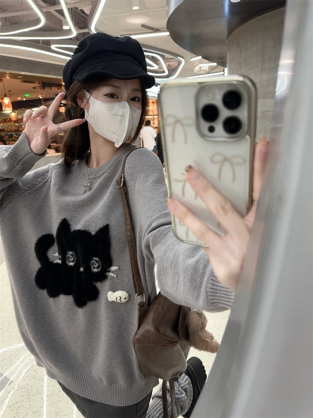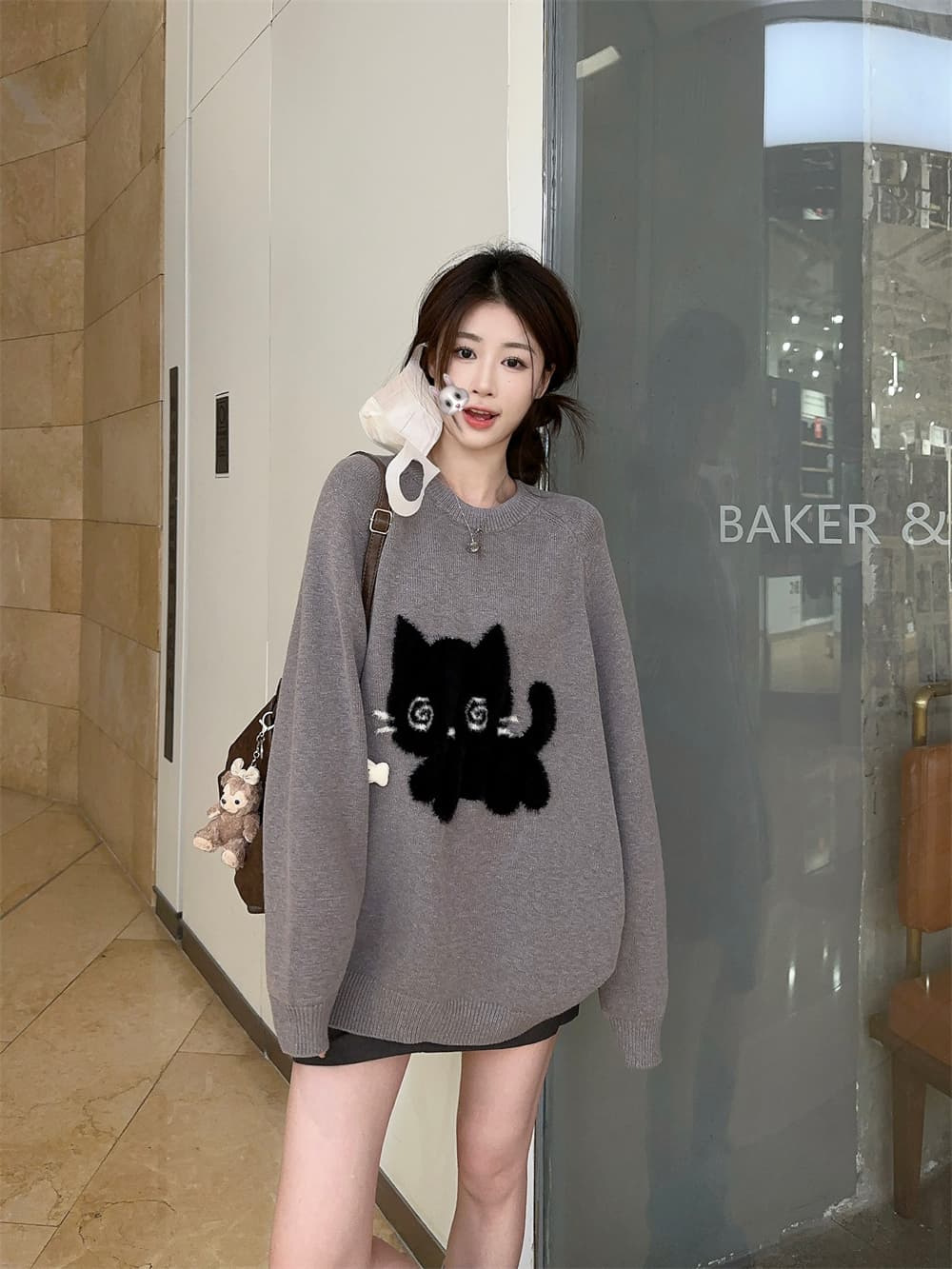 국경 간 게으른 스타일 디자인 만화 새끼 고양이 긴팔 스웨터 2024 가을과 겨울 여성을위한 새로운 중간 길이 니트 탑
