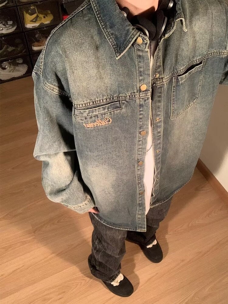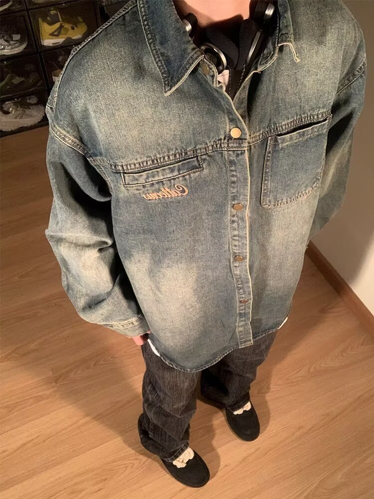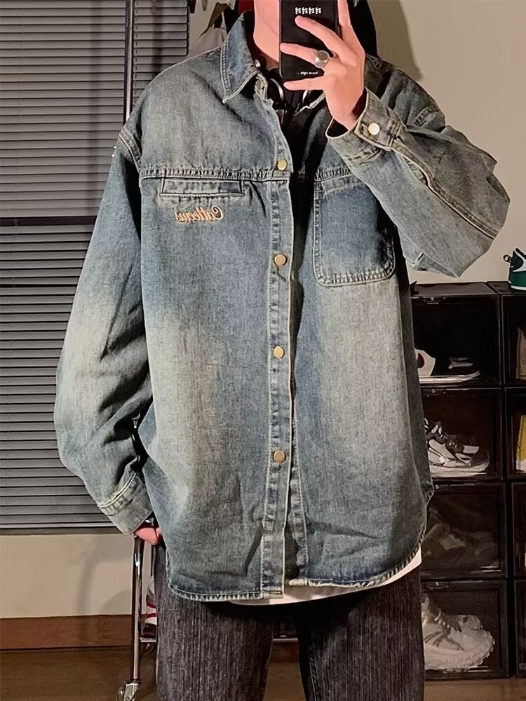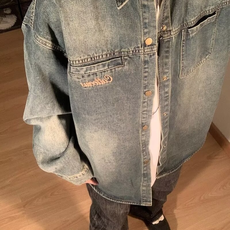 미국 스타일의 트렌디 브랜드 틈새 패션 창조적 인 구식 데님 긴팔 셔츠 재킷 옷깃 느슨한 캐주얼 셔츠 남성과 여성스토어 가기