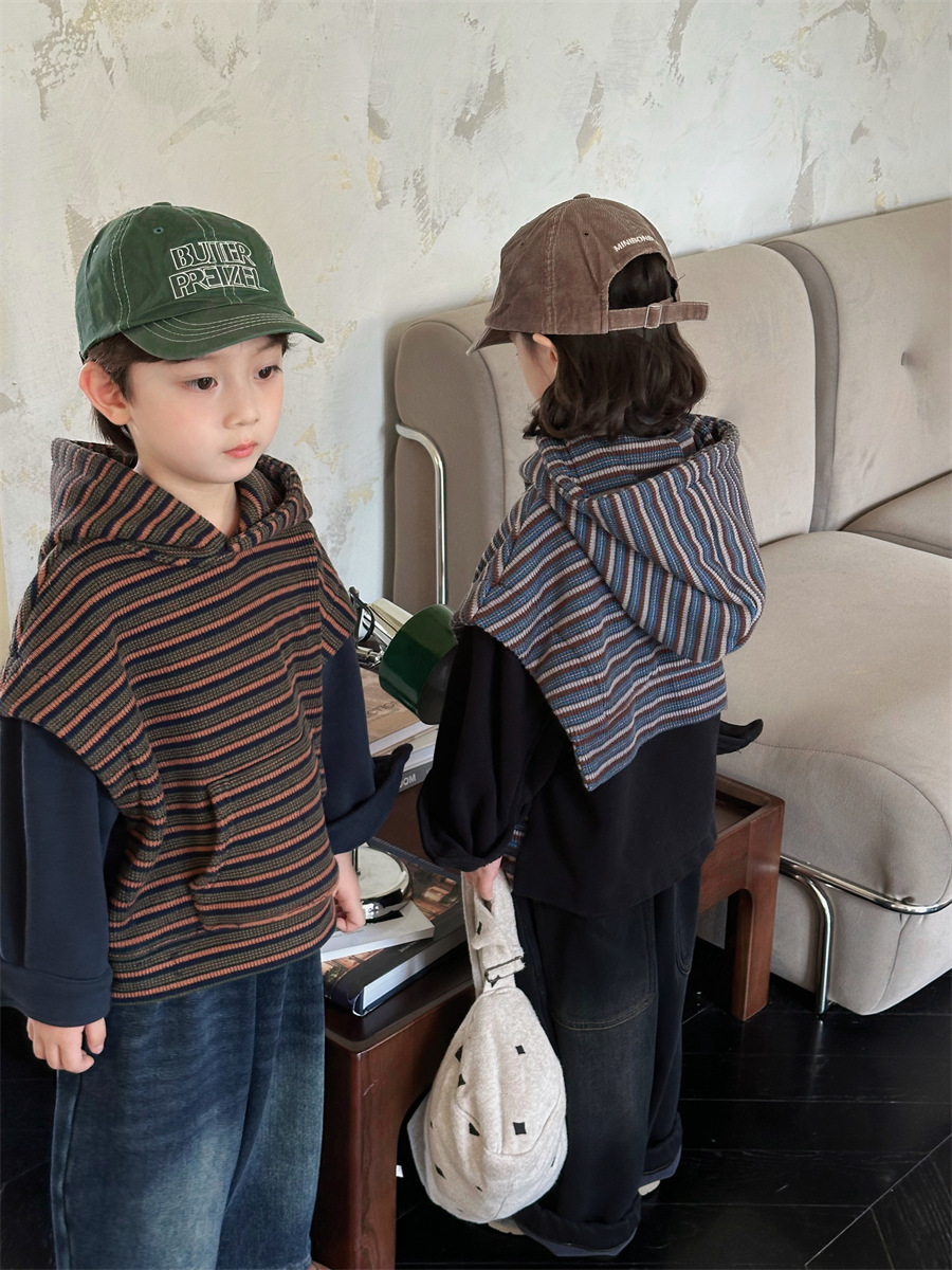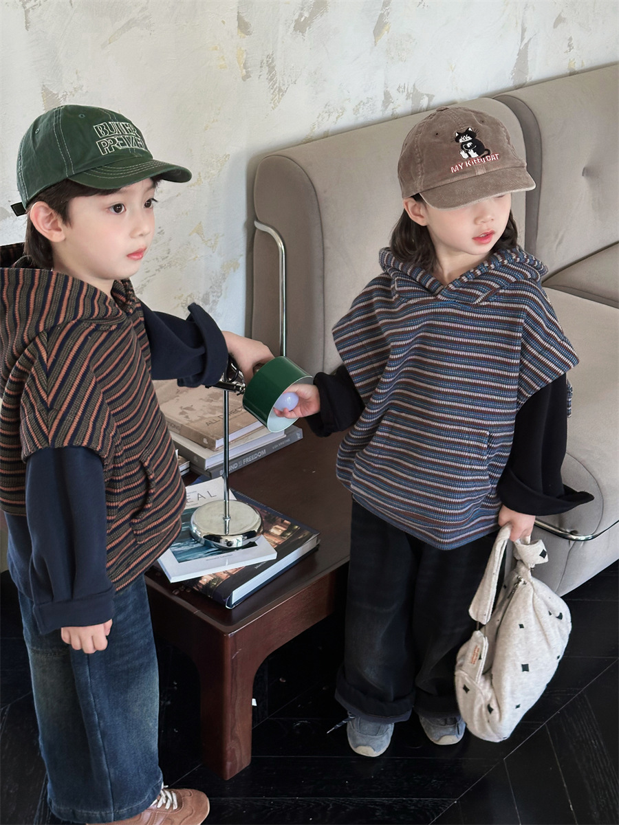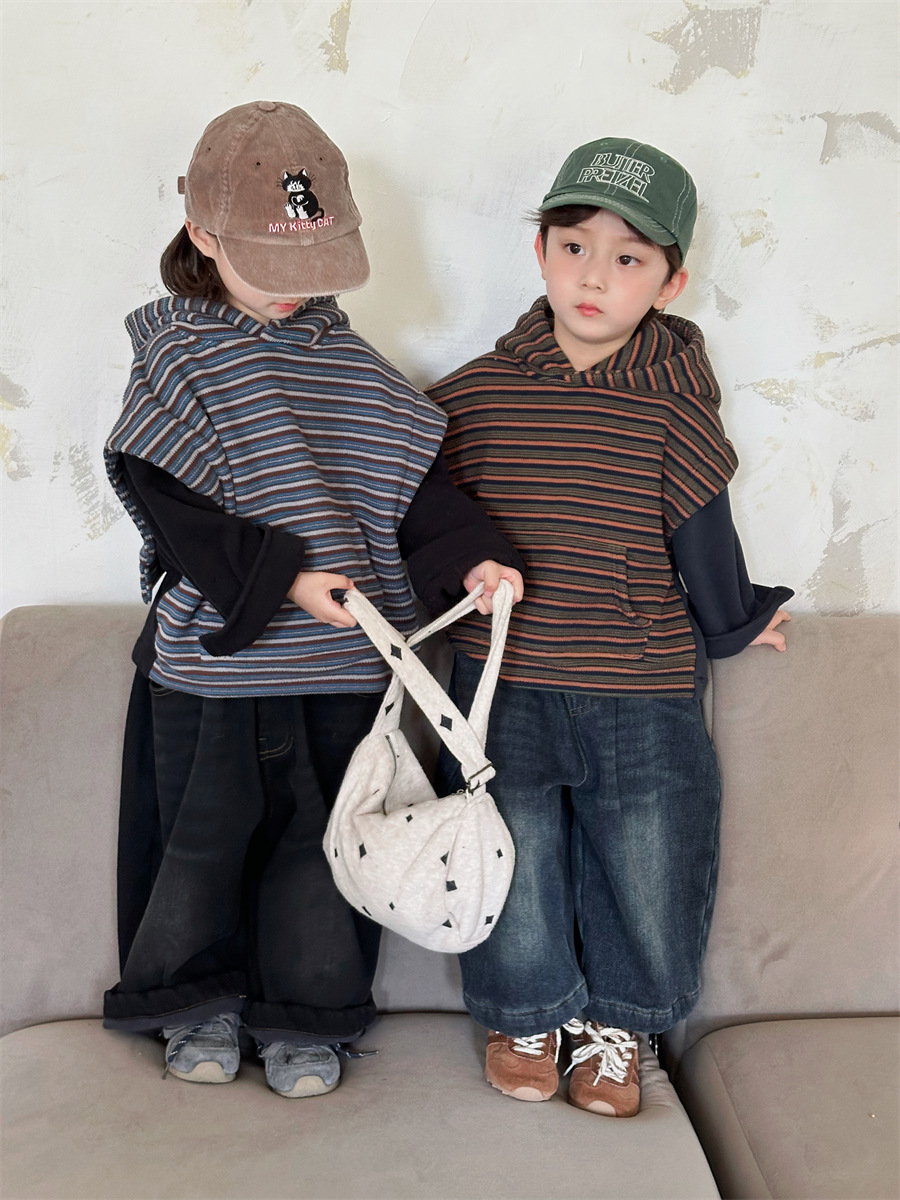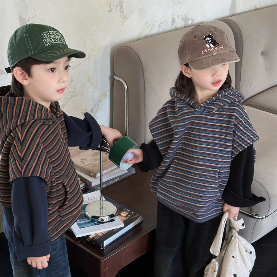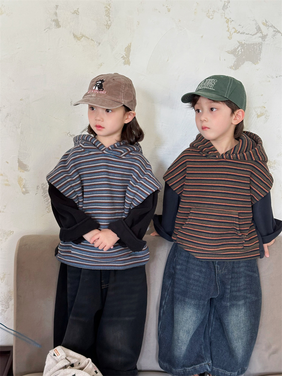 Jiaye 어린이 2024 년 어린이 겨울 줄무늬 가짜 투피스 기모 스웨터 남성과 여성의 보물과 두꺼운 외국식 후드 탑스토어 가기