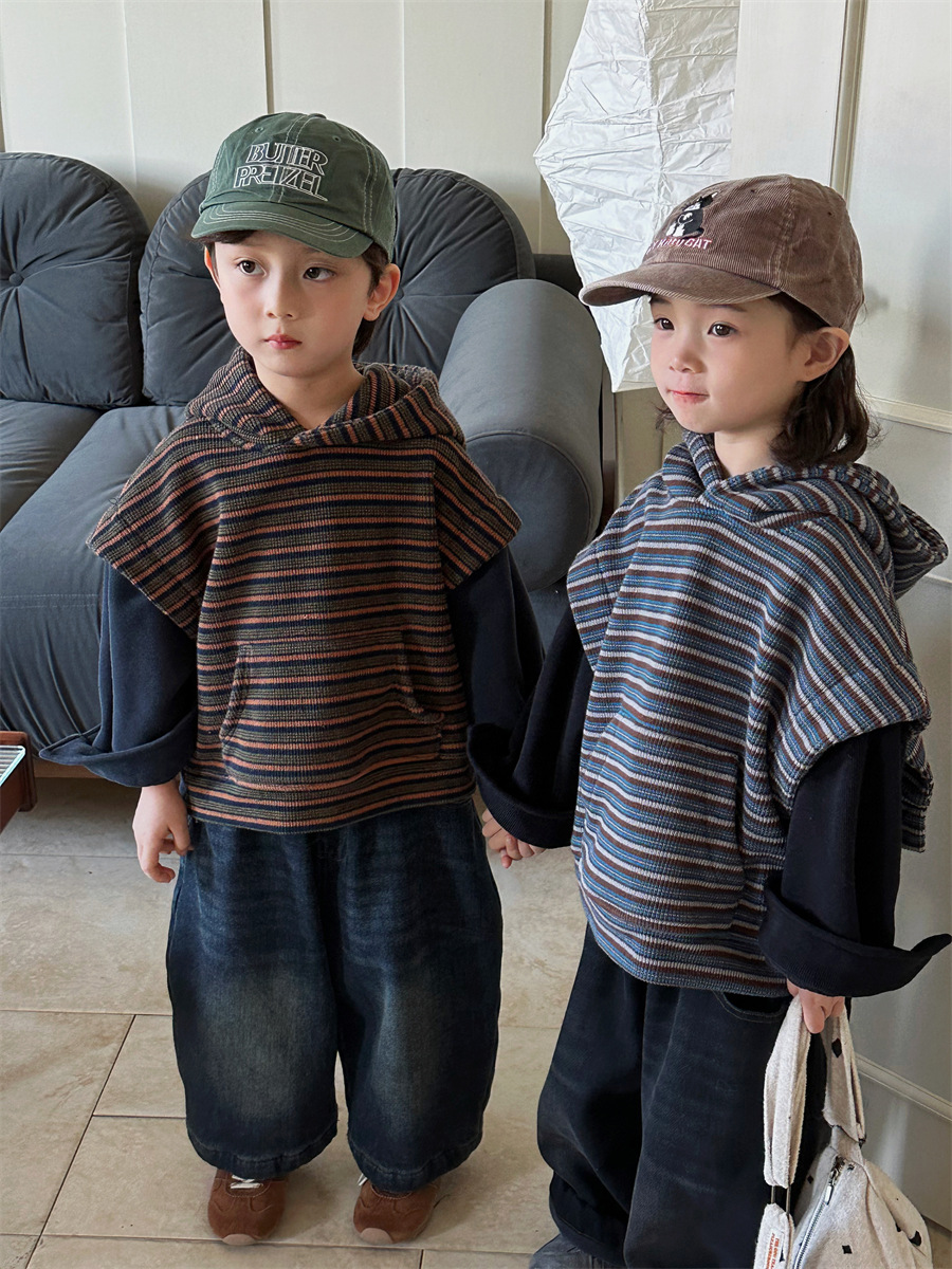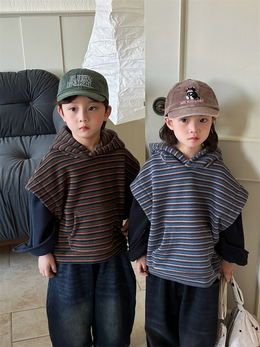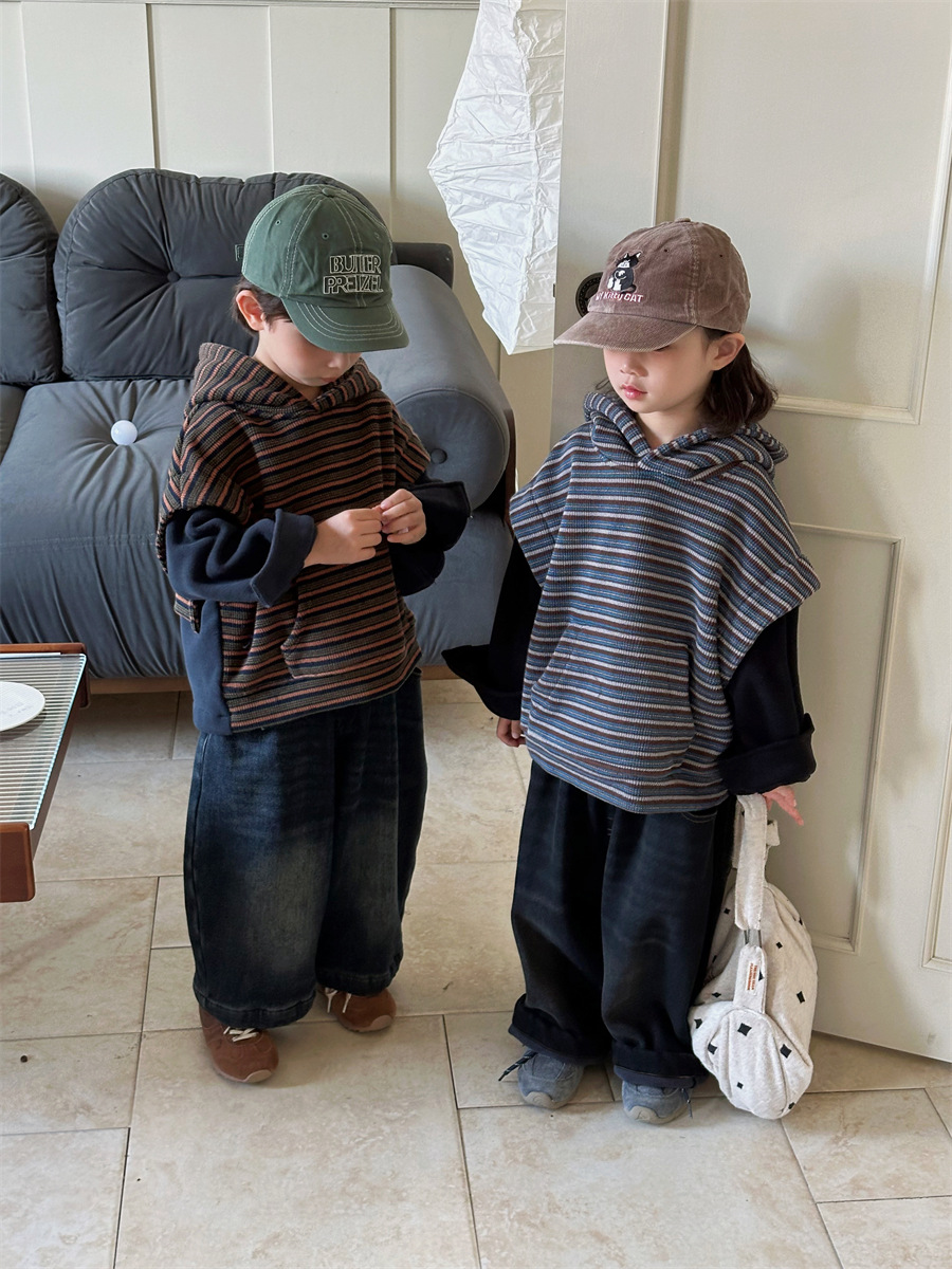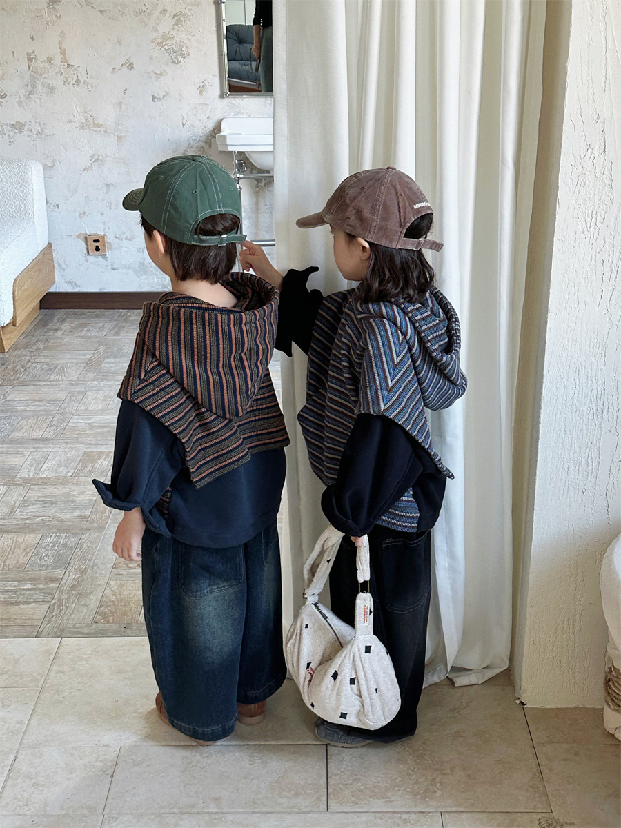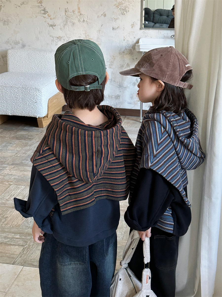 Jiaye 어린이 2024 년 어린이 겨울 줄무늬 가짜 투피스 기모 스웨터 남성과 여성의 보물과 두꺼운 외국식 후드 탑스토어 가기