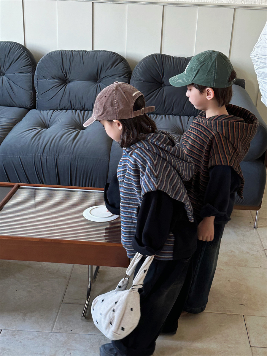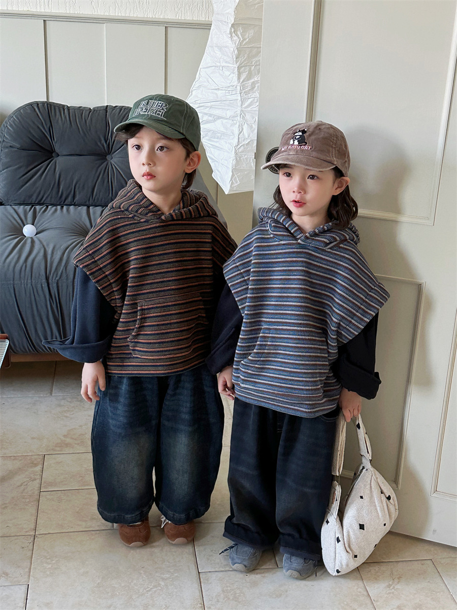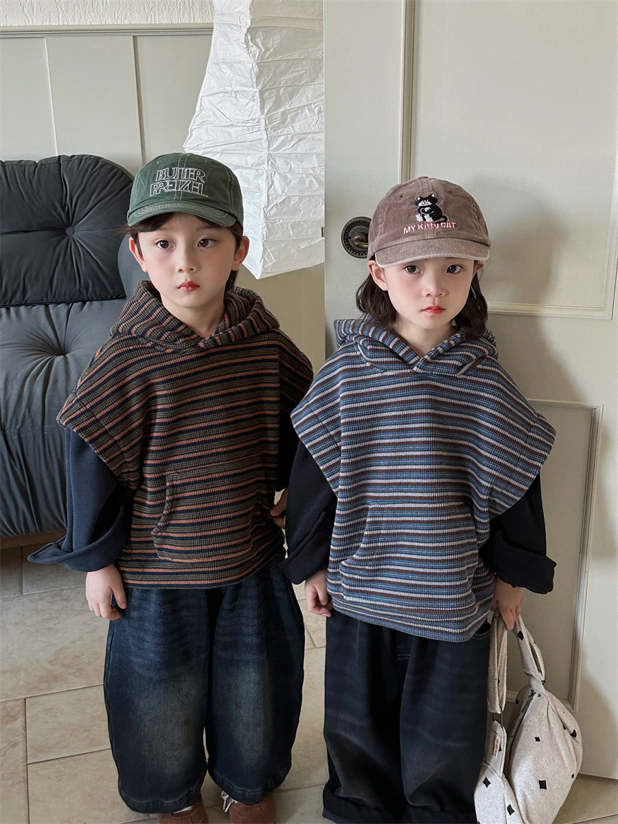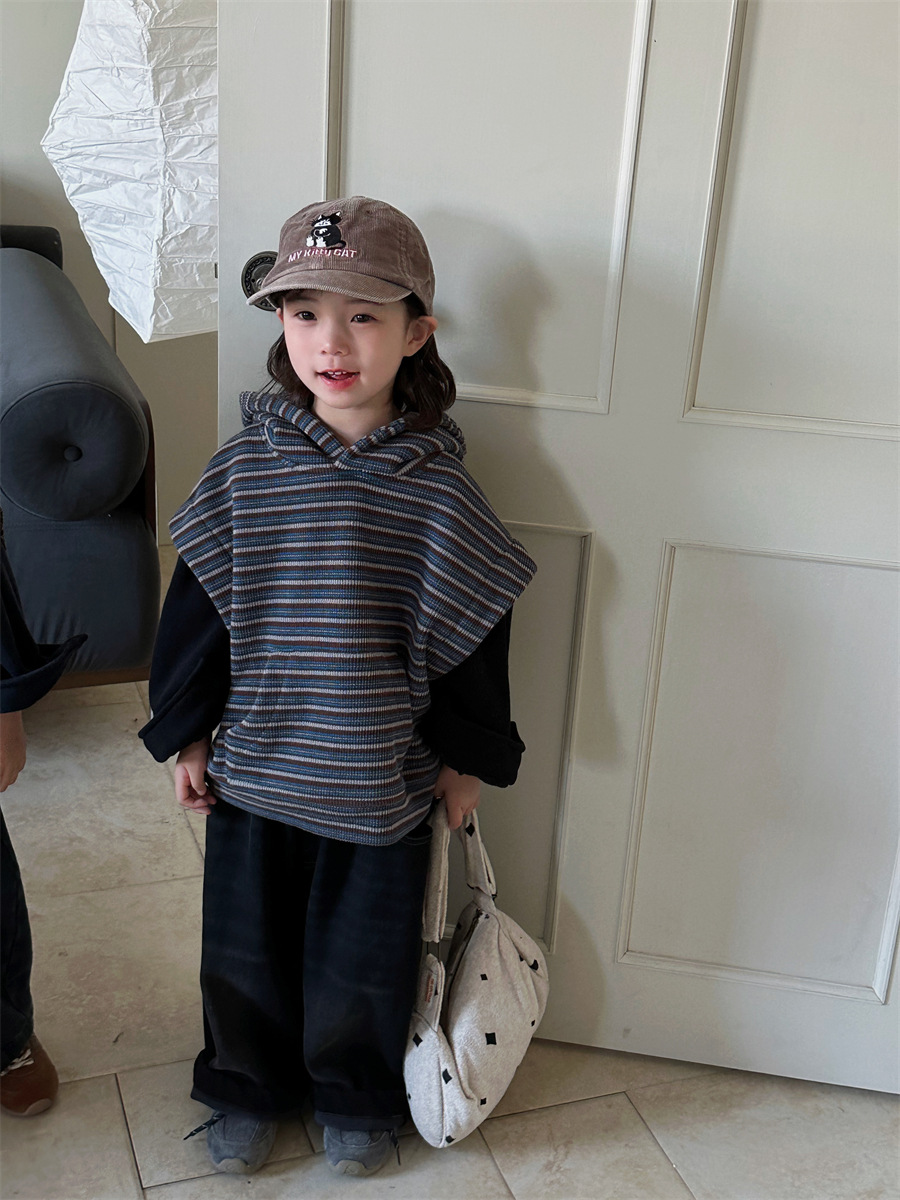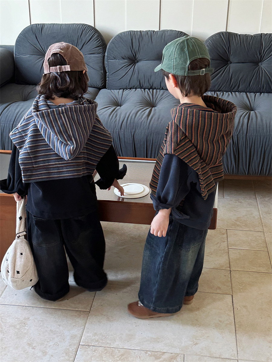 Jiaye 어린이 2024 년 어린이 겨울 줄무늬 가짜 투피스 기모 스웨터 남성과 여성의 보물과 두꺼운 외국식 후드 탑스토어 가기