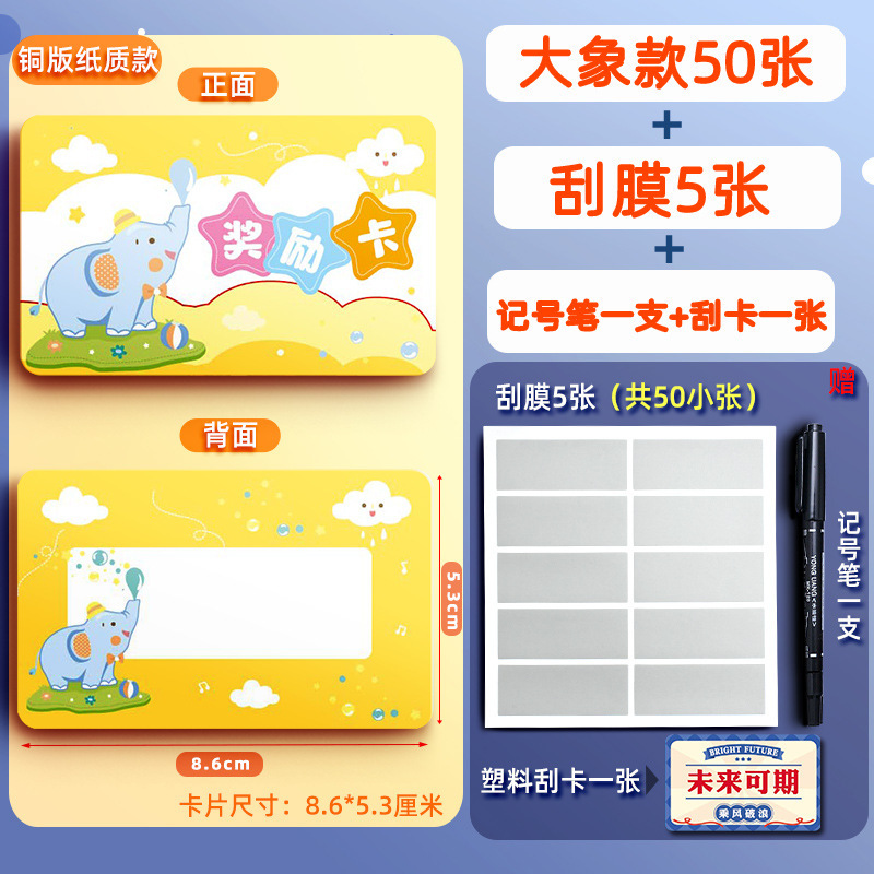 • [종이 50매] 스크래치 보상 카드 - 코끼리 (무료 스크래치 카드 + 마커)