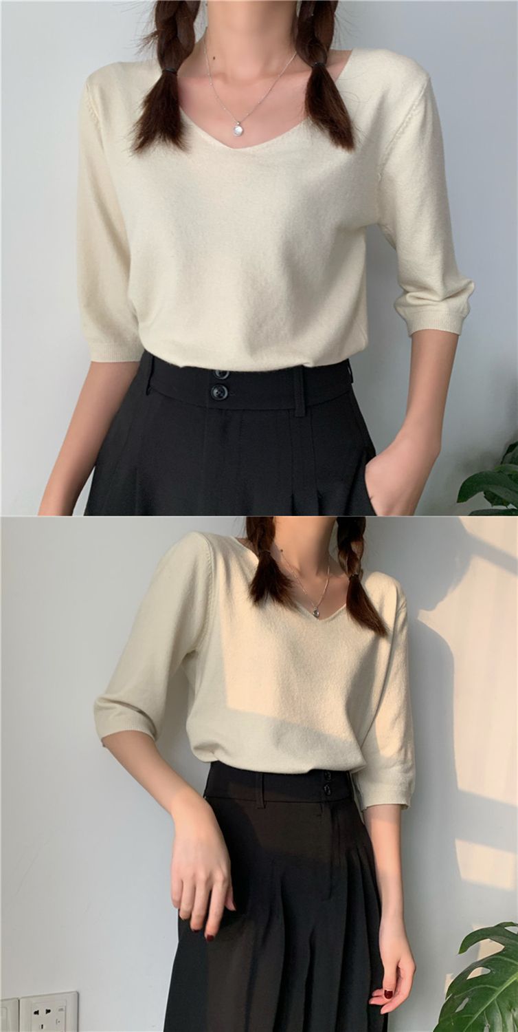 봄과 여름 한국의 새로운 세련된 외국 스타일의 흰색 올 매치 니트 V 넥 아이스크림 실크 반팔 티셔츠 탑 레이 레드스토어 가기
