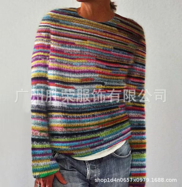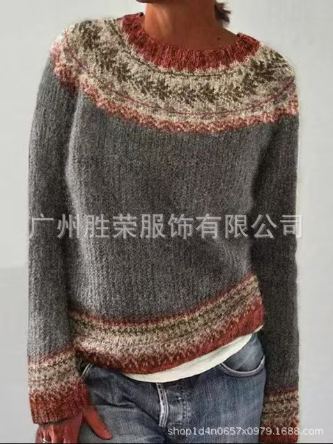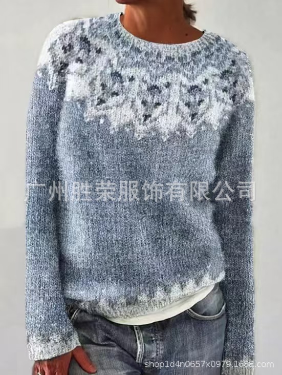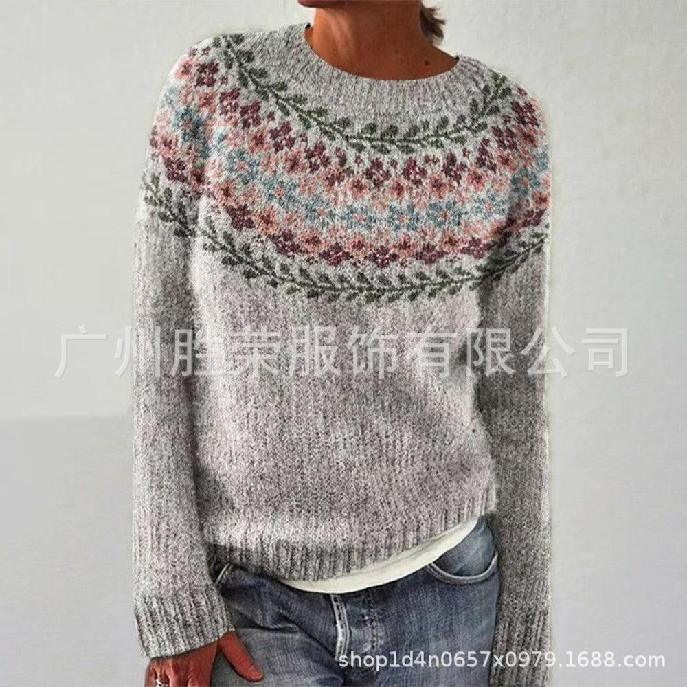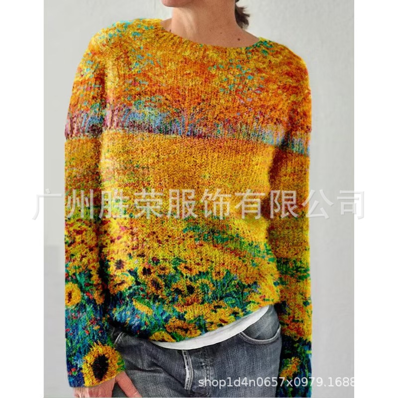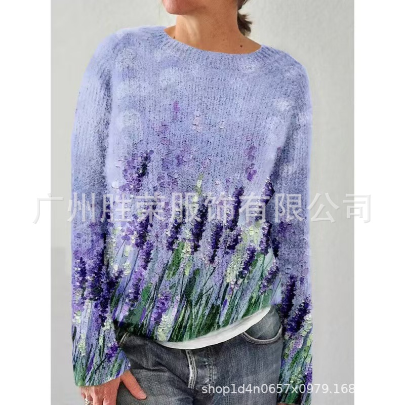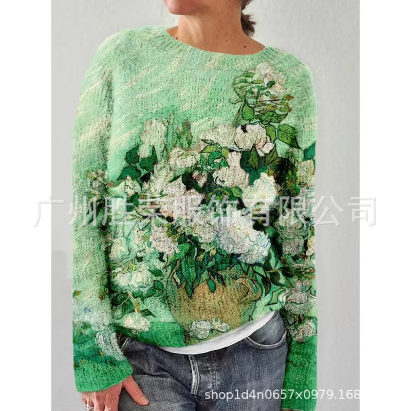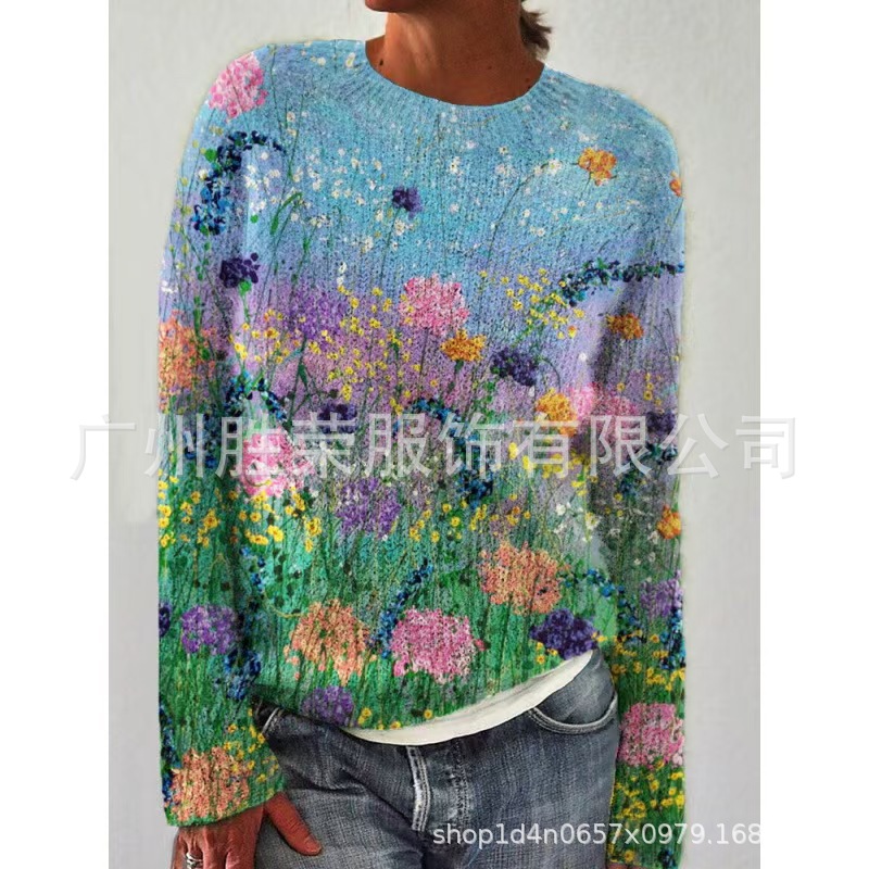 2024 새로운 국경 대외 무역 유럽과 미국 여성의 가을 및 겨울 뜨거운 판매 식물 꽃 인쇄 캐주얼 크루 넥 스웨터