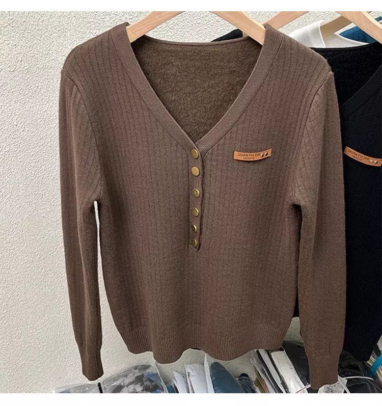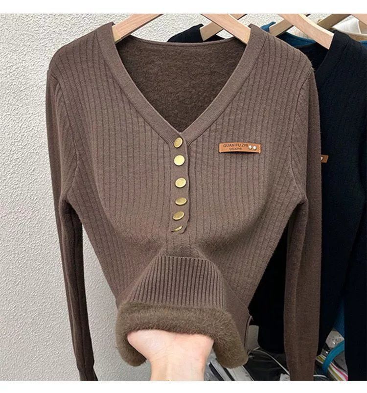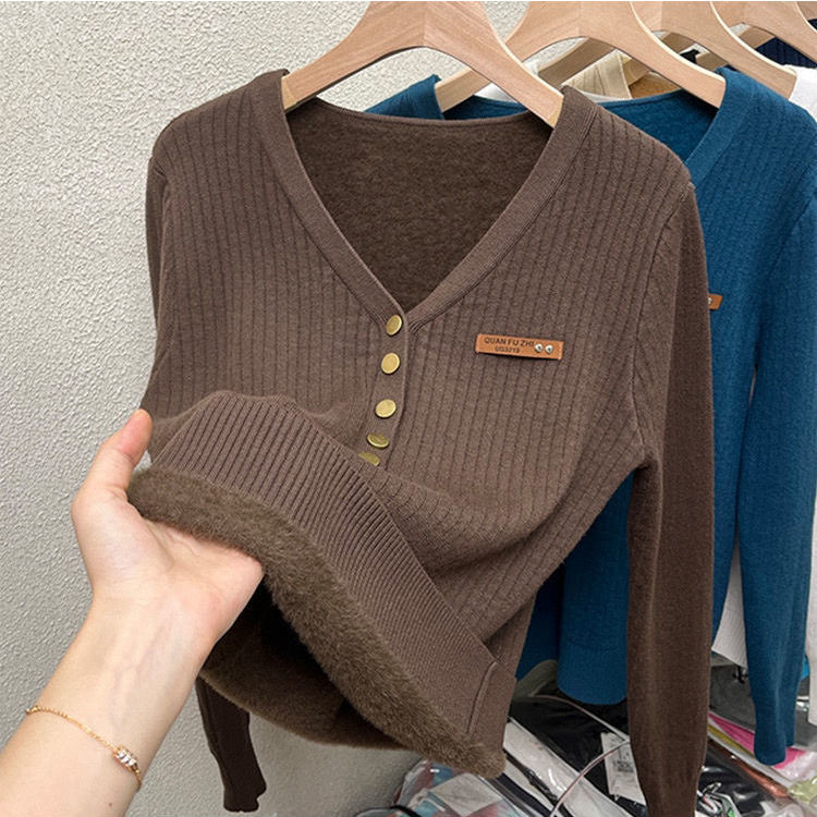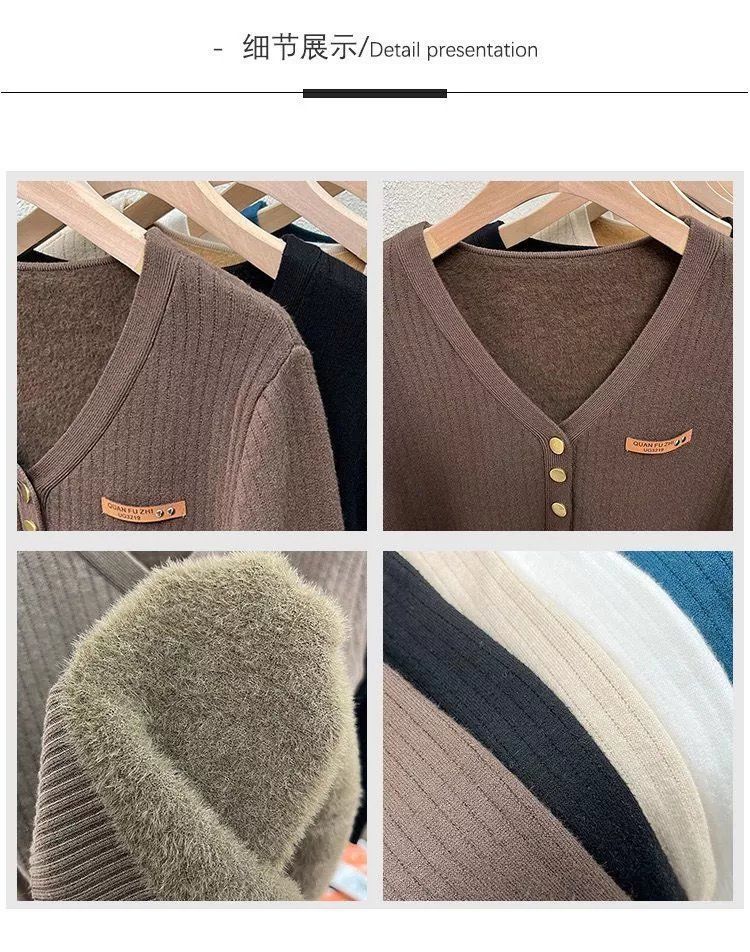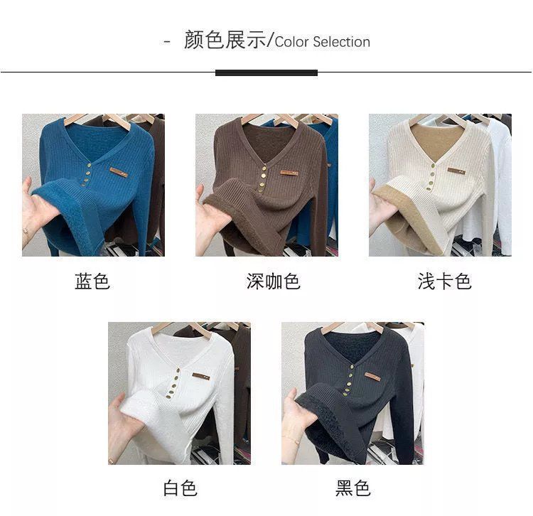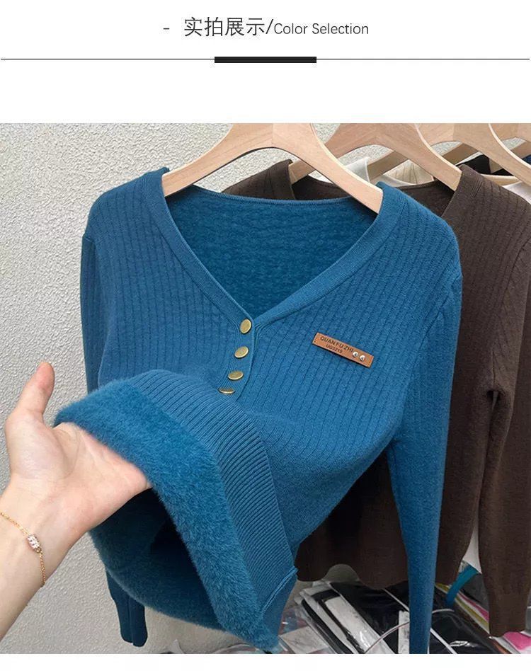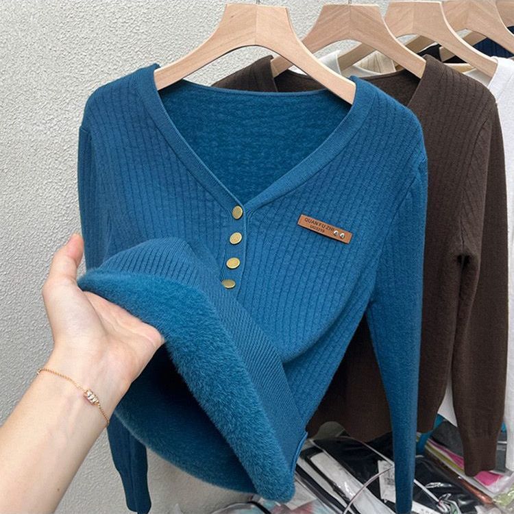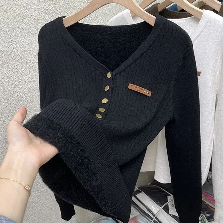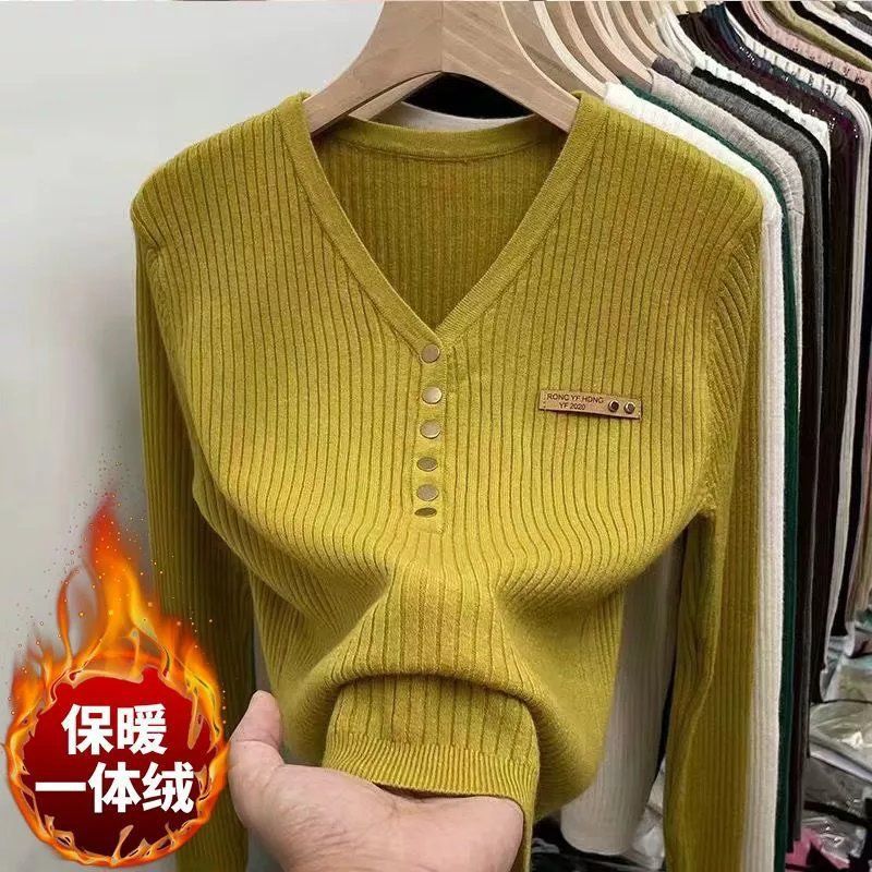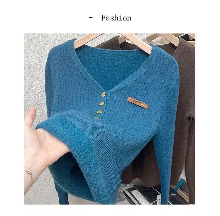 밍크 원피스 벨벳 기모 두꺼운 스웨터 니트베이스 셔츠 여성용 가을 및 겨울 스타일 슬림 핏 V 넥 탑