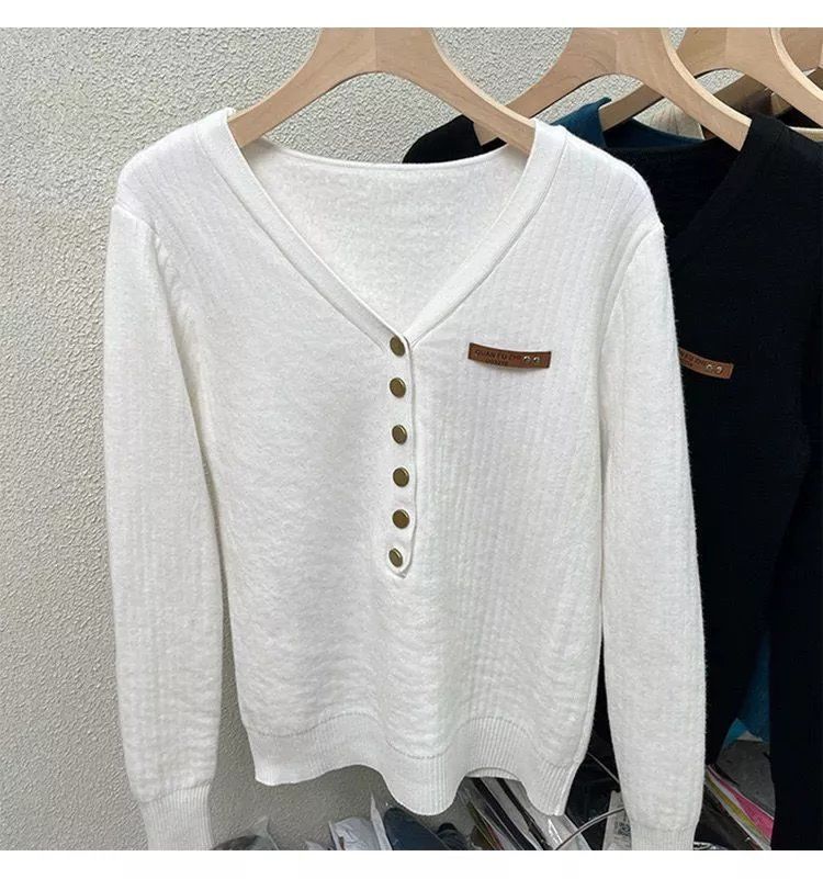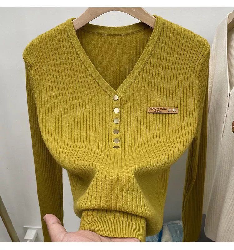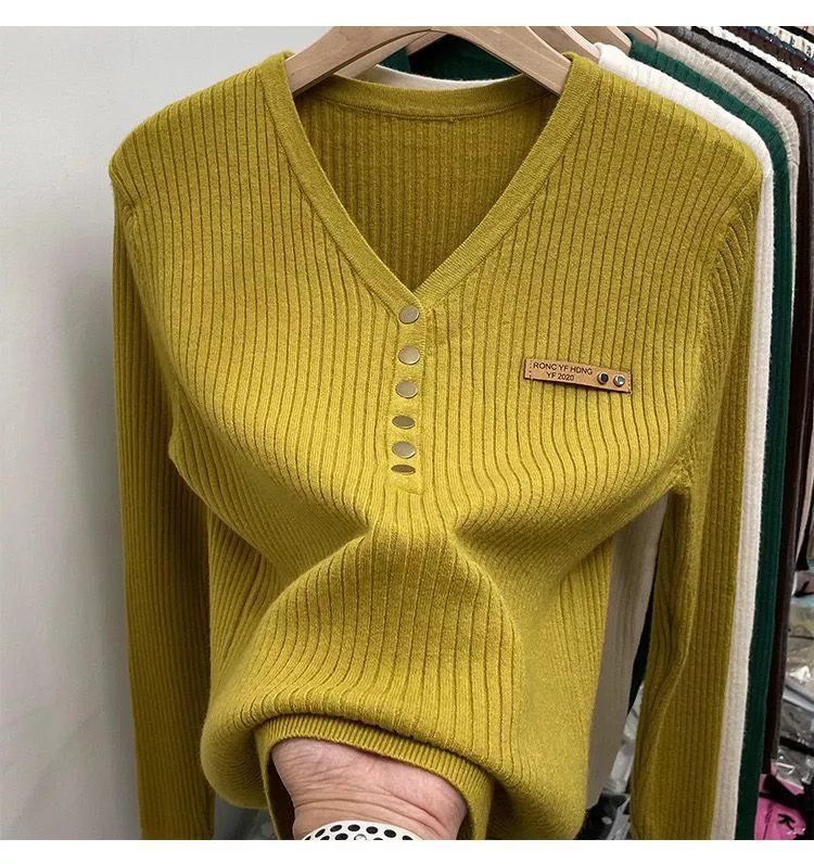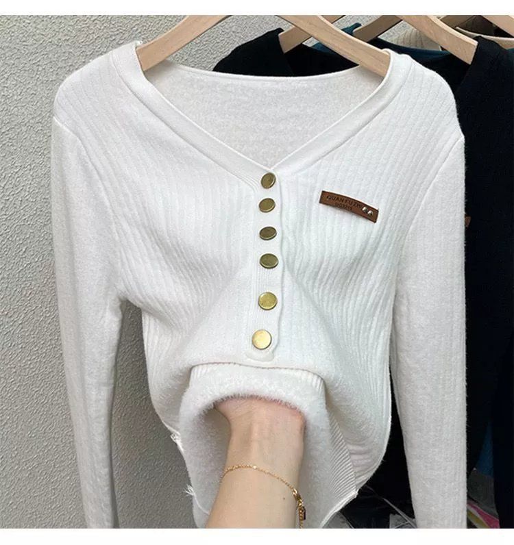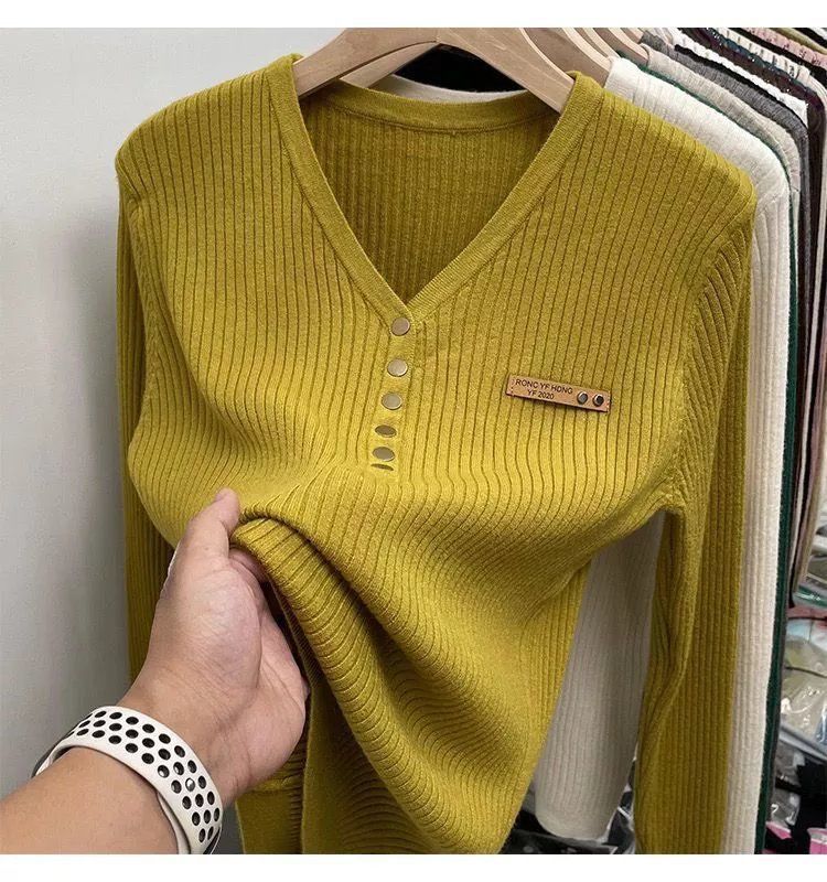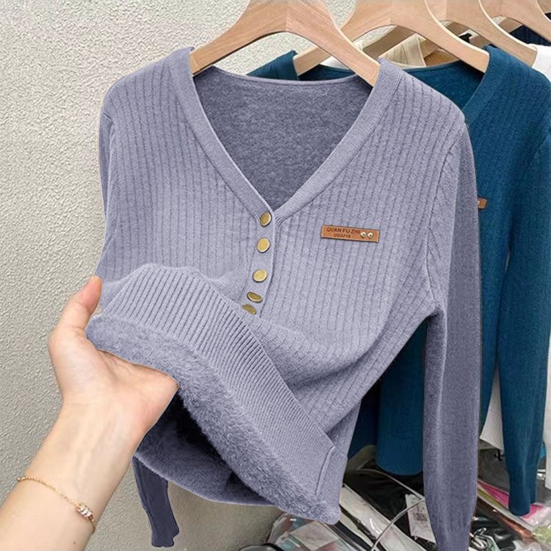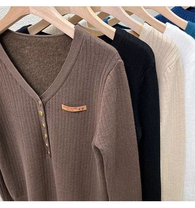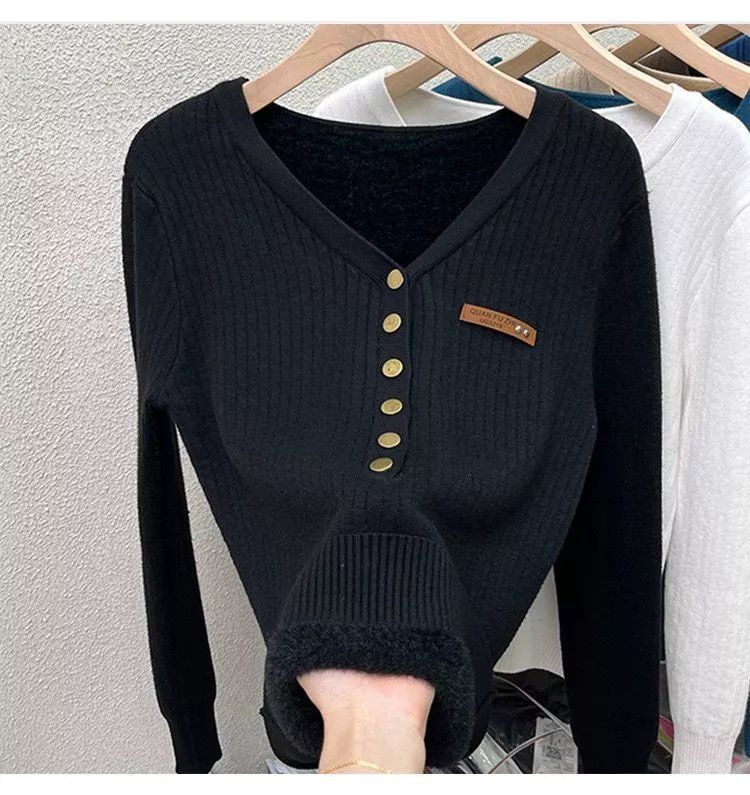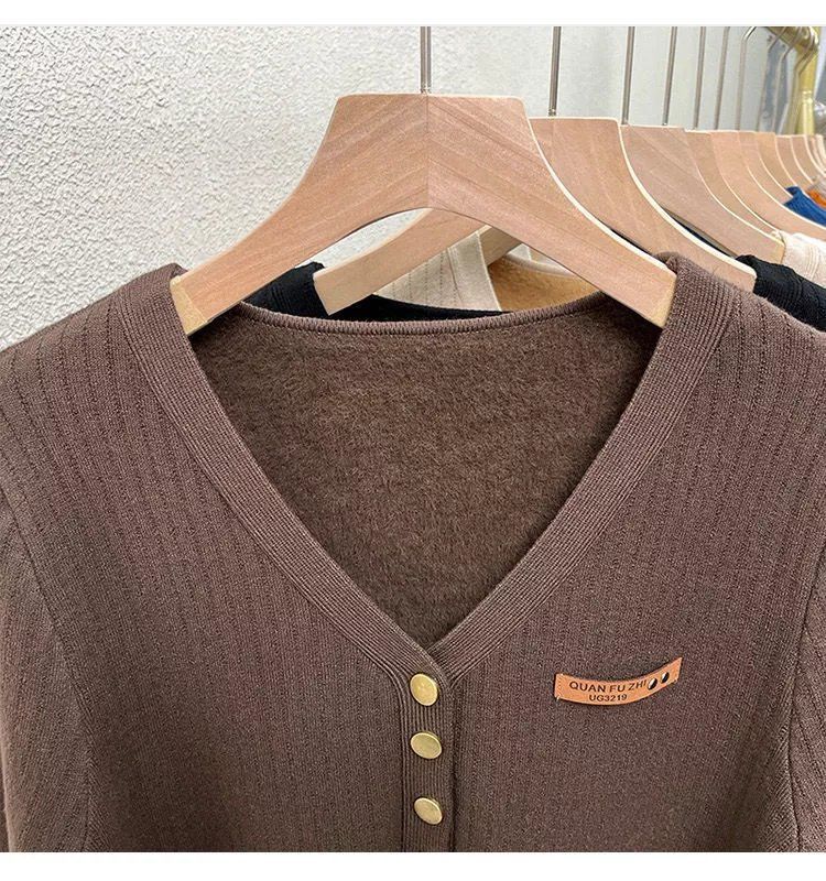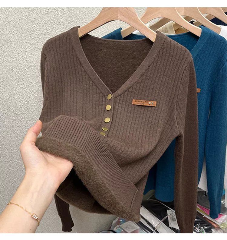 밍크 원피스 벨벳 기모 두꺼운 스웨터 니트베이스 셔츠 여성용 가을 및 겨울 스타일 슬림 핏 V 넥 탑