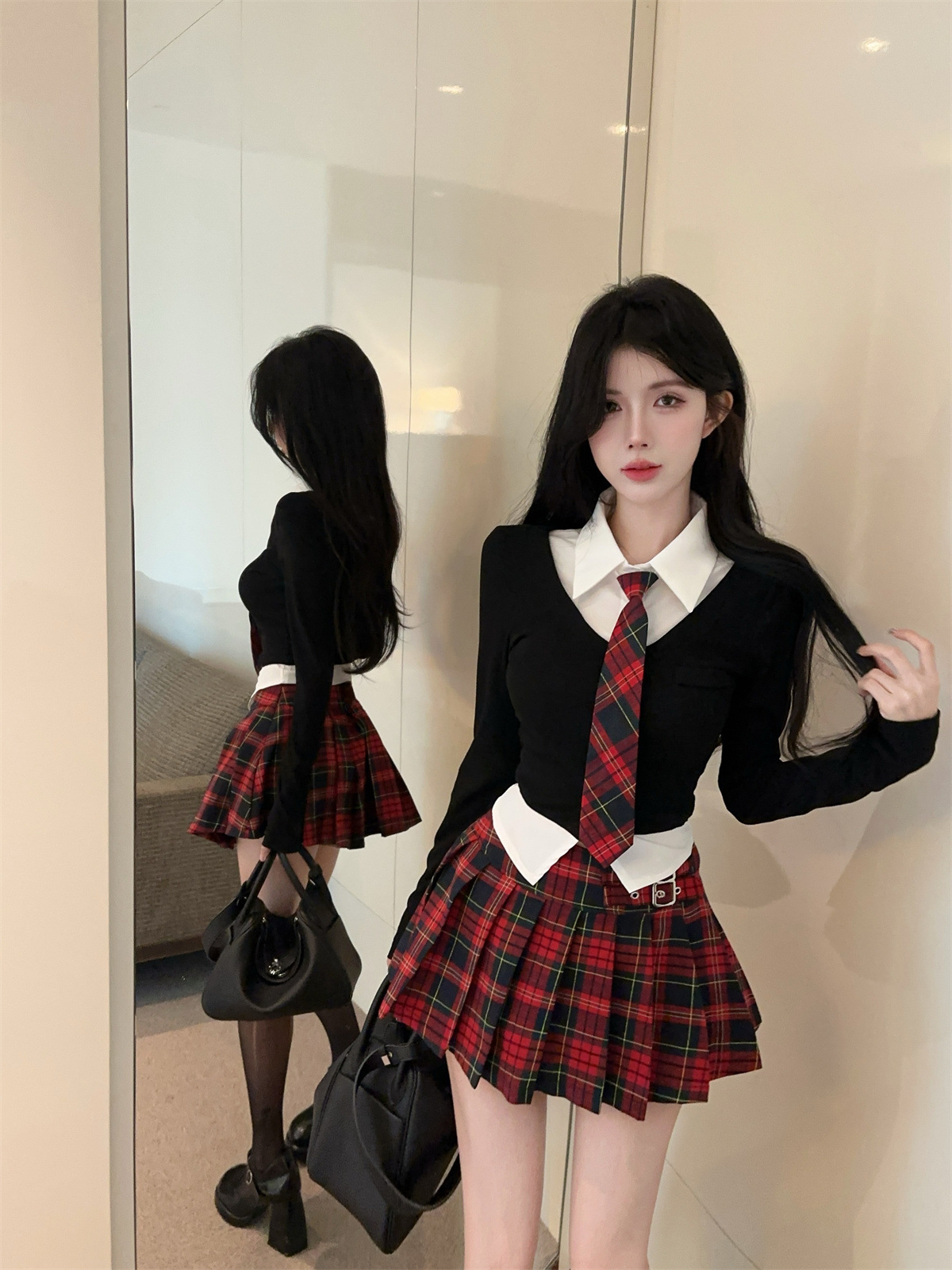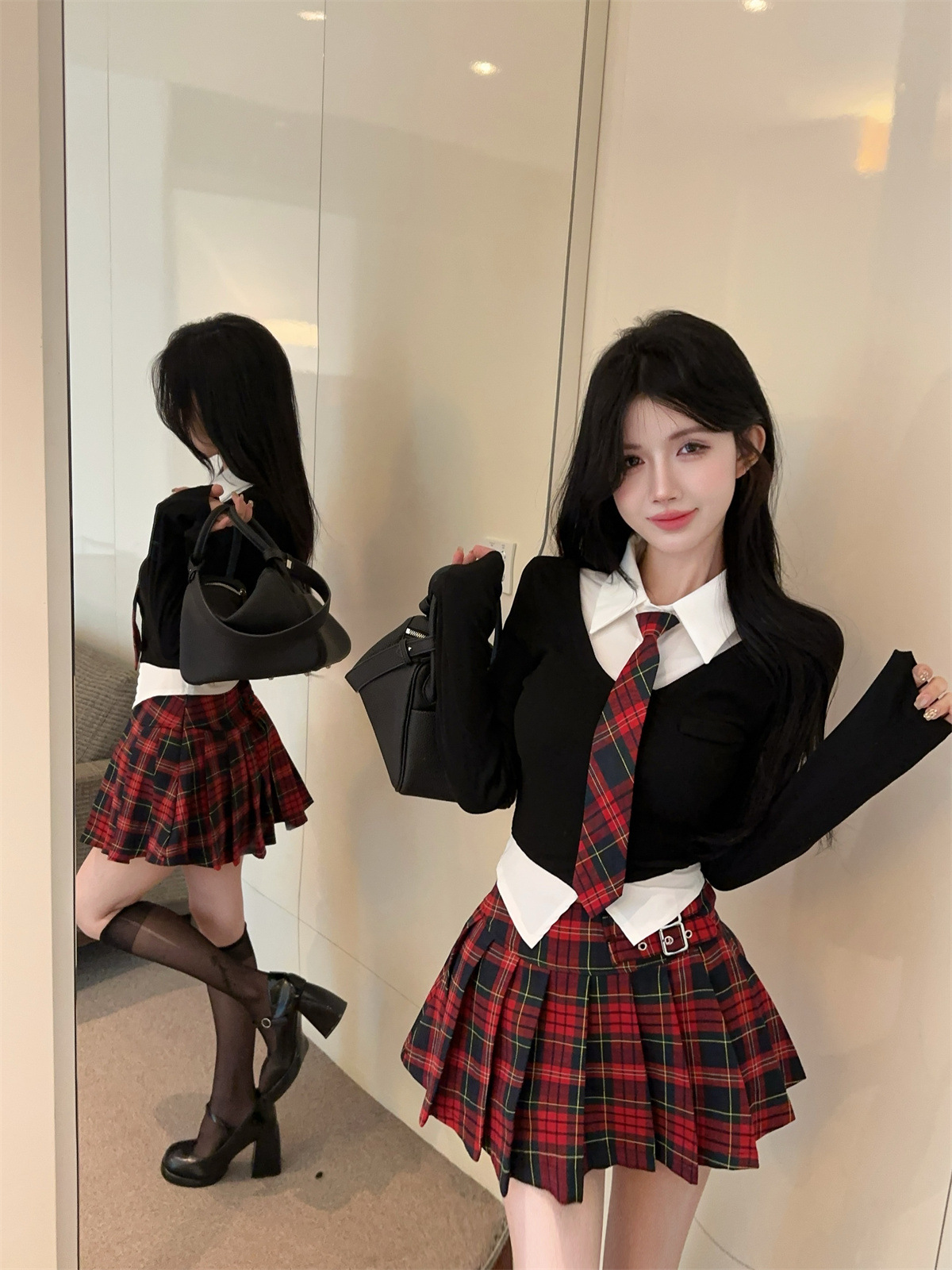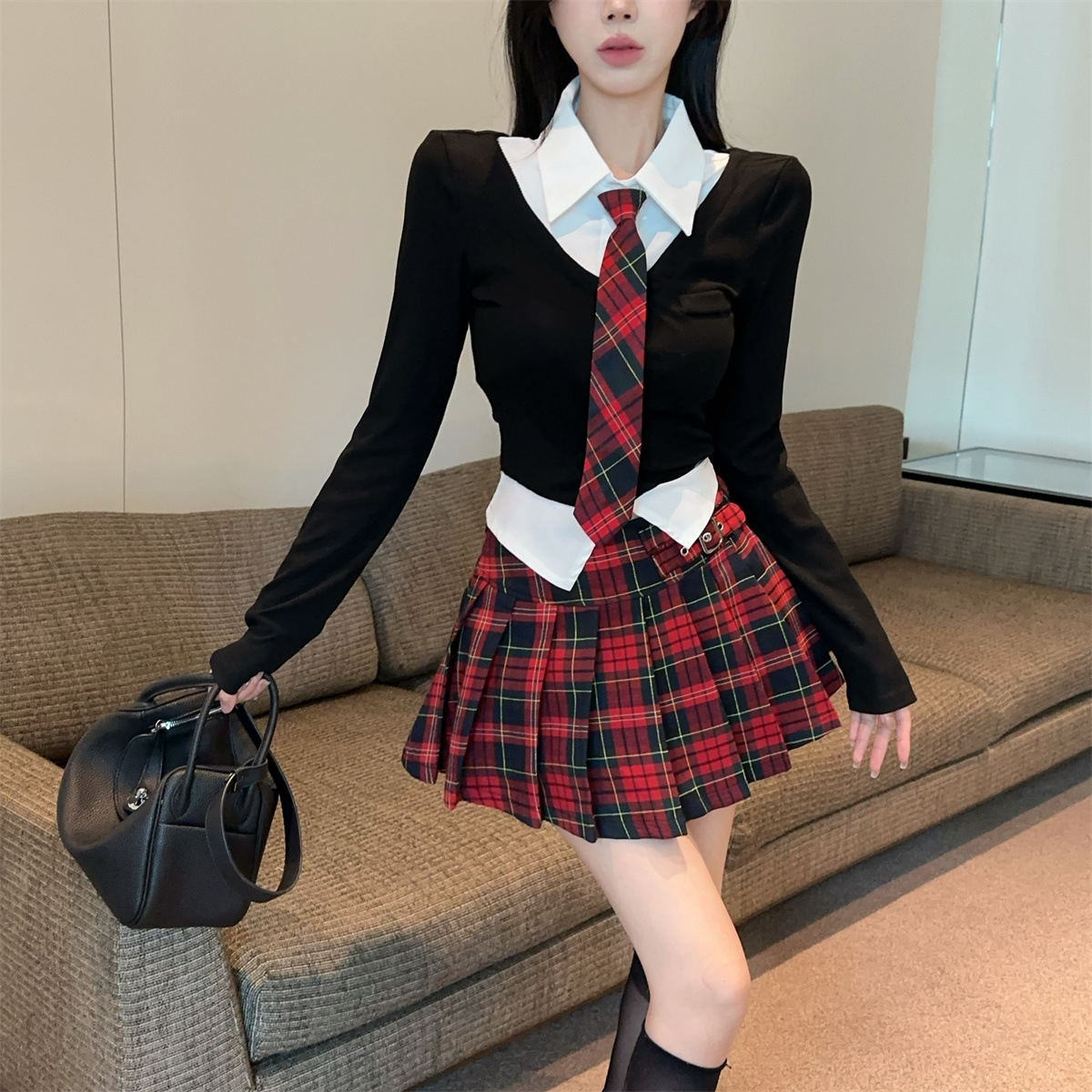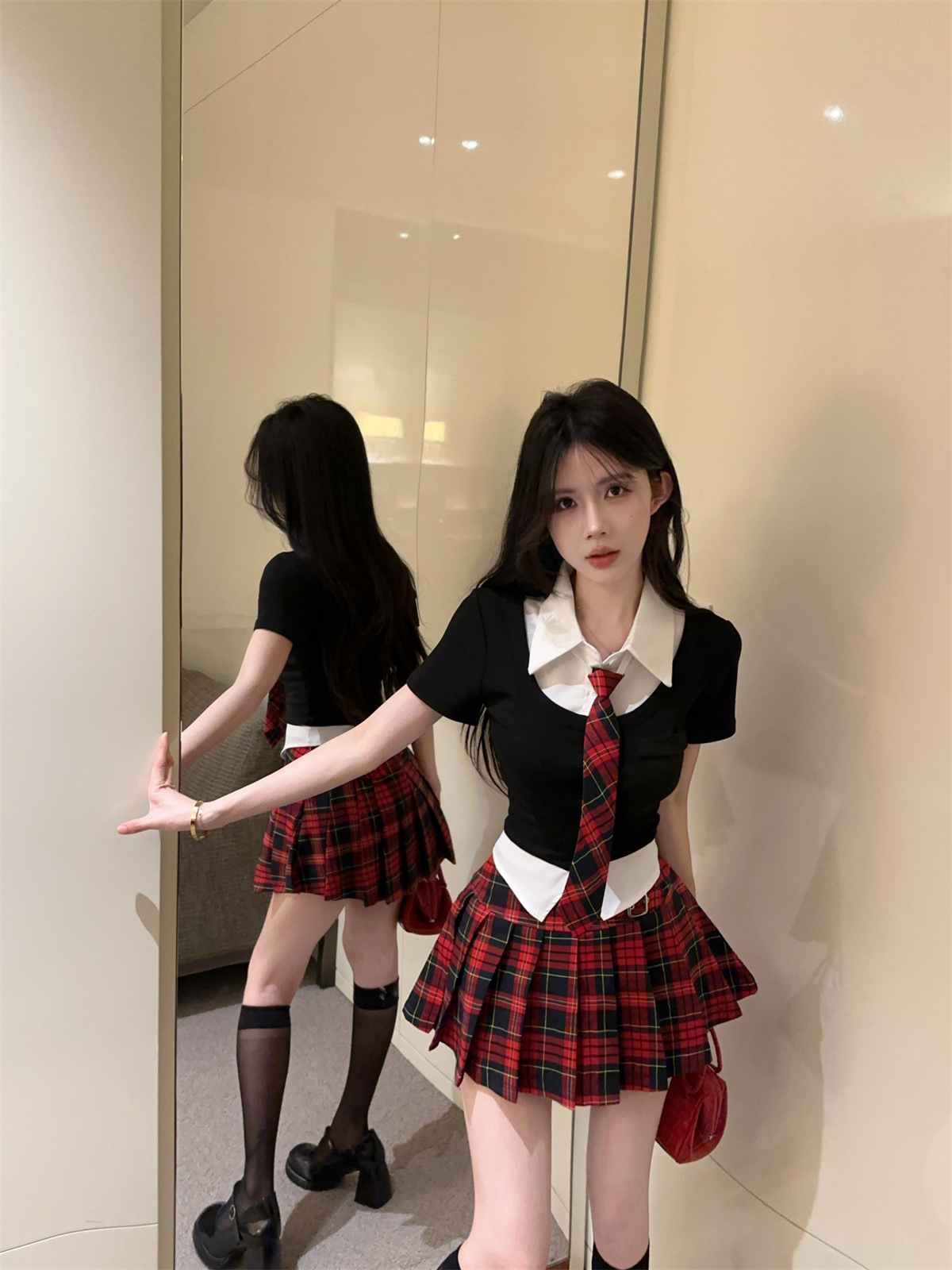• 페이크 투피스 탑 + 타이 + 레드 체크 스커트