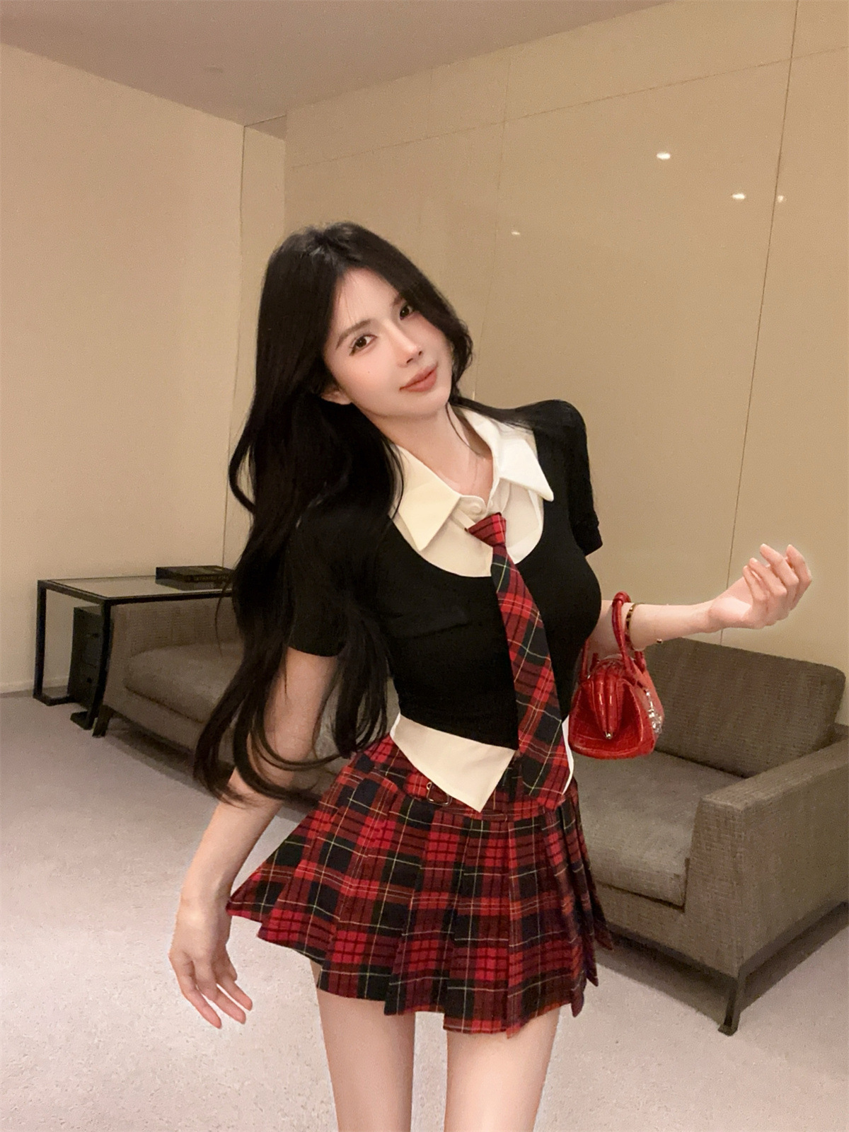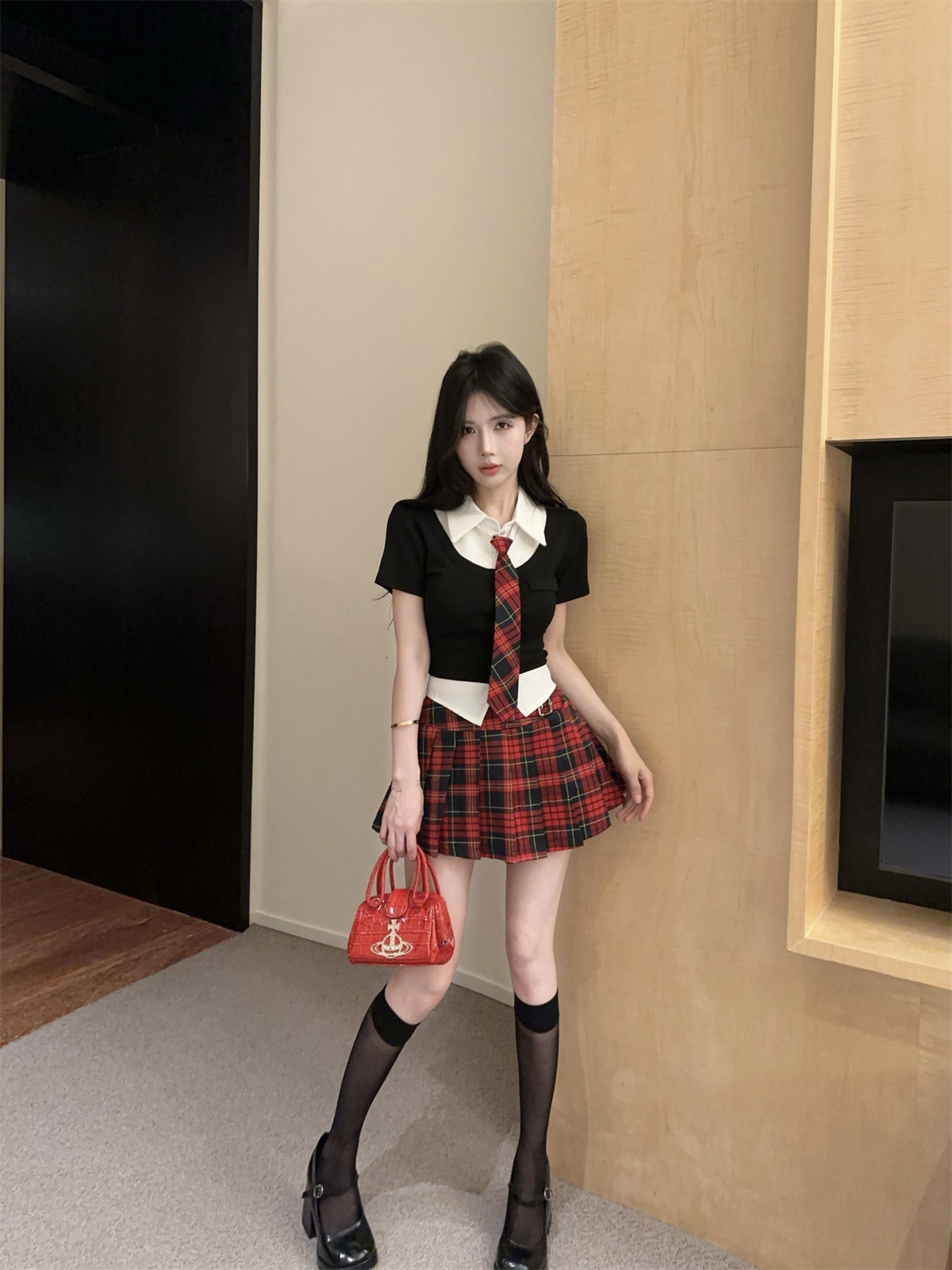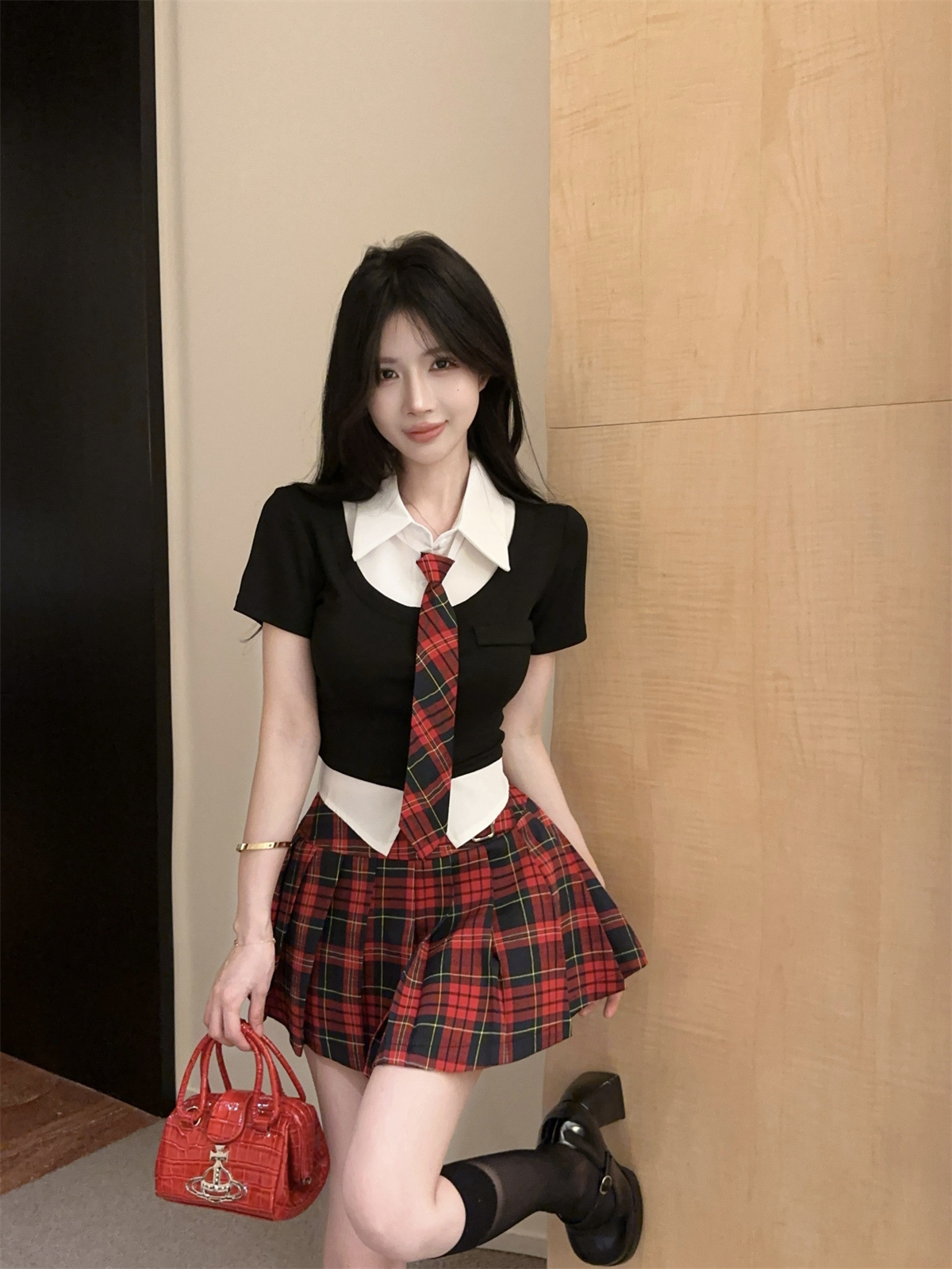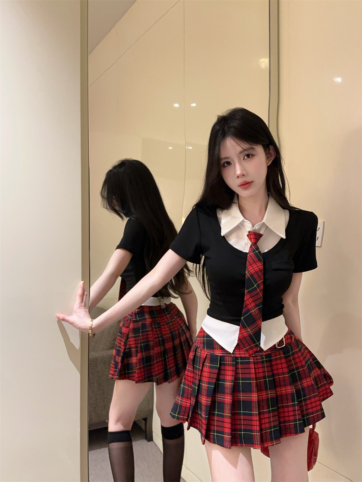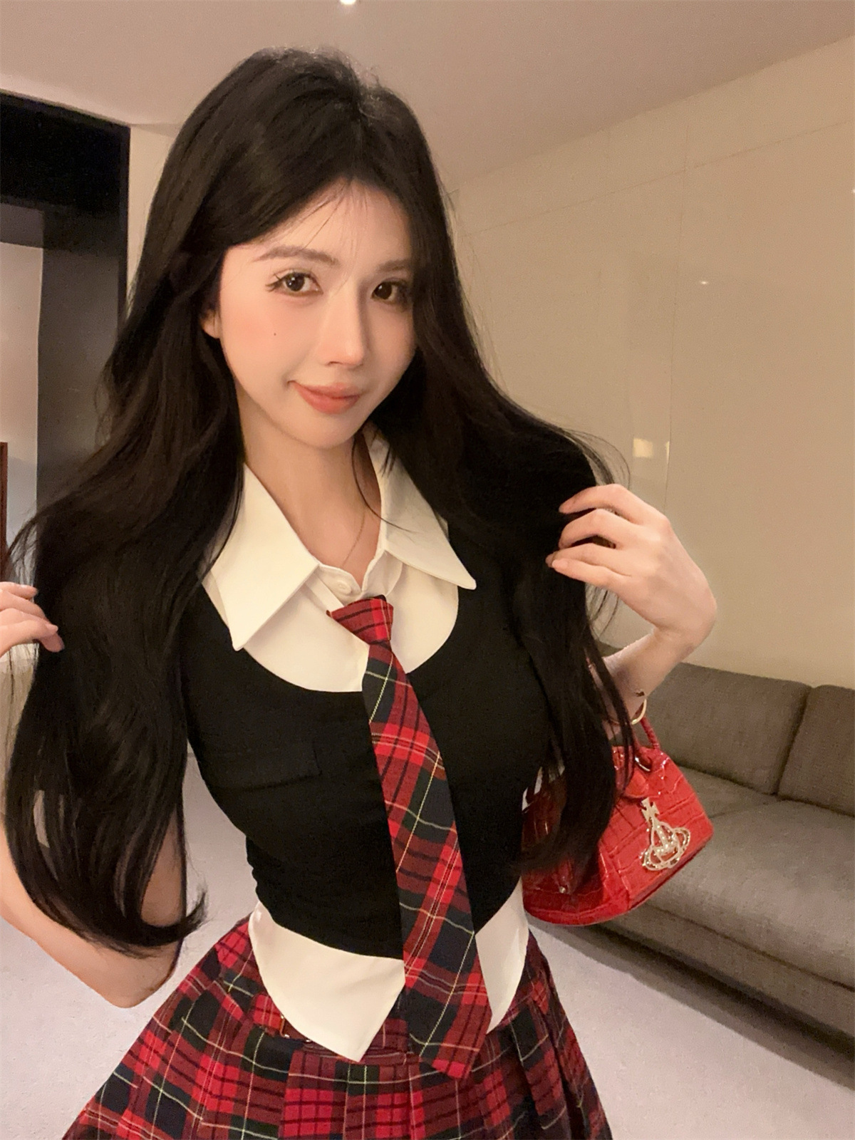 • 페이크 투피스 탑 + 타이 + 레드 체크 스커트