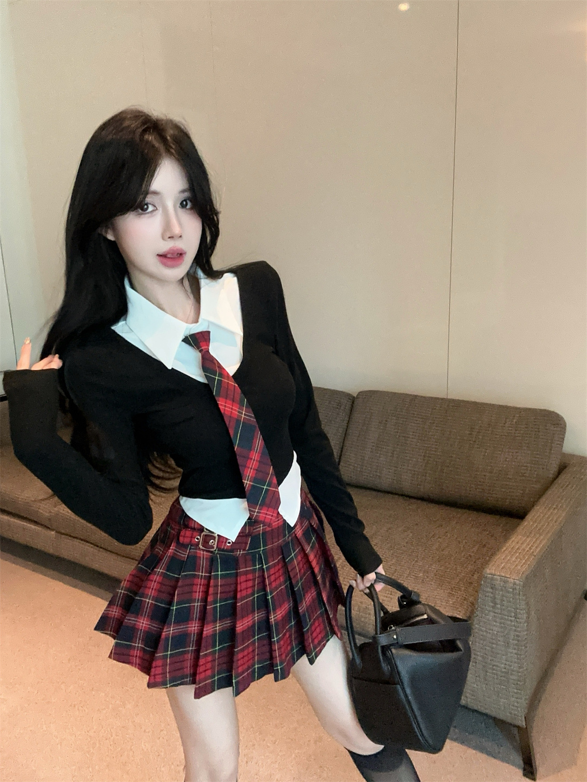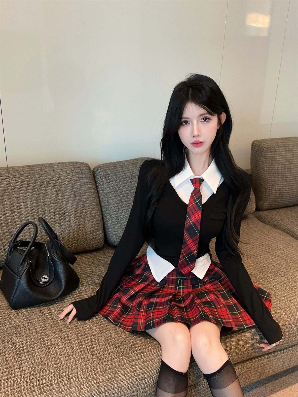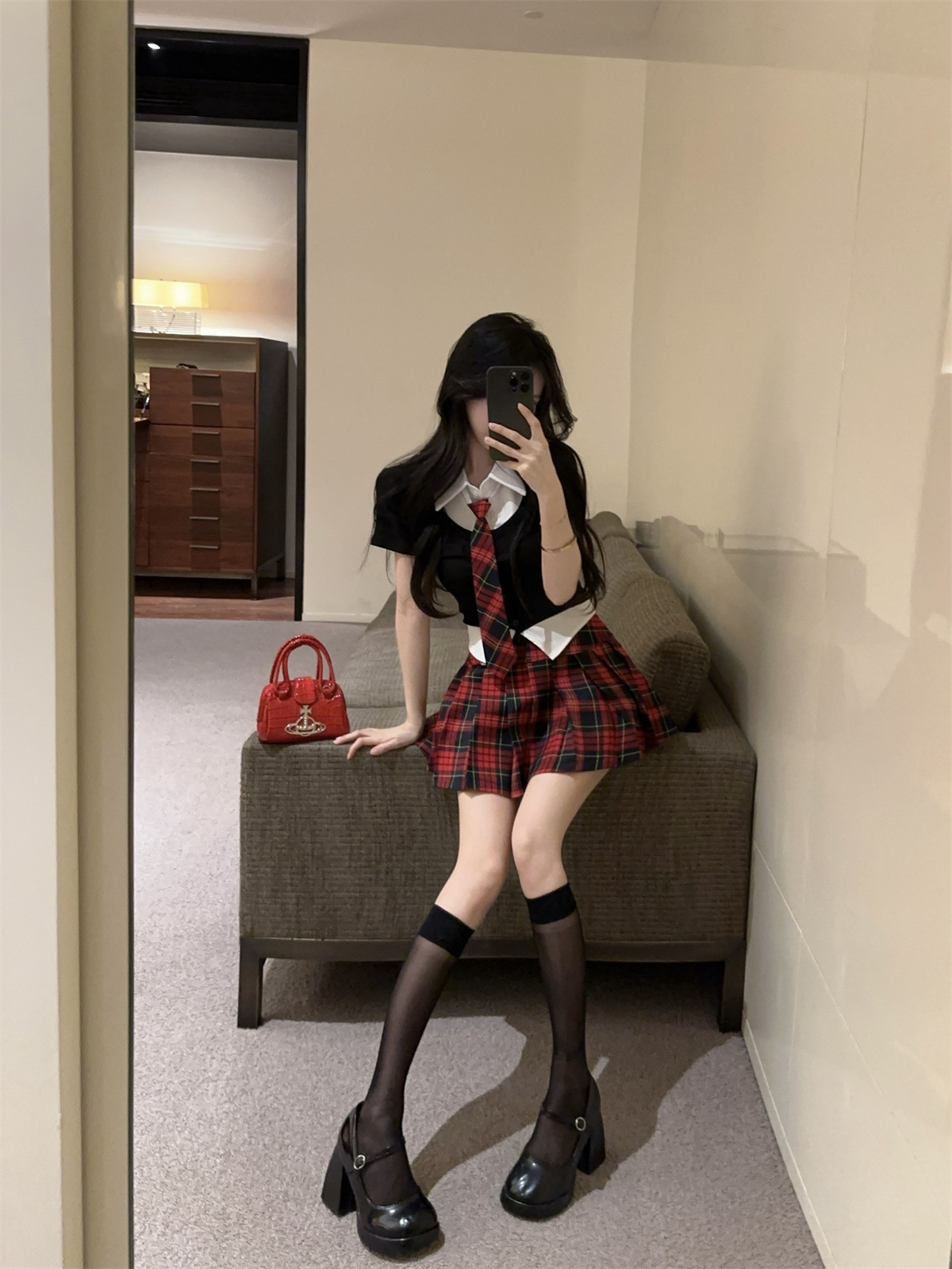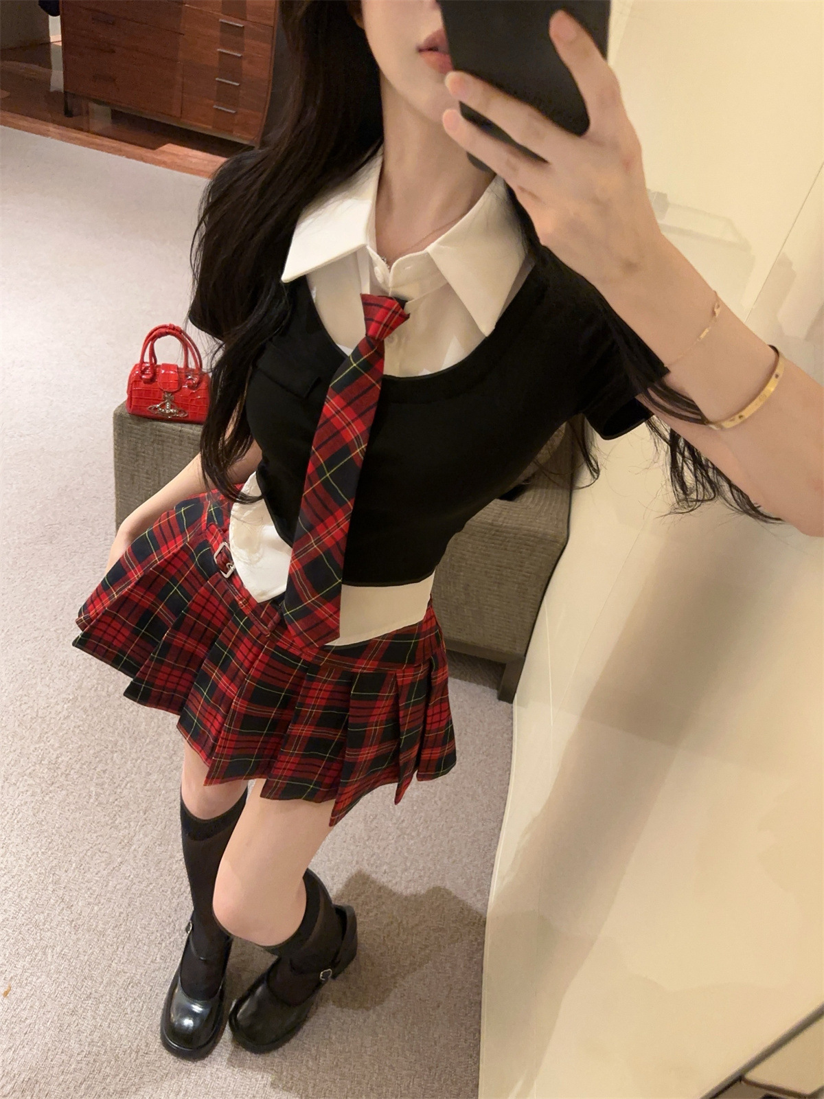 • 페이크 투피스 탑 + 타이 + 레드 체크 스커트