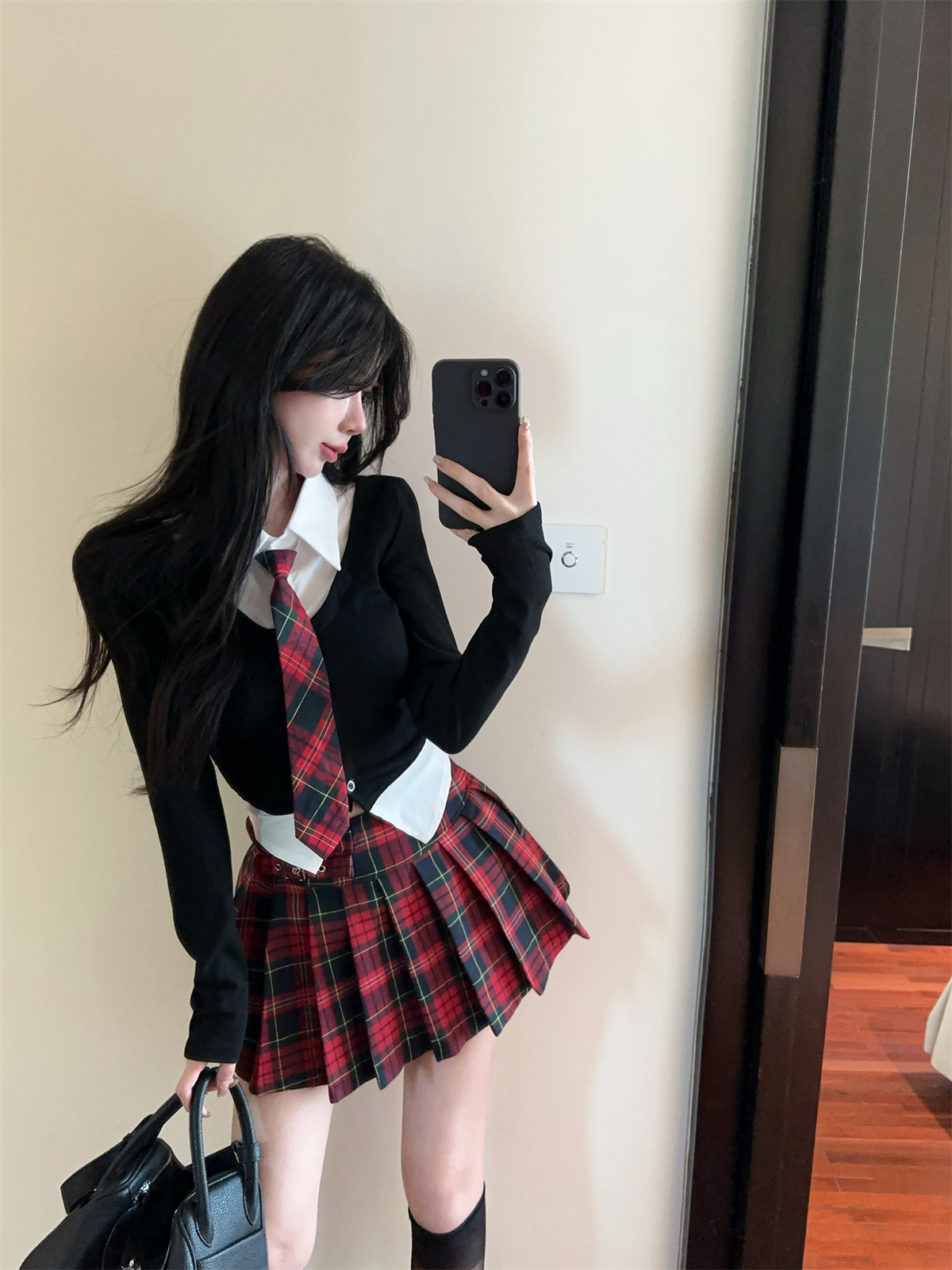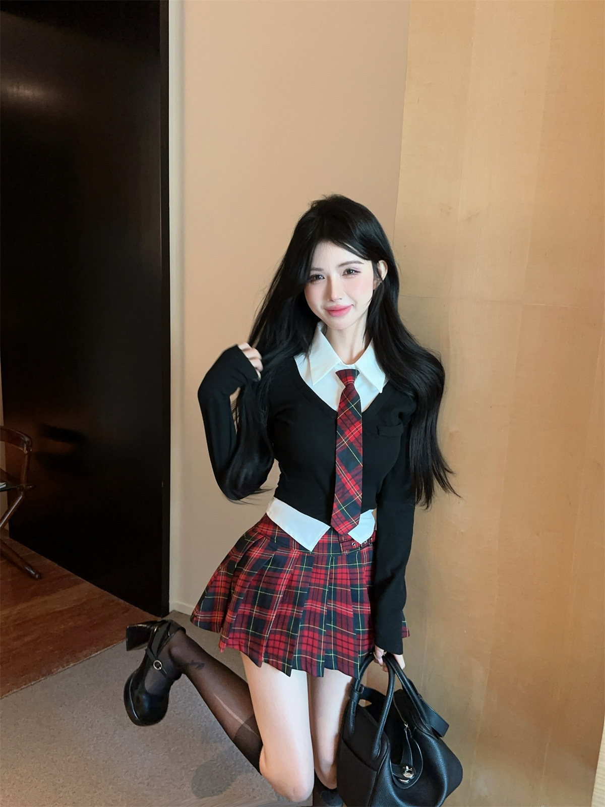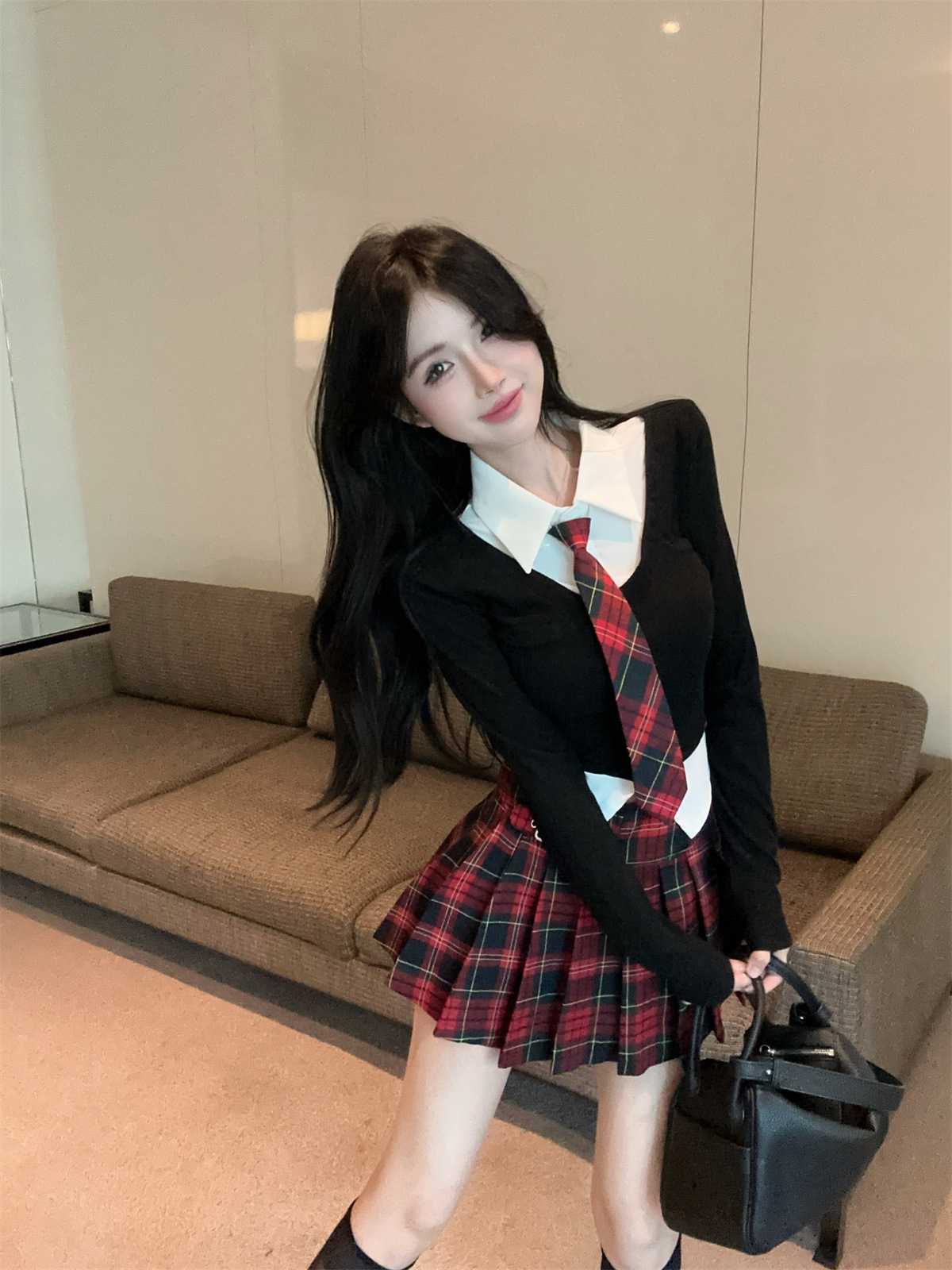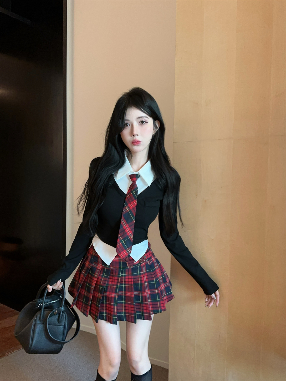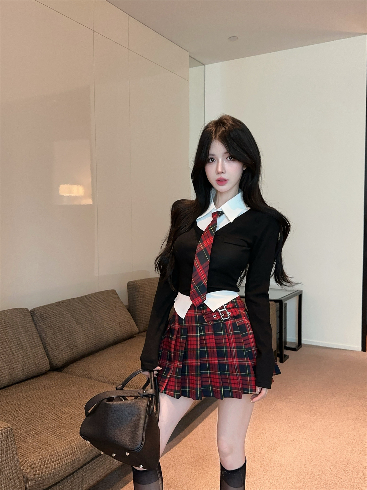 • 페이크 투피스 탑 + 타이 + 레드 체크 스커트