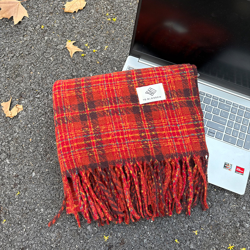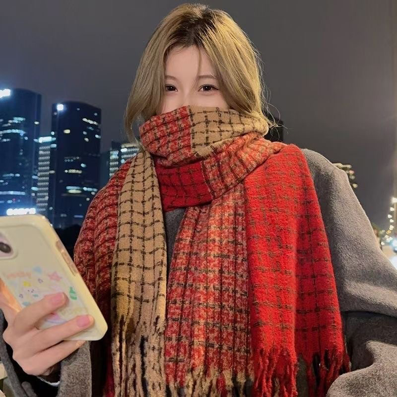 빨간색 체크무늬 스카프 크리스마스 스카프 한국 스타일 분위기 가을 겨울 다용도 고급스러운 캐시미어 숄 스카프스토어 가기