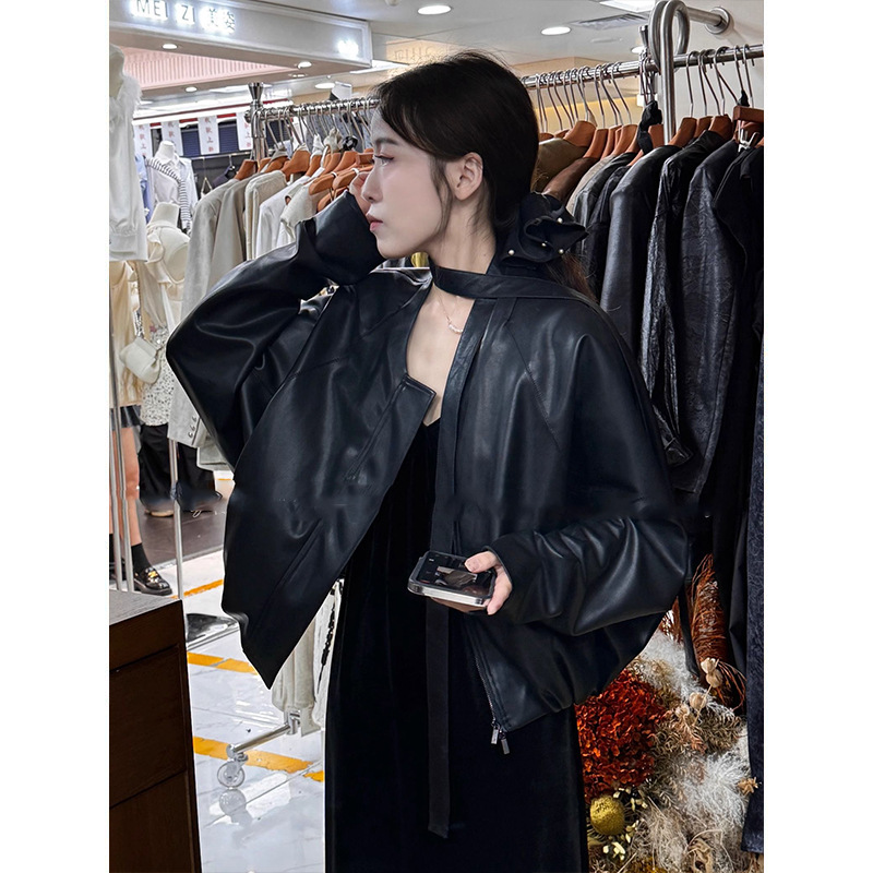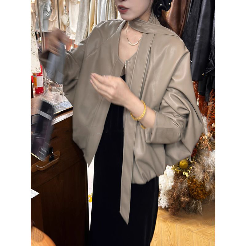 디자인 감각이 돋보이는 여성용 숏 가죽 자켓, 2025년 가을 신상 한국 스타일 루즈핏 가죽 자켓, 리본 장식 자켓스토어 가기