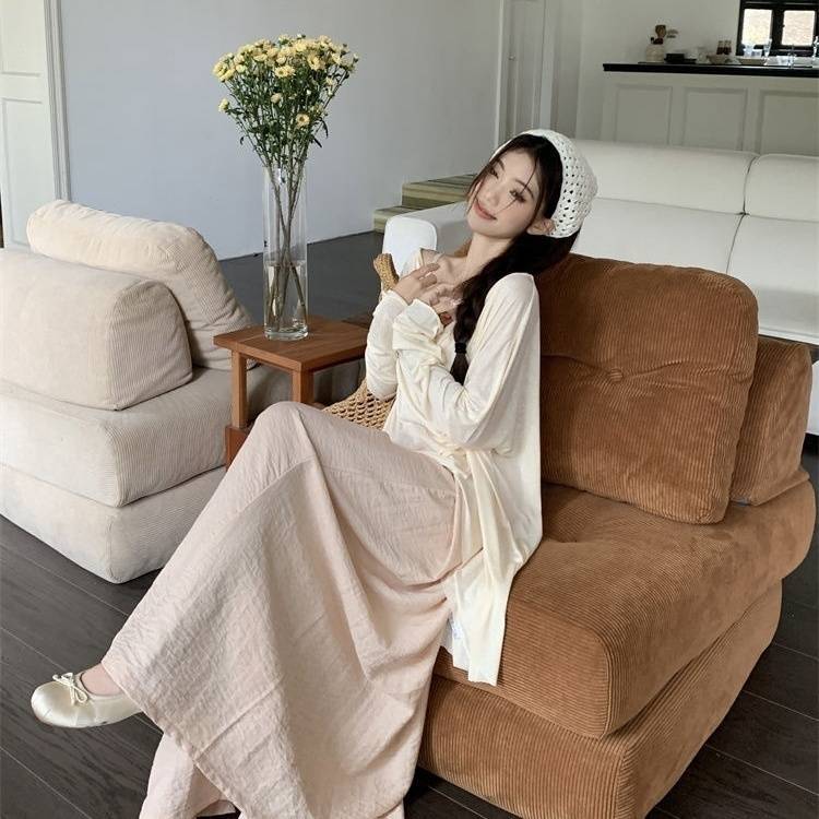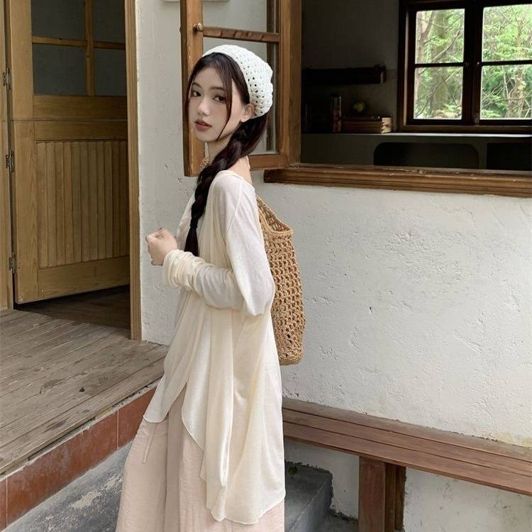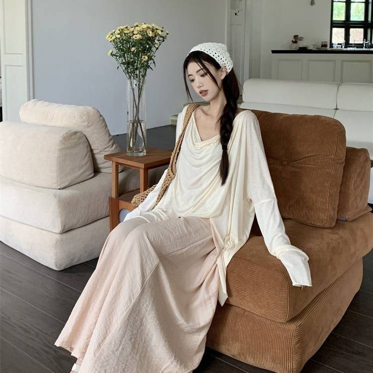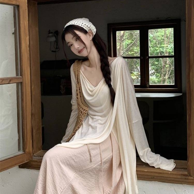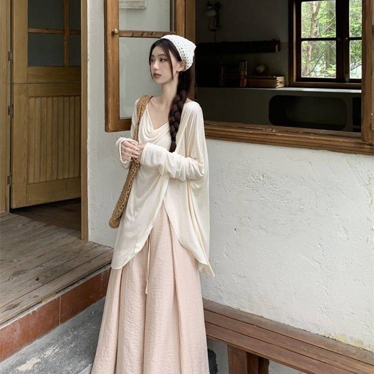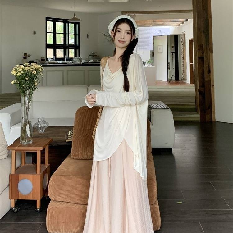 게으른 스타일 세트 여성의 여름 우아한 휴식 불규칙한 태양 보호 블라우스 티셔츠 넓은 다리 바지 스커트 투피스 세트