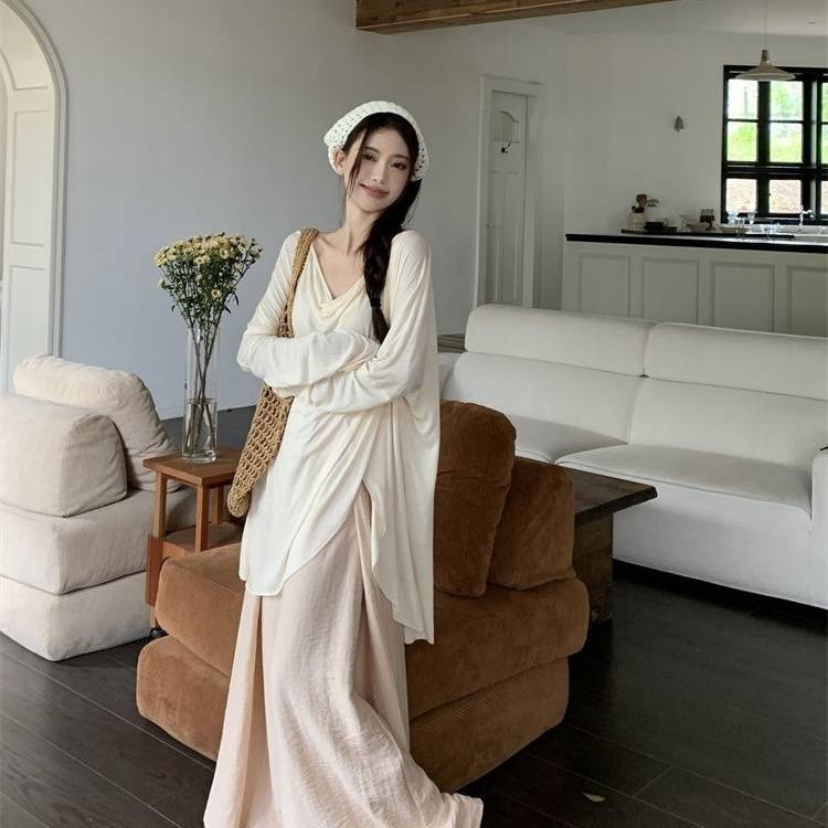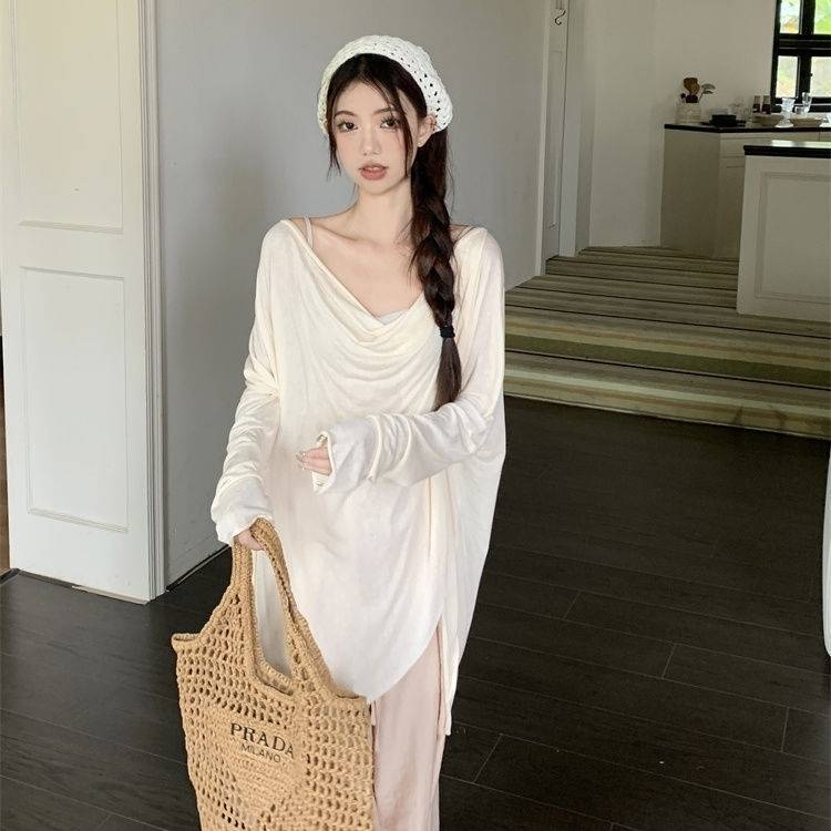 게으른 스타일 세트 여성의 여름 우아한 휴식 불규칙한 태양 보호 블라우스 티셔츠 넓은 다리 바지 스커트 투피스 세트스토어 가기