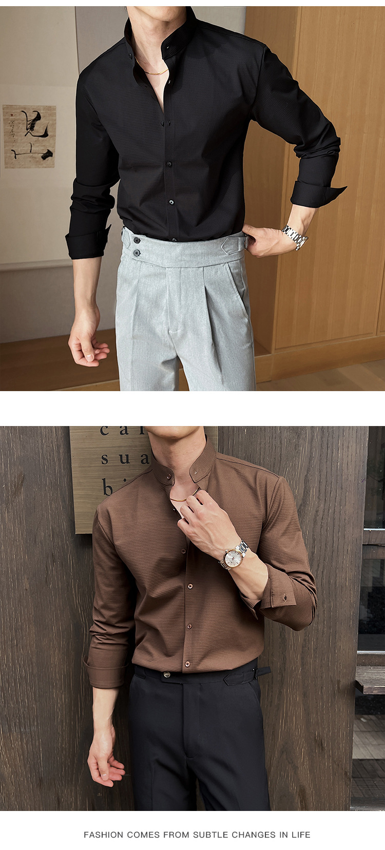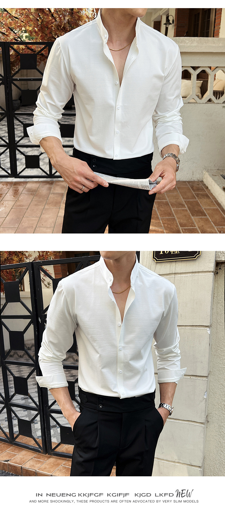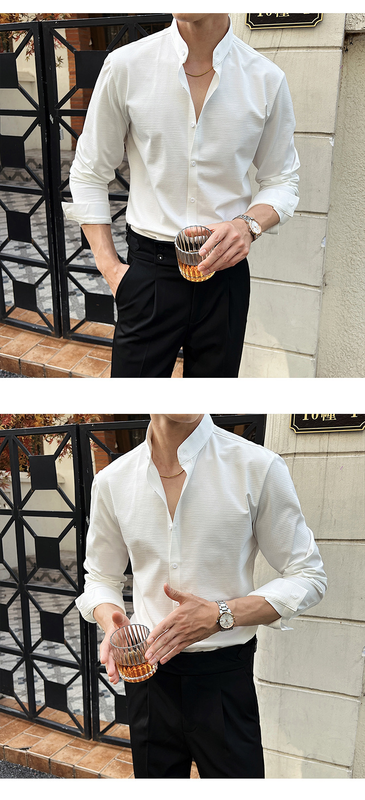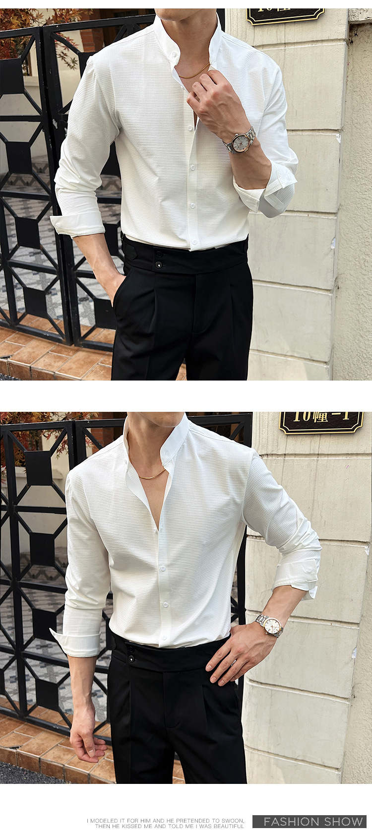 2024 년 가을 남성용 수직 칼라가있는 새로운 중국 스타일 긴팔 셔츠 하이 엔드 와플 하이 탄성 비 트레이스베이스 셔츠스토어 가기