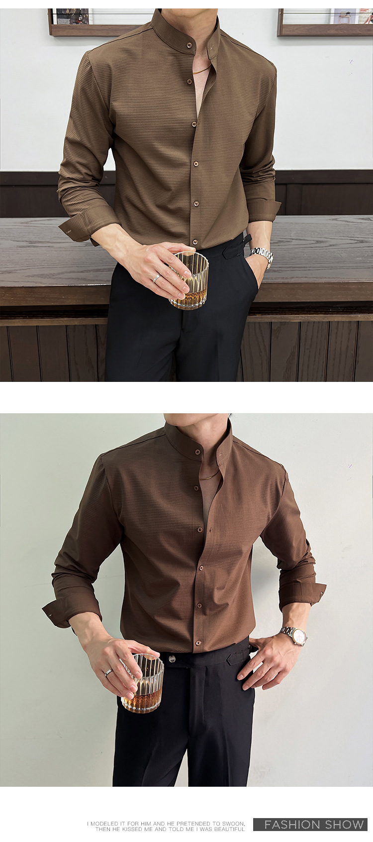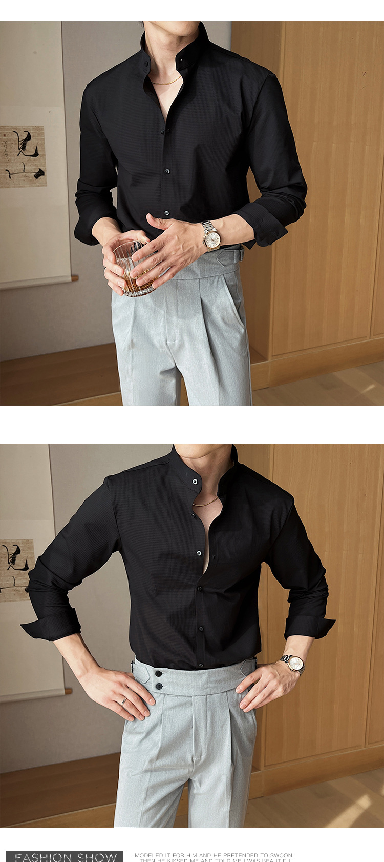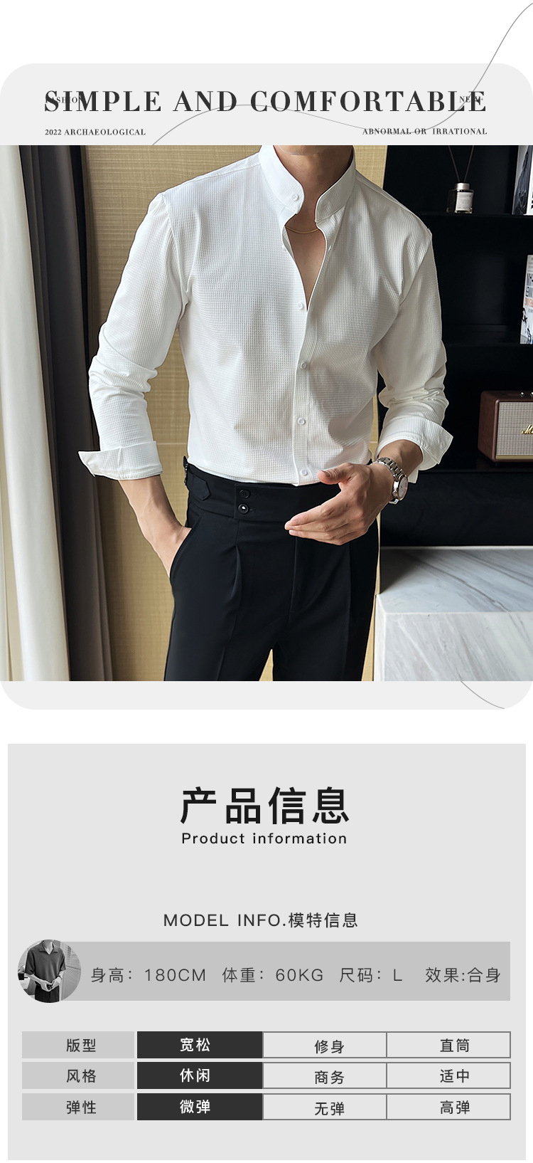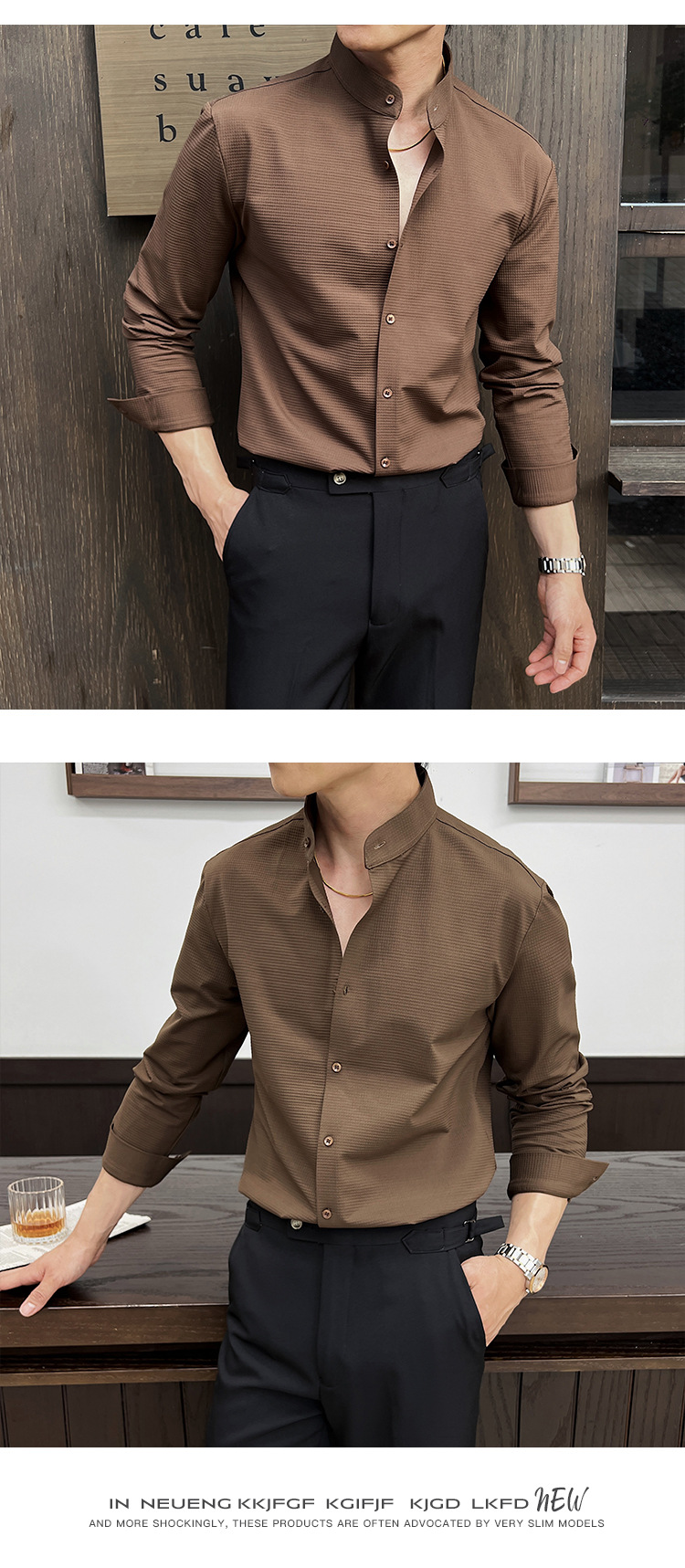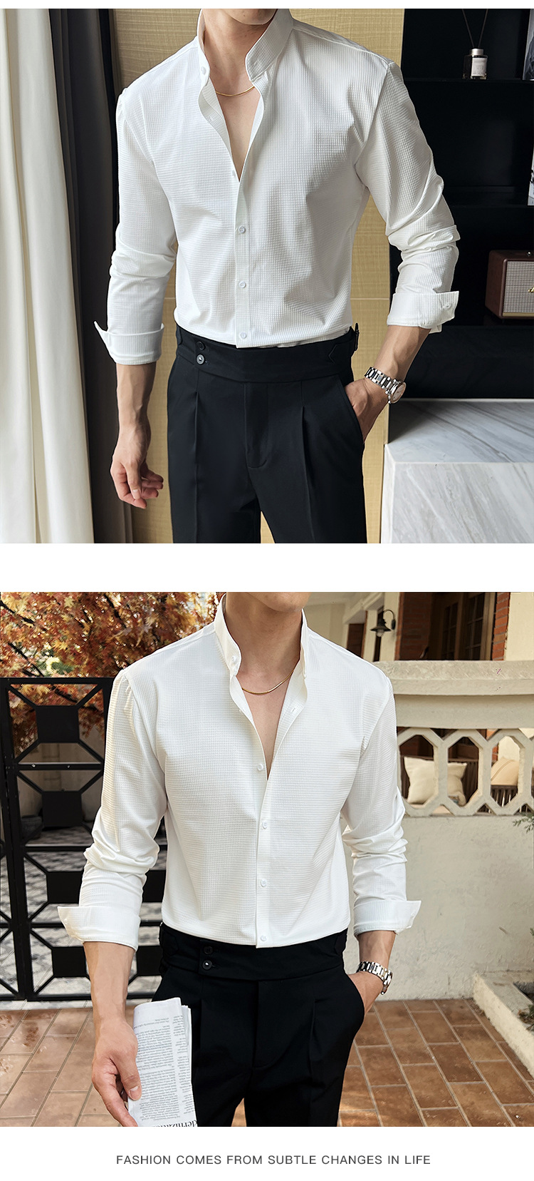 2024 년 가을 남성용 수직 칼라가있는 새로운 중국 스타일 긴팔 셔츠 하이 엔드 와플 하이 탄성 비 트레이스베이스 셔츠스토어 가기