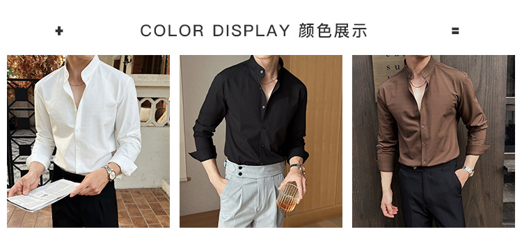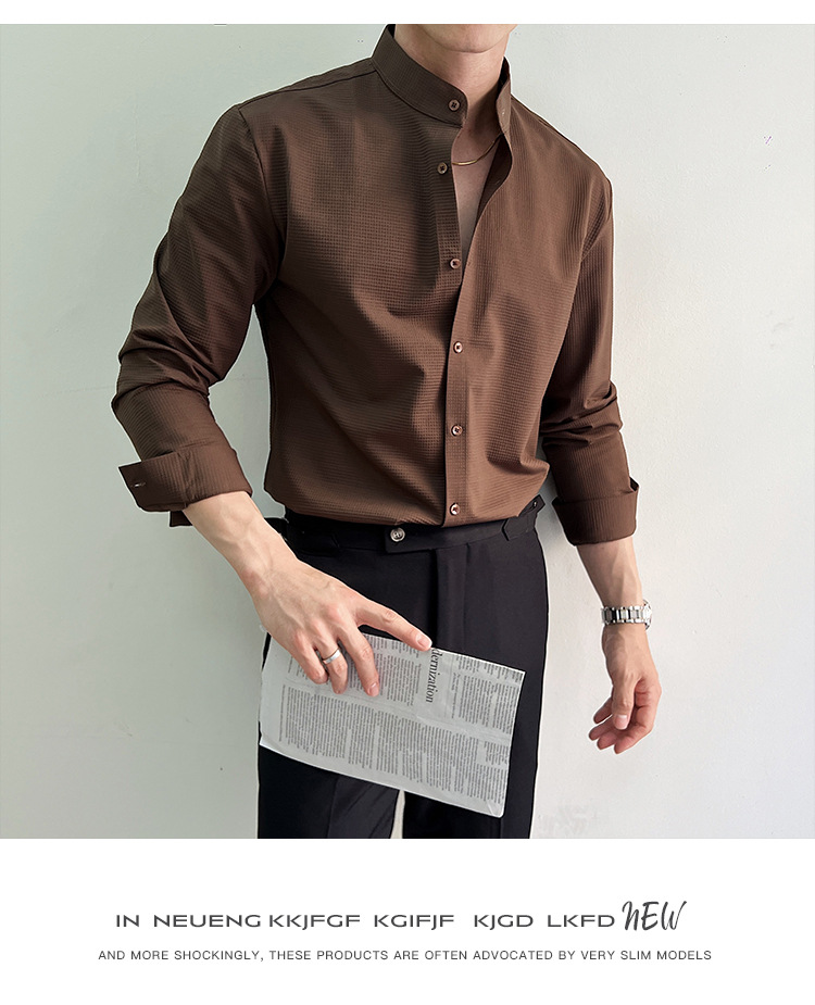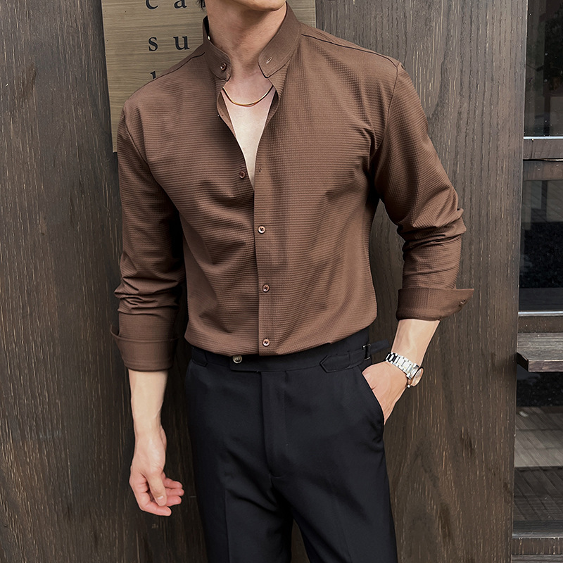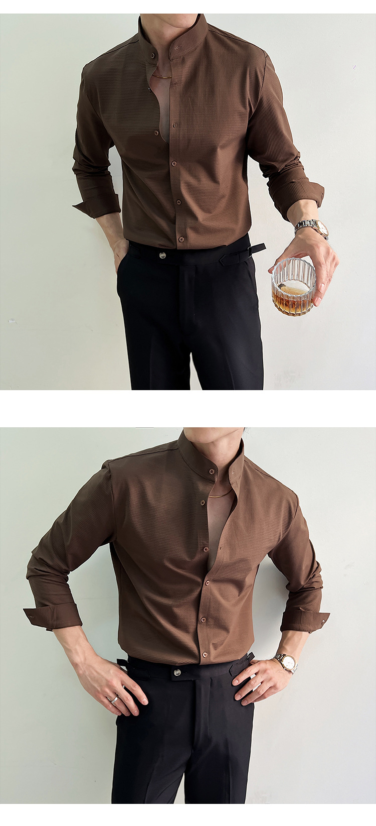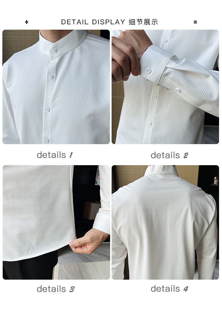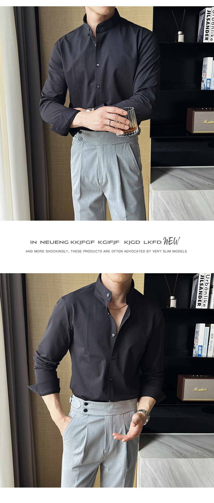 2024 년 가을 남성용 수직 칼라가있는 새로운 중국 스타일 긴팔 셔츠 하이 엔드 와플 하이 탄성 비 트레이스베이스 셔츠스토어 가기