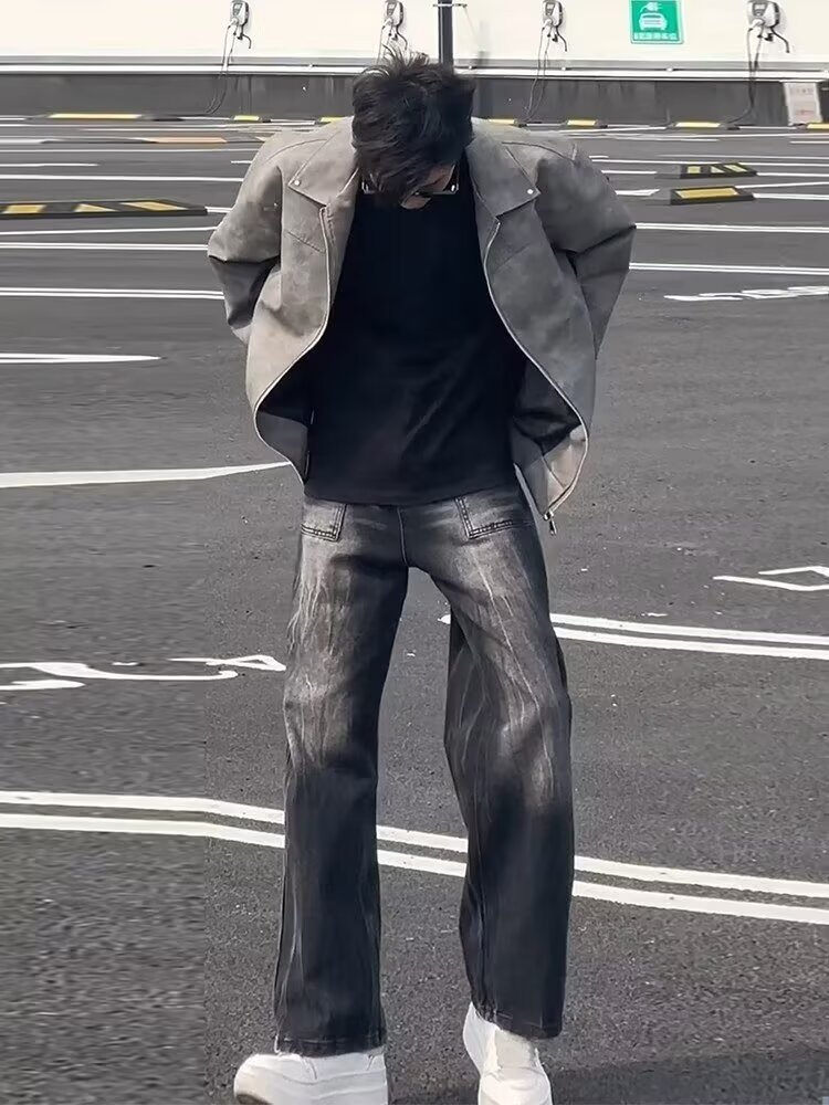 미국식 하이 스트리트 분위기 고민 된 세탁 청바지 남성용 트렌디 한 스트레이트 튜브 느슨한 넓은 다리 캐주얼 긴 바지스토어 가기