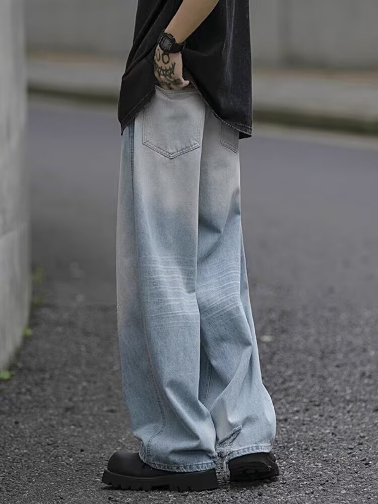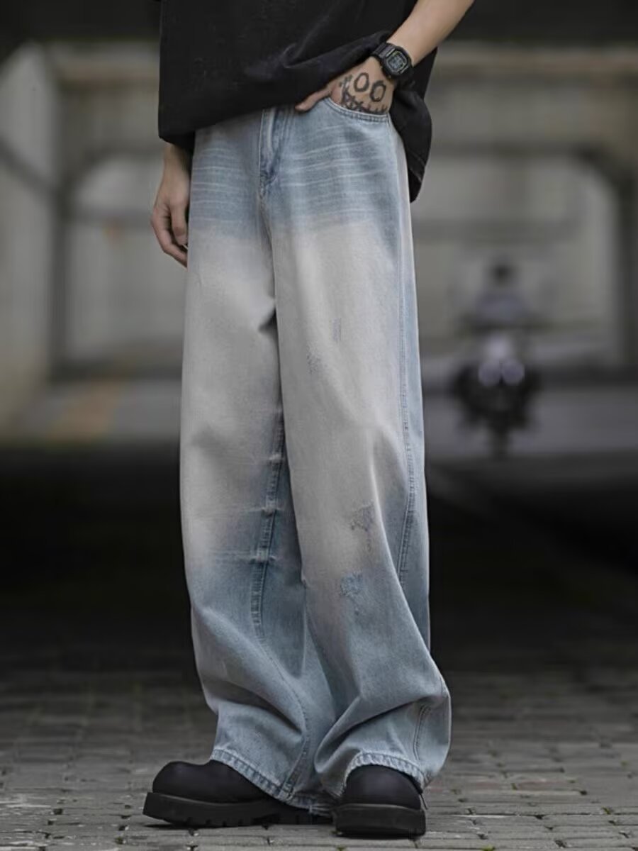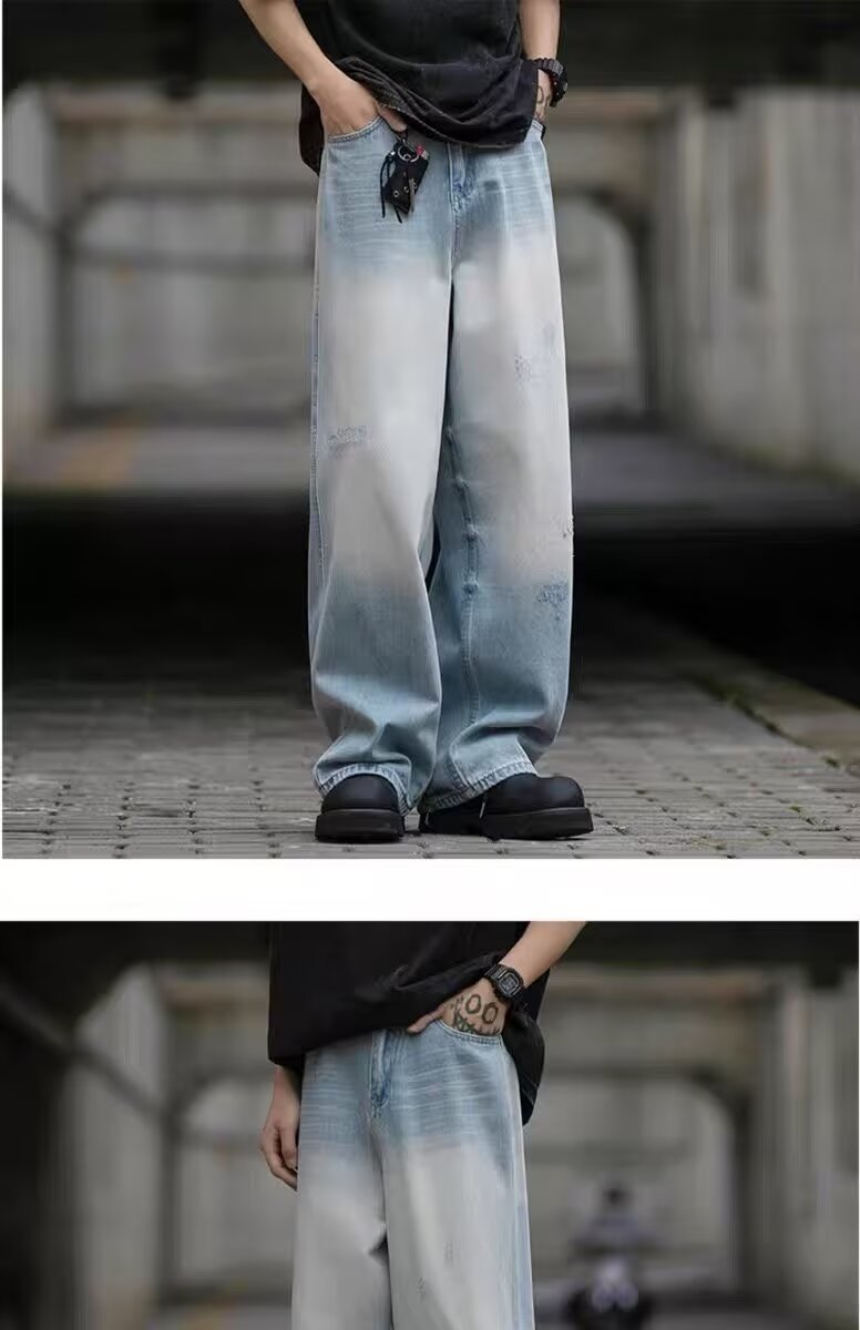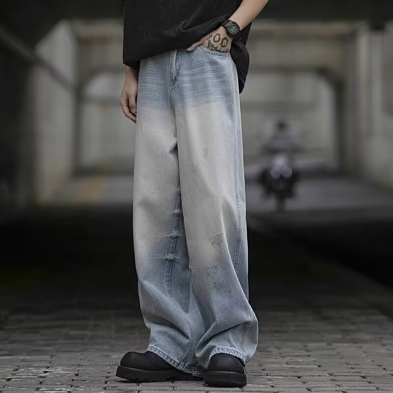씻은 오래된 청바지 남자의 가을 미국 스타일 복고풍 느슨한 넓은 다리 스트레이트 바지