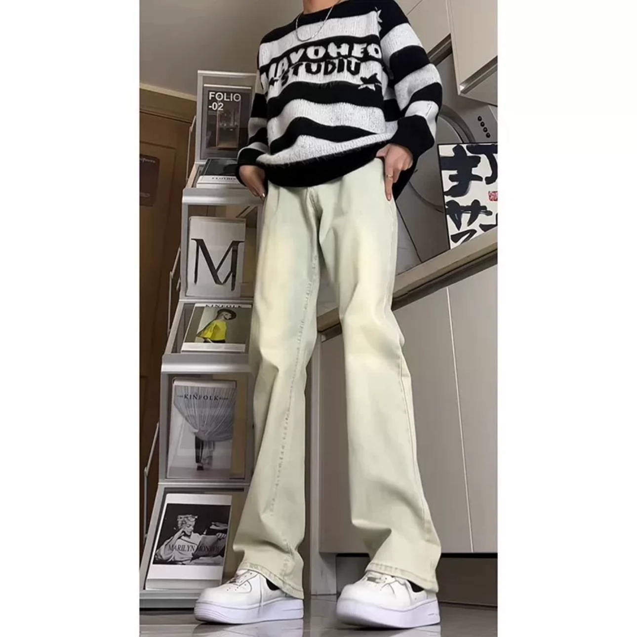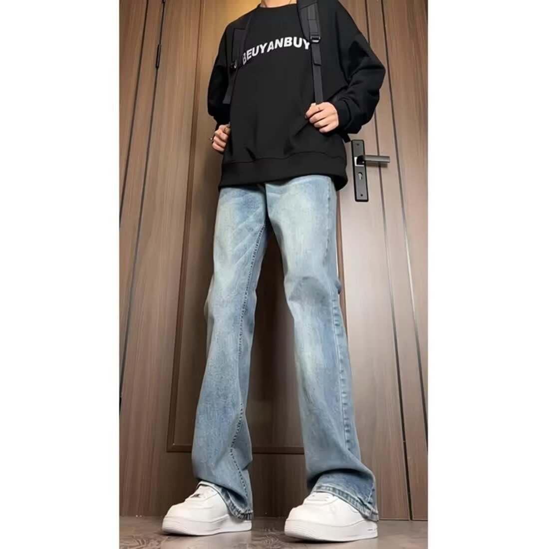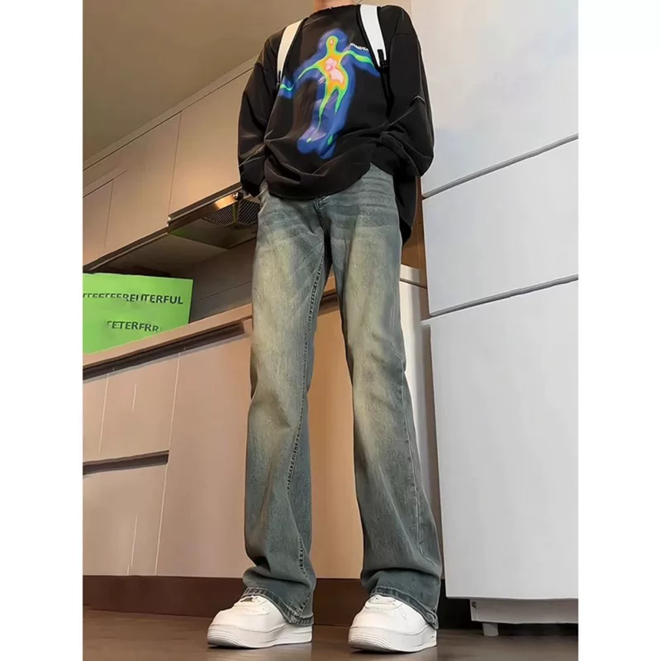 빈티지 블루 하이 허리 청바지 남성 가을 아메리칸 스타일 하이 스트리트 바이브 바지 키가 큰 슬림 핏 스트레이트 바지스토어 가기