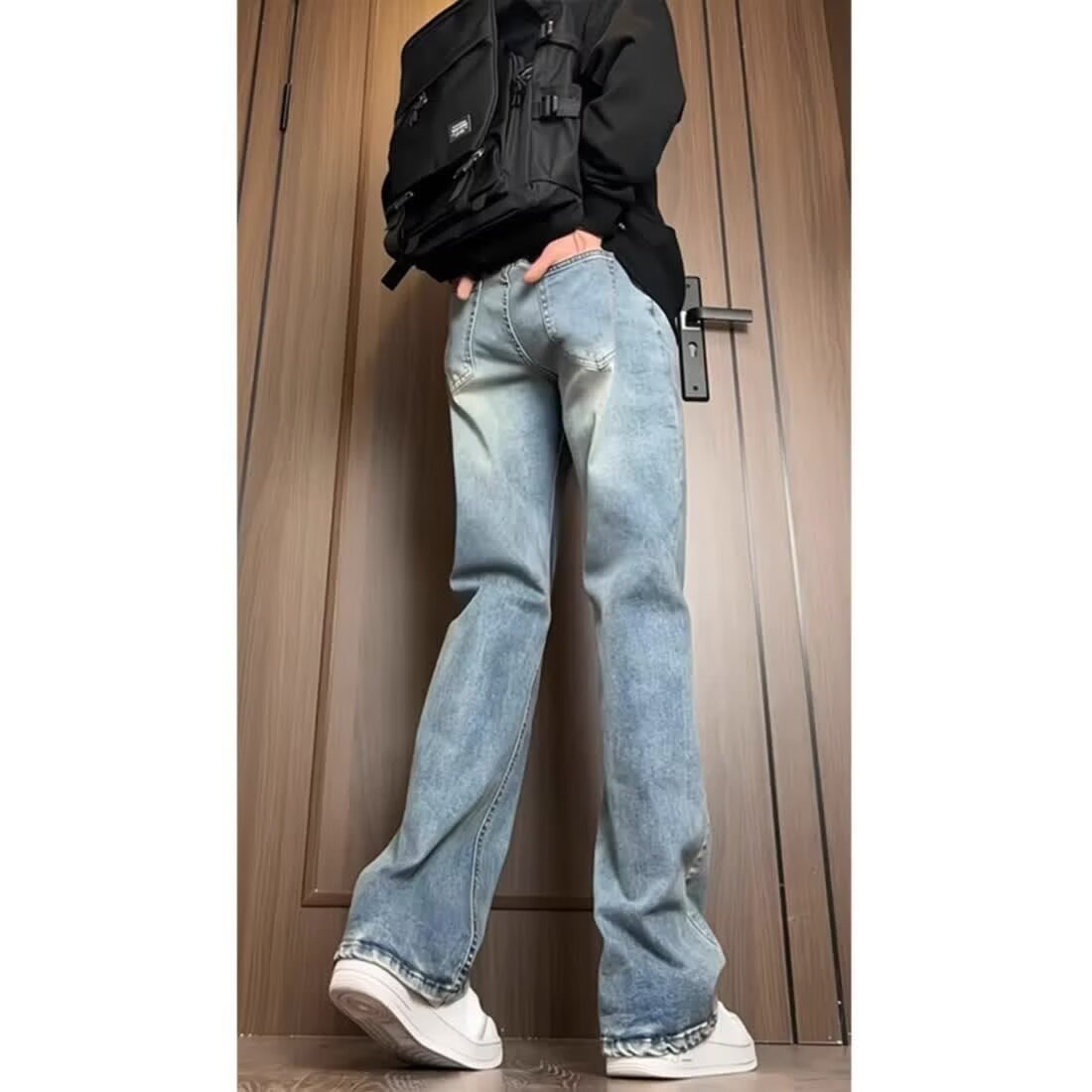빈티지 블루 하이 허리 청바지 남성 가을 아메리칸 스타일 하이 스트리트 바이브 바지 키가 큰 슬림 핏 스트레이트 바지