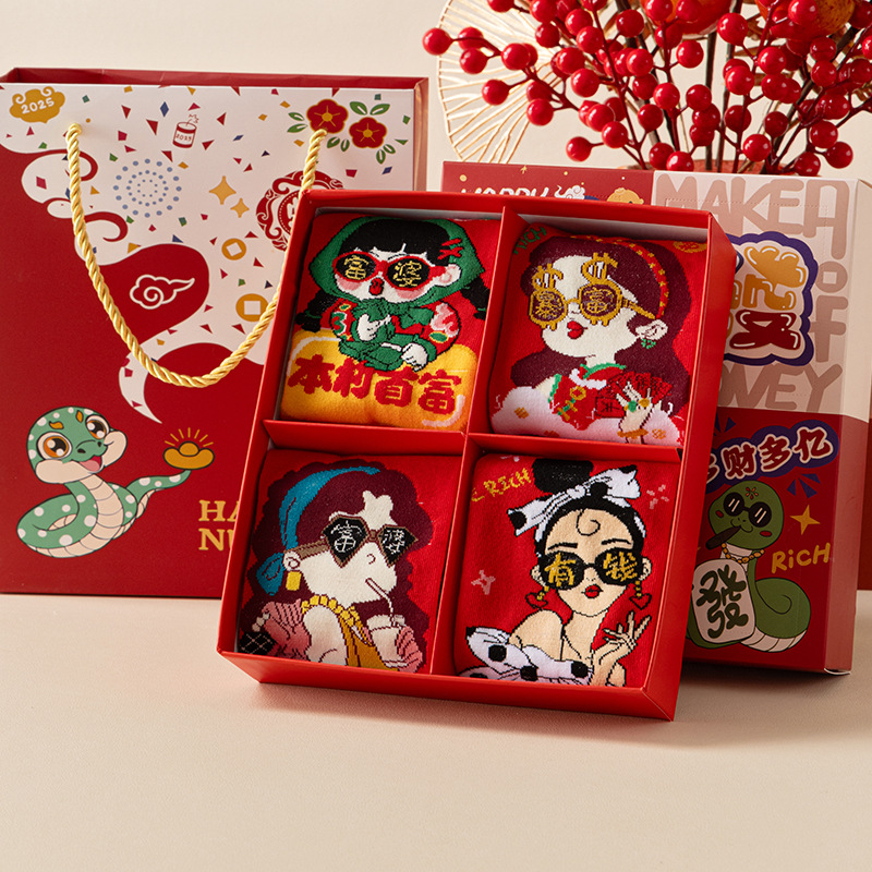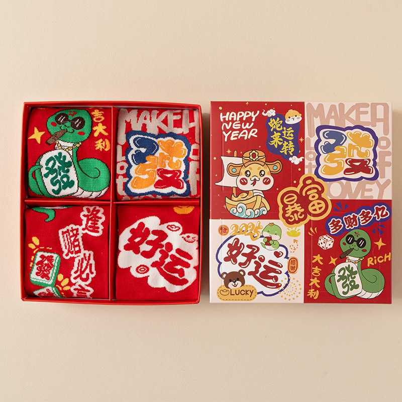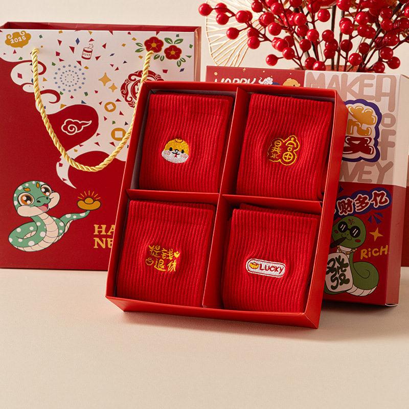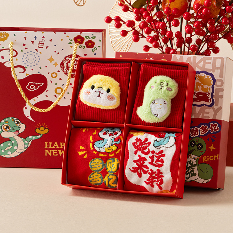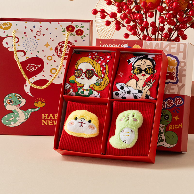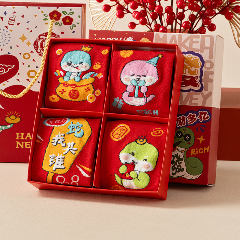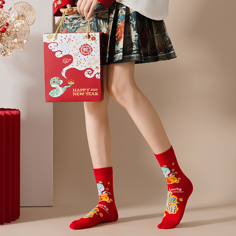 2025 년 뱀 새해 양말 선물 올해 빨간 양말 여성 뱀이 선물 상자 남자의 큰 빨간 튜브 양말을 실행합니다