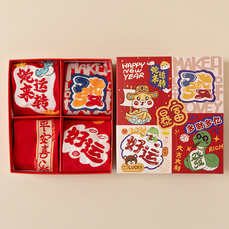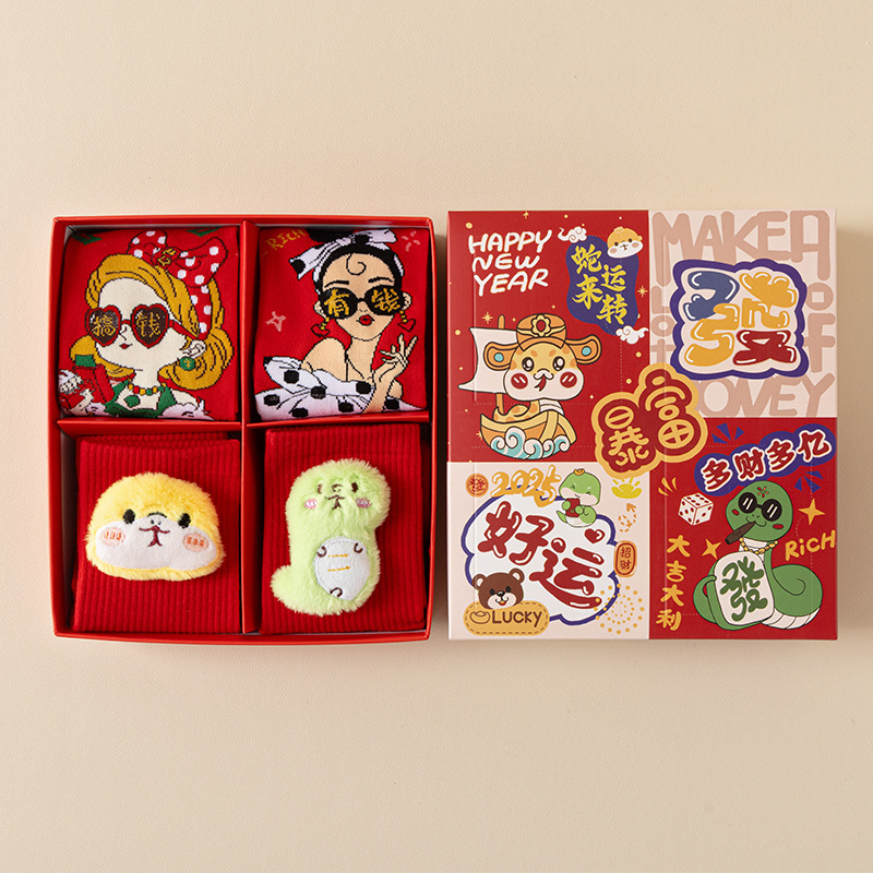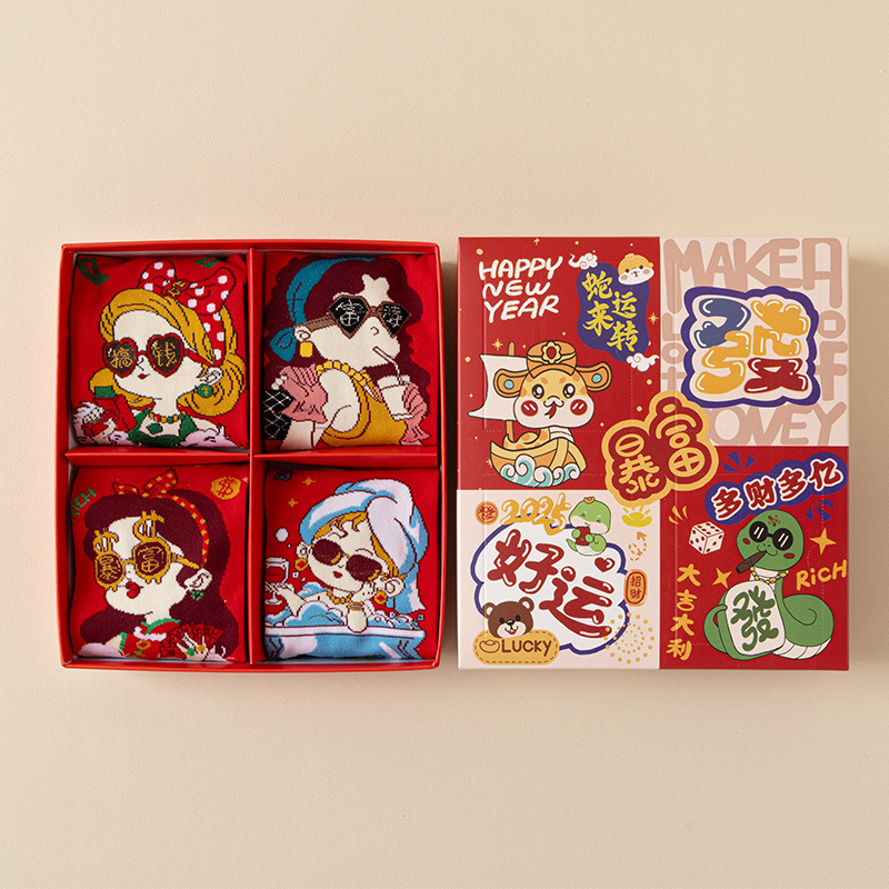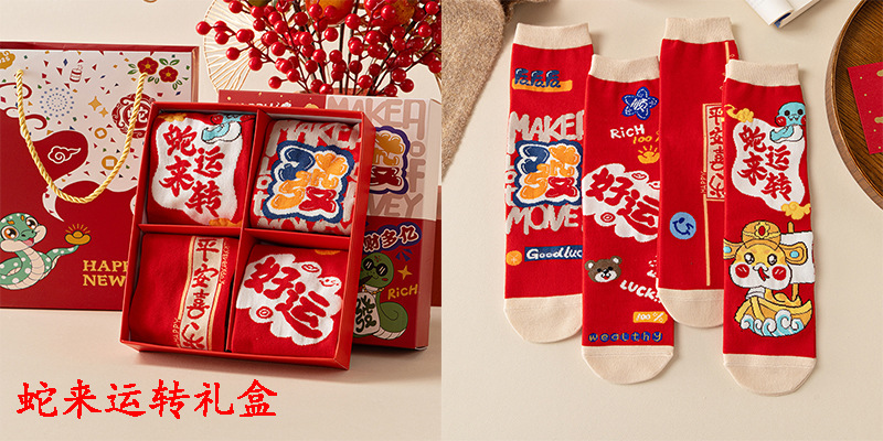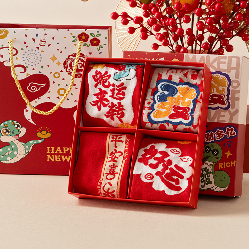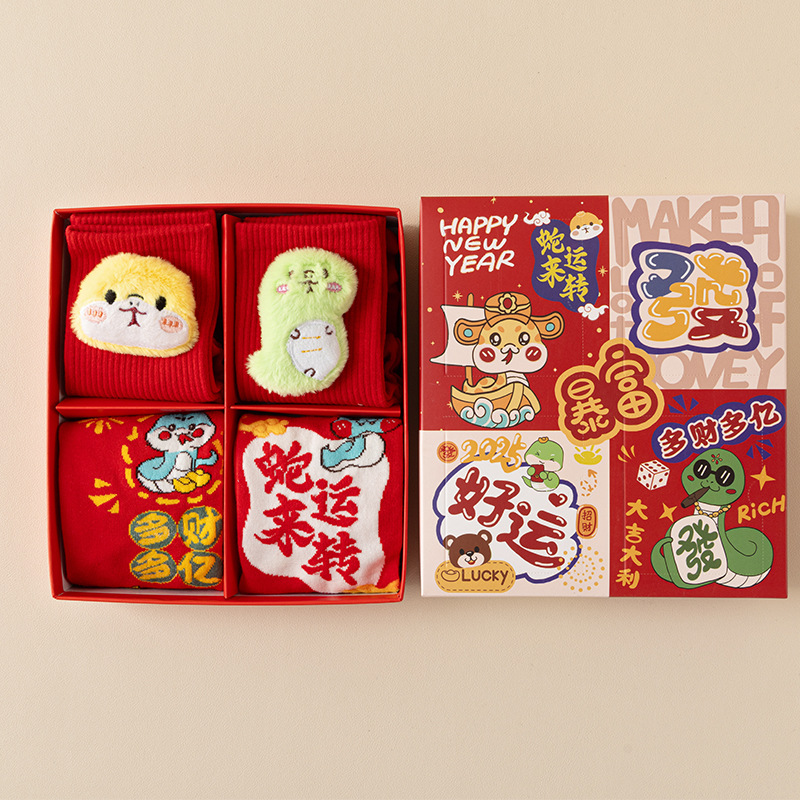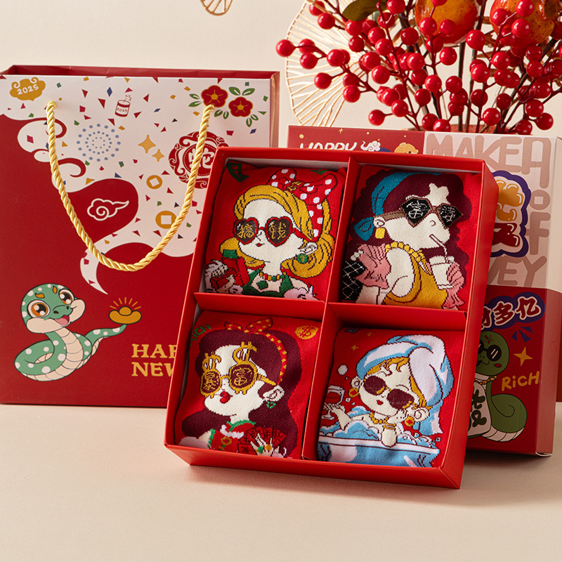 2025 년 뱀 새해 양말 선물 올해 빨간 양말 여성 뱀이 선물 상자 남자의 큰 빨간 튜브 양말을 실행합니다