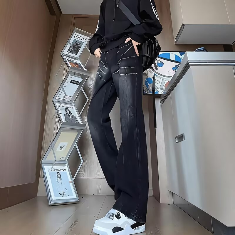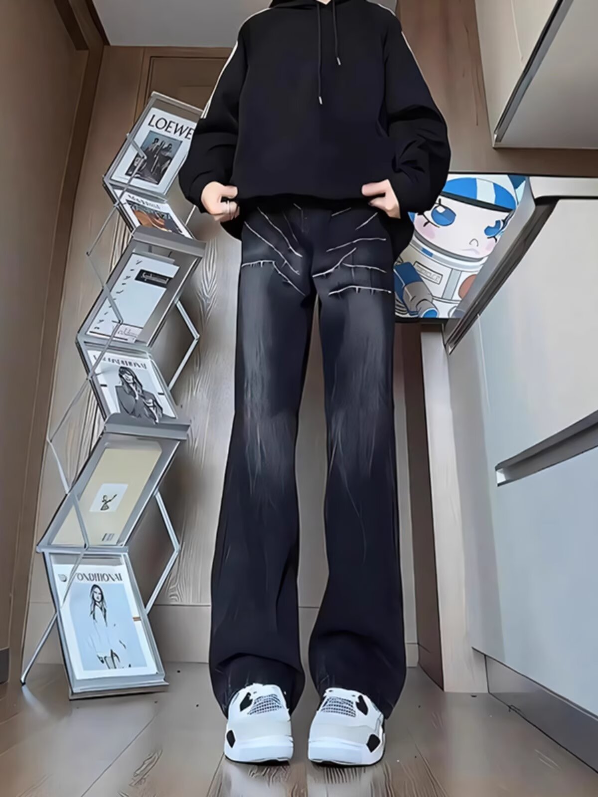 레트로 블루 하이 허리 하이 엔드 버스트 라이트닝 패턴 청바지 곧은 정사이즈 새 봄과 가을 씻은 유행 마이크로 총알 중간 허리스토어 가기