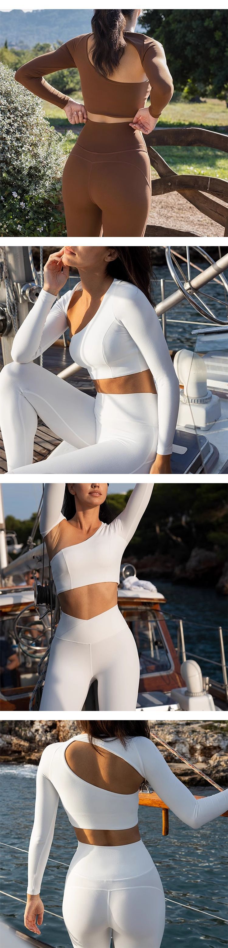 크로스보더 유럽 및 미국 스타일 섹시한 불규칙한 컷아웃 탑 요가 긴팔 여성 오프숄더 필라테스 피트니스 스포츠 요가복