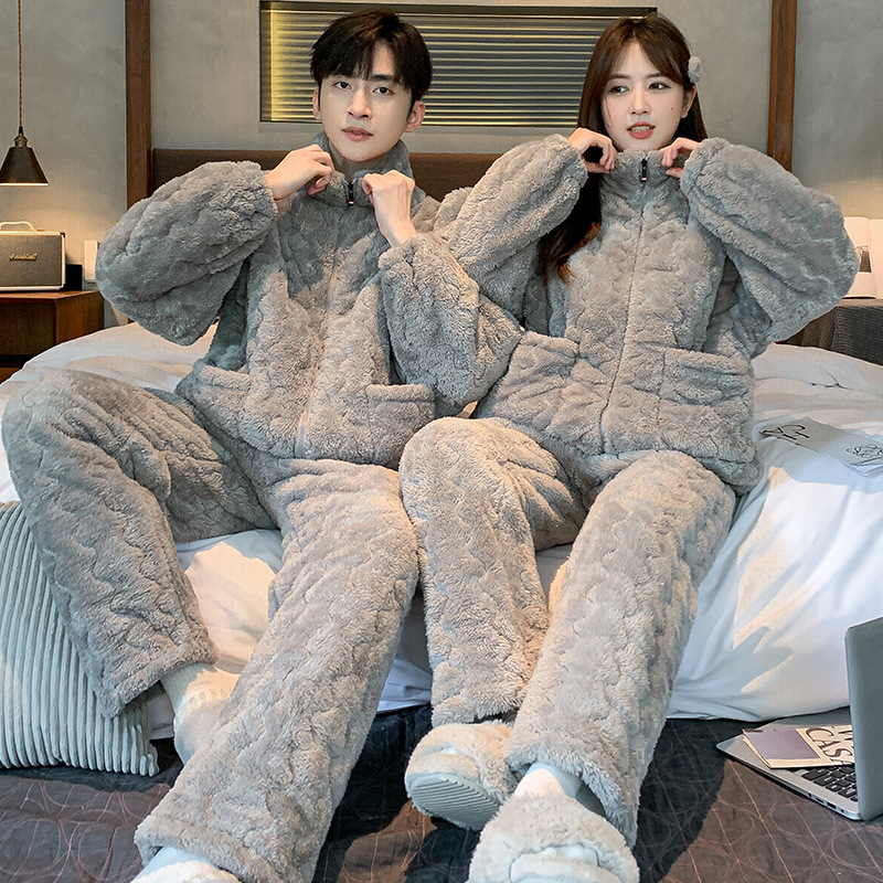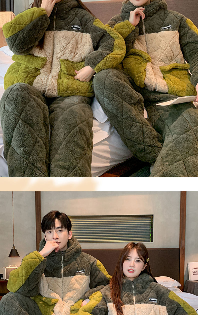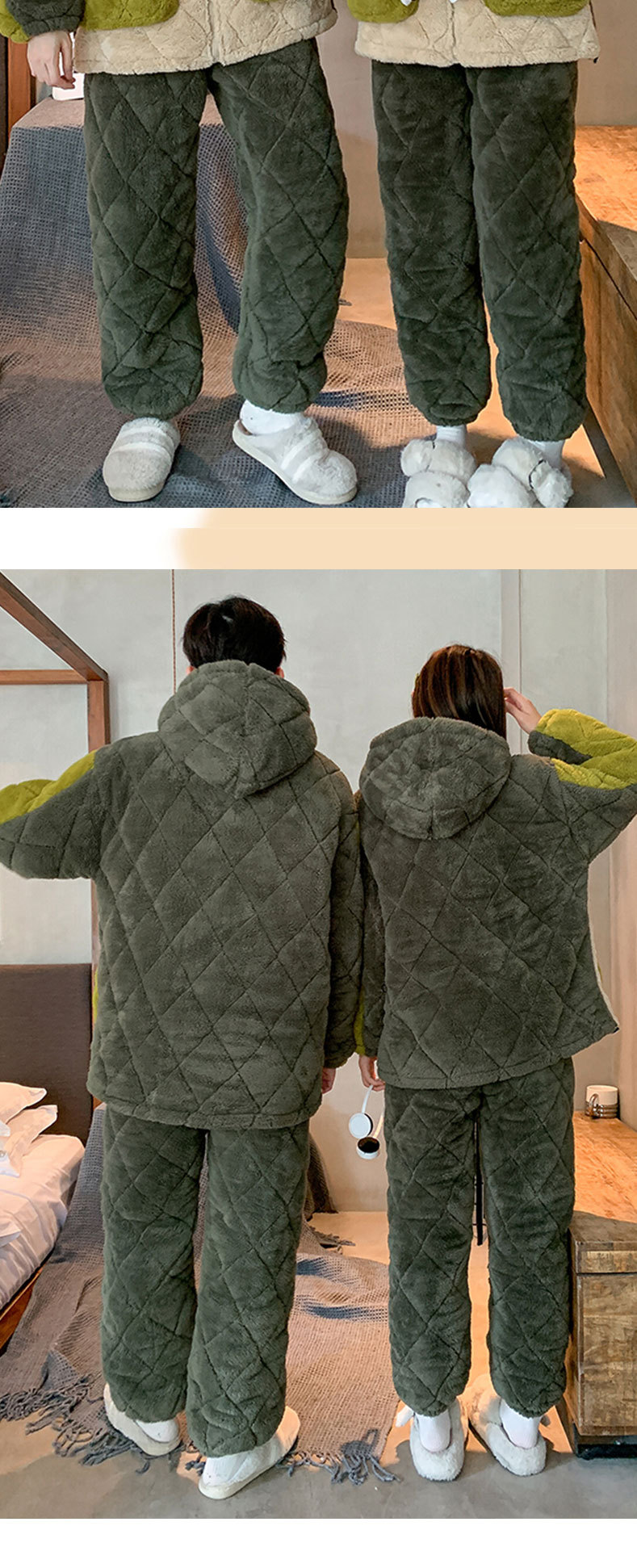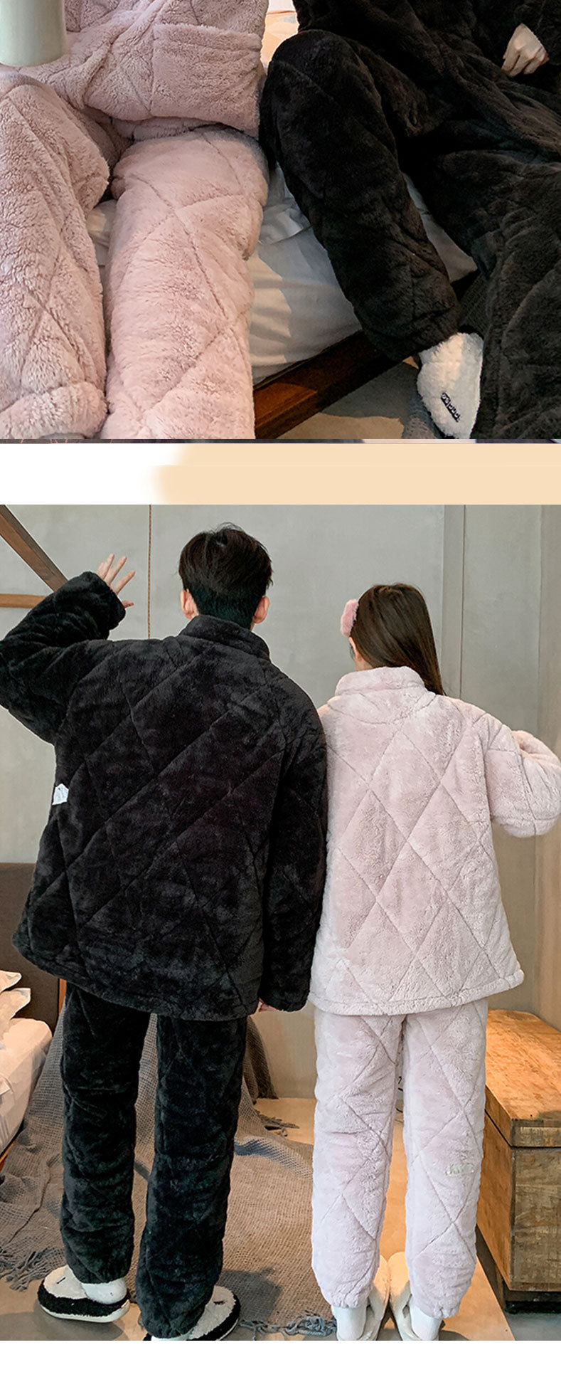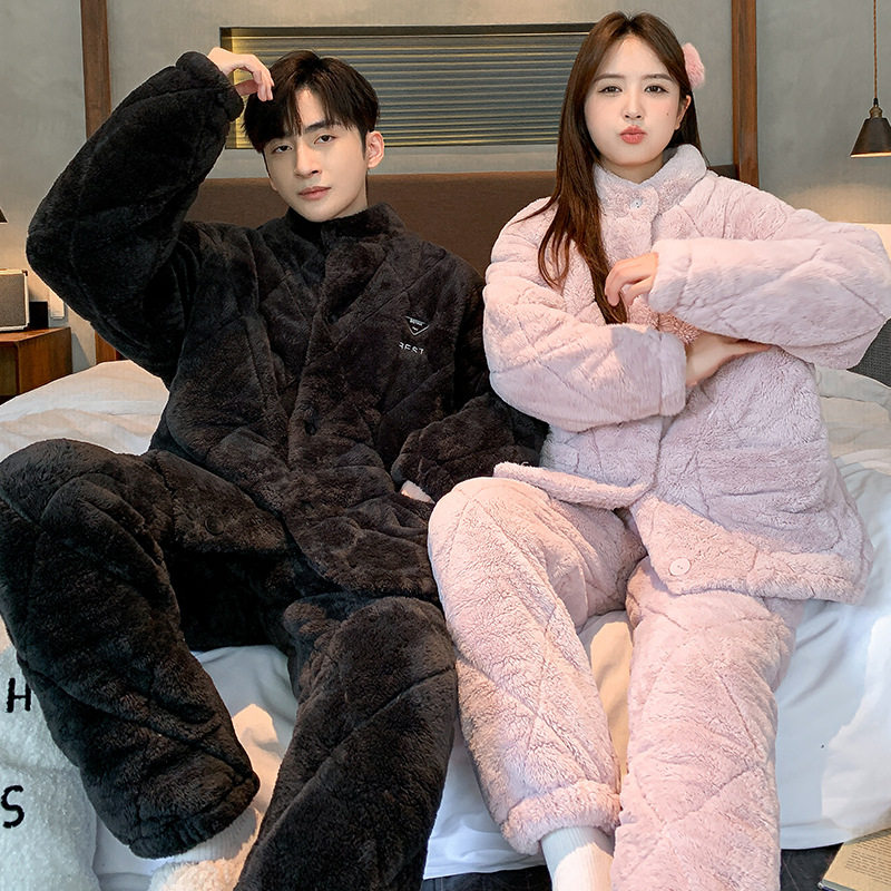 커플 잠옷 여성의 겨울 3 층 퀼트 산호 양털 기모 두꺼운 따뜻한 남자 홈 옷 면 재킷 세트