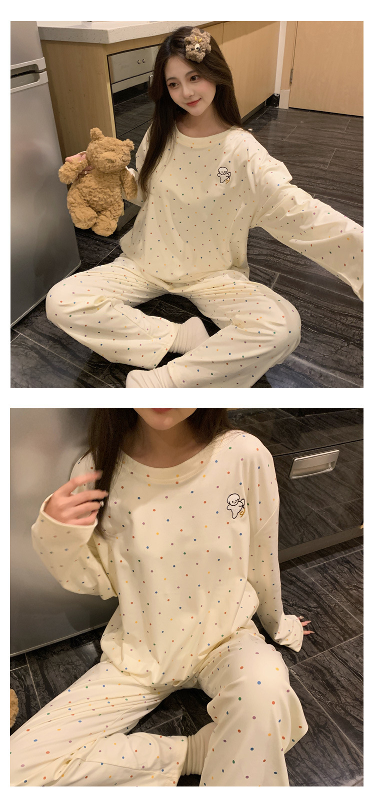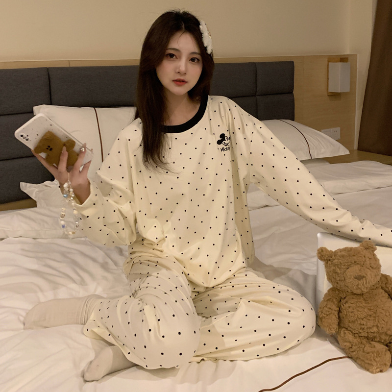 독일 벨벳 따뜻한 잠옷 여성의 봄과 가을 새로운 물방울 무늬 만화 소녀 18 세 중학생 일본식 가정 옷 겨울스토어 가기