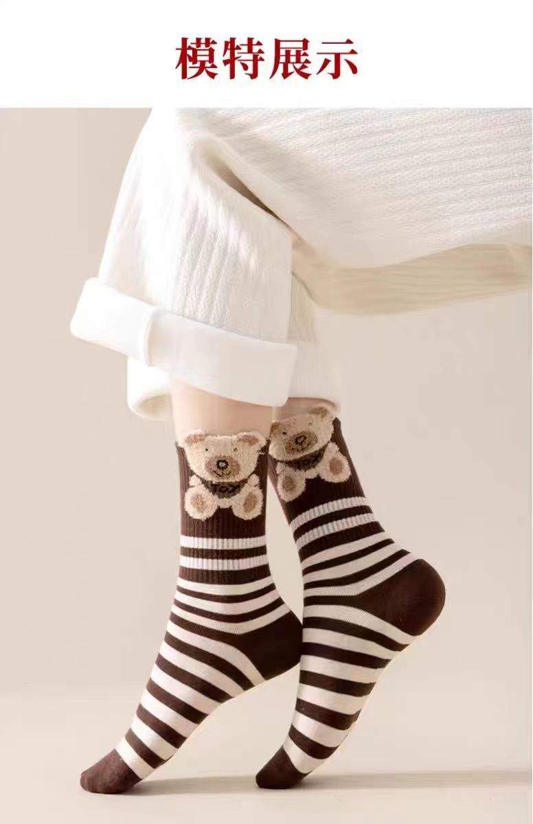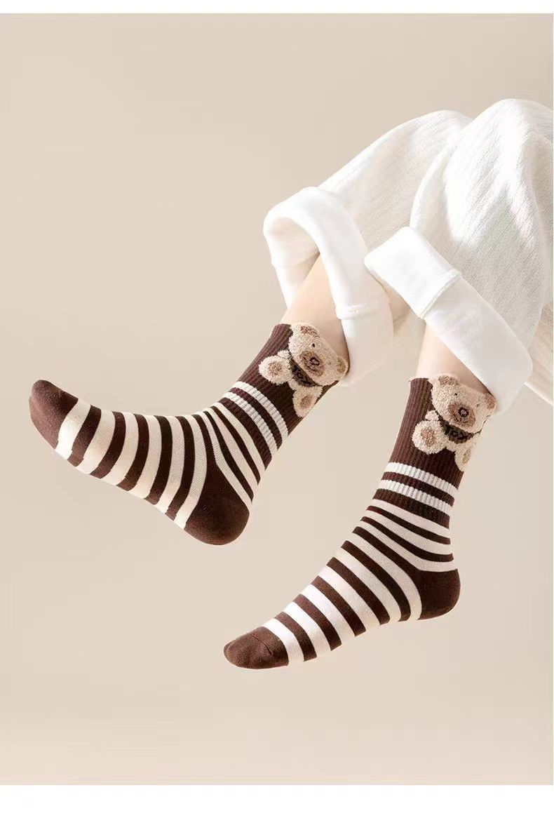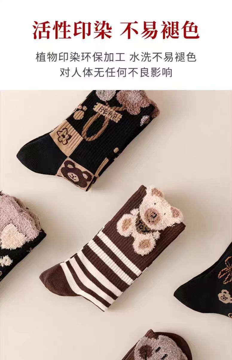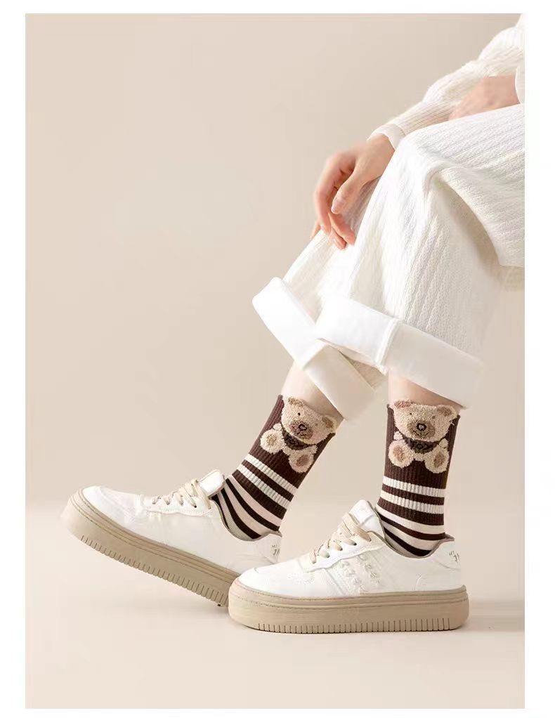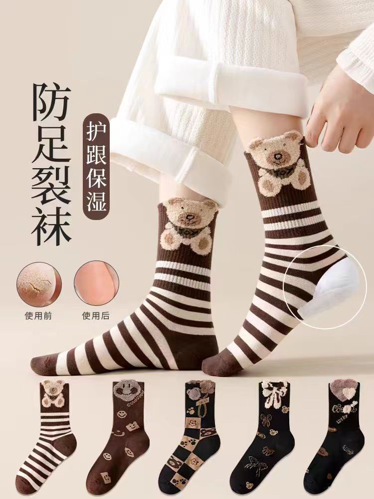 발 뒤꿈치 안티 크랙 양말 어린이 중간 길이 양말 Ins 올 매치 일본-한국 스타일 긴 깃털 원사 발 균열 양말 만화 곰