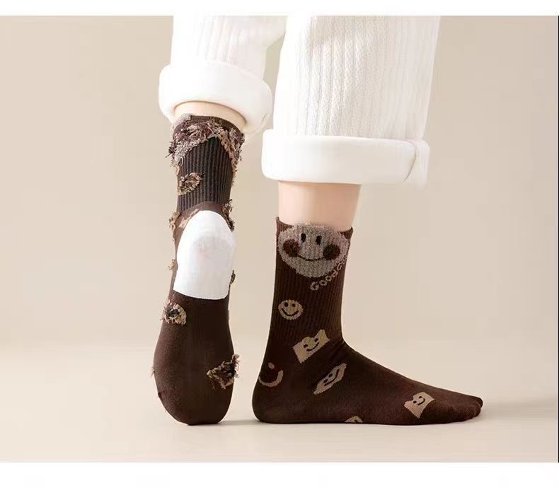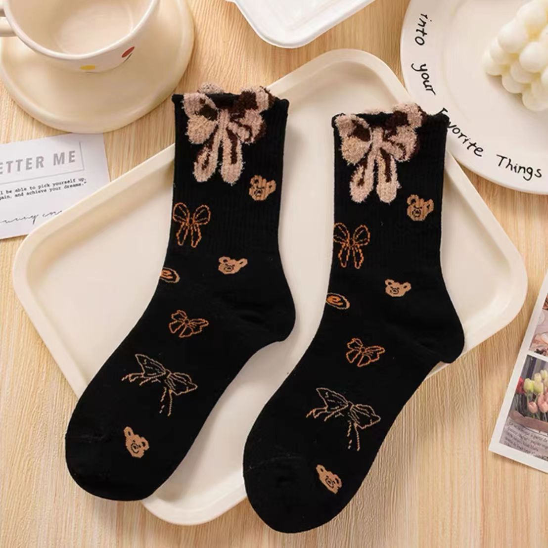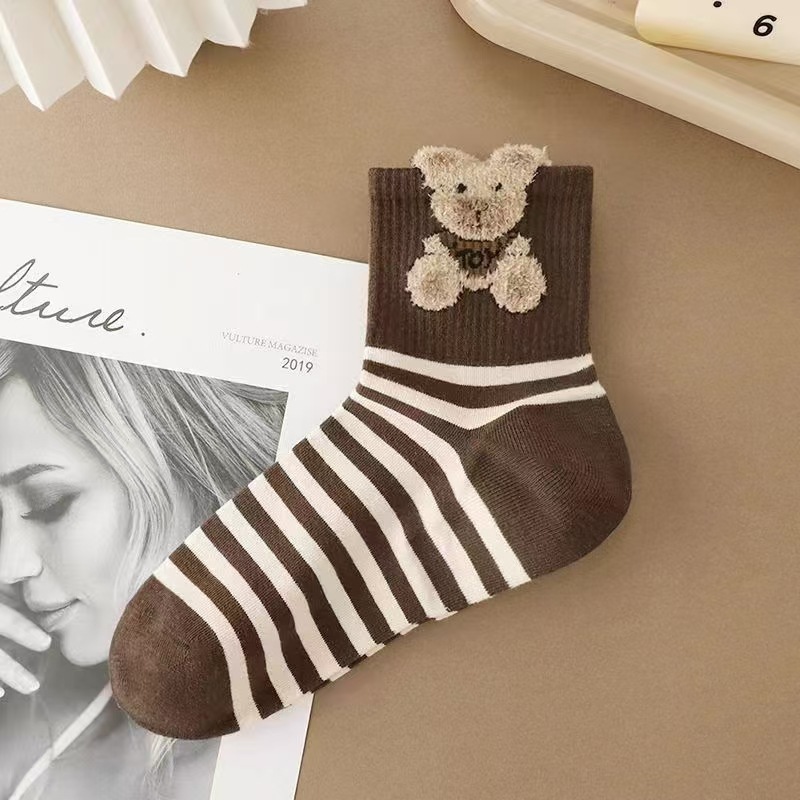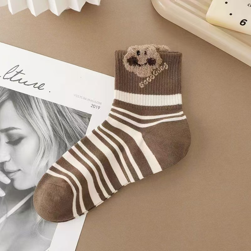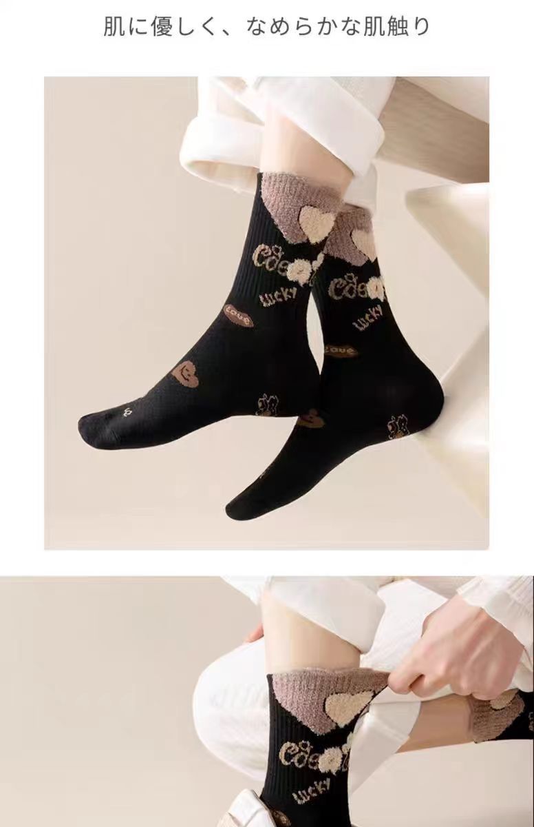 발 뒤꿈치 안티 크랙 양말 어린이 중간 길이 양말 Ins 올 매치 일본-한국 스타일 긴 깃털 원사 발 균열 양말 만화 곰