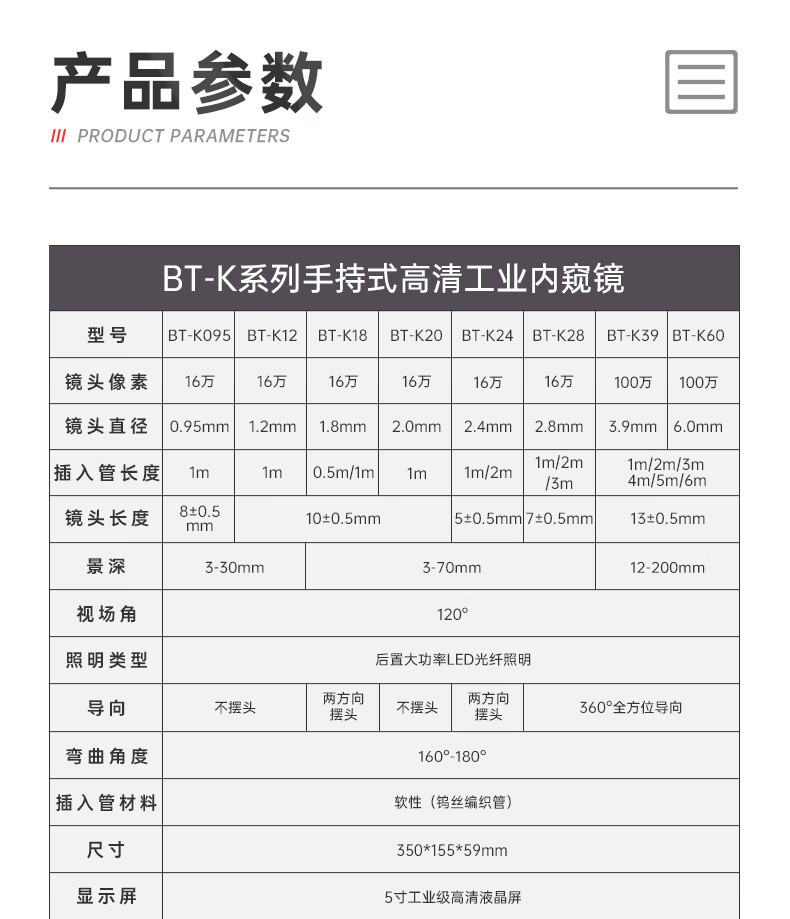 페릭 BT-K 시리즈 휴대용 범용 내시경 직접 뷰 사이드 뷰 메가 픽셀 파이프 라인 엔진 내시경
