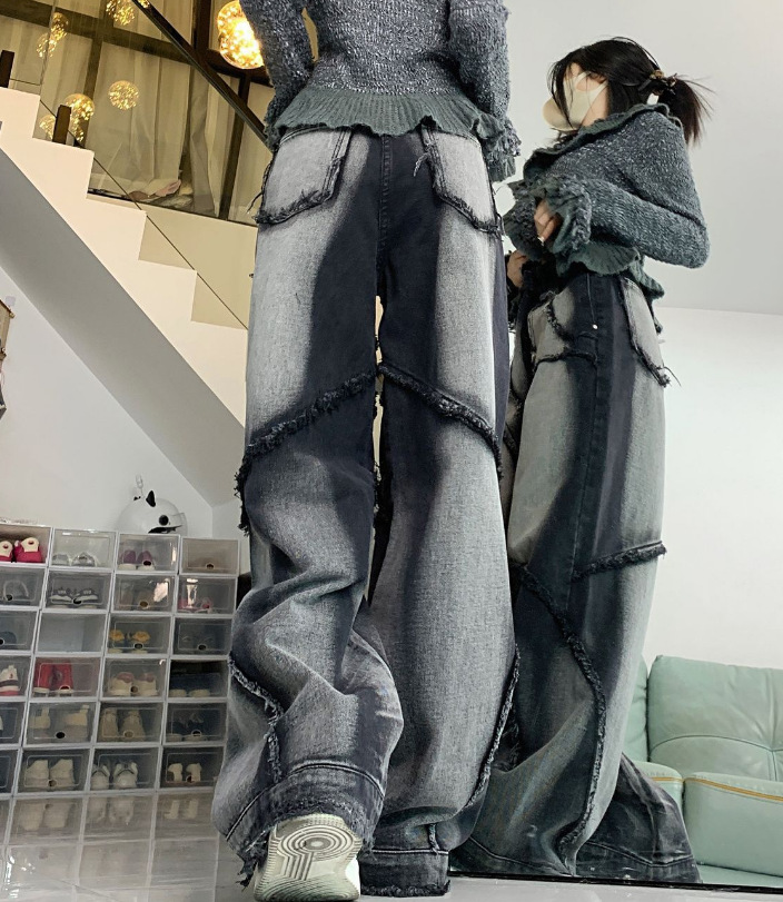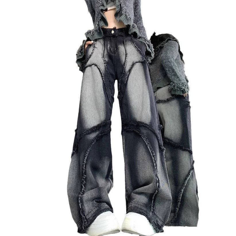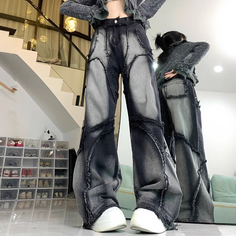 미국식 레트로 스티칭 청바지 여성용 다크 스타일 녹 에지 워시 바지 핫 걸스 루즈 디자인 센스 마이크로 팬츠 트렌디스토어 가기