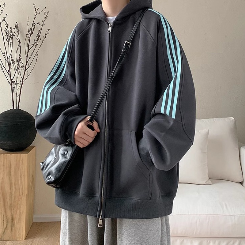 대조 컬러 사이드 스트라이프 카디건 후디 남자 가을 트렌디 올 매치 십대 느슨한 핸섬 탑 재킷